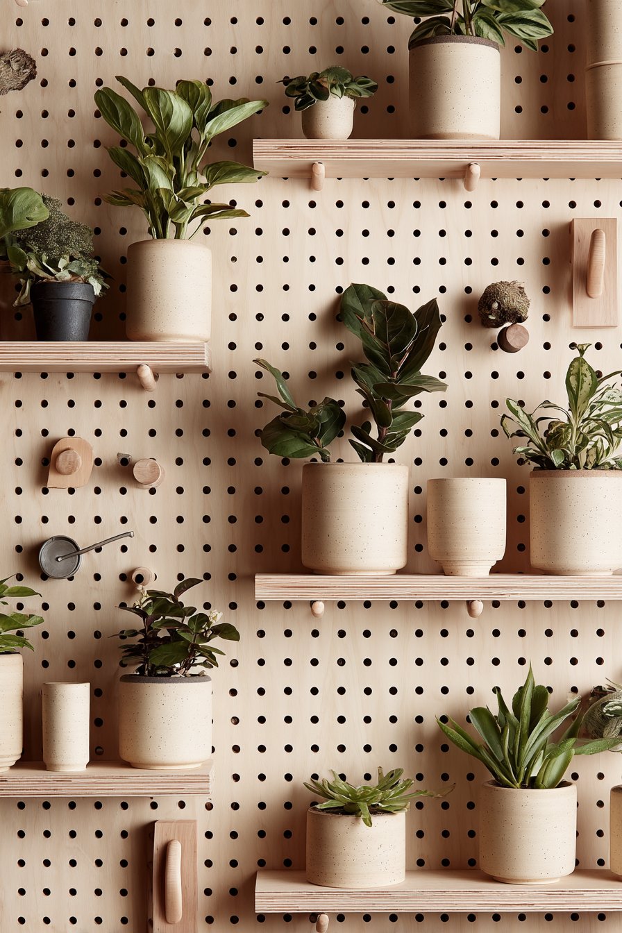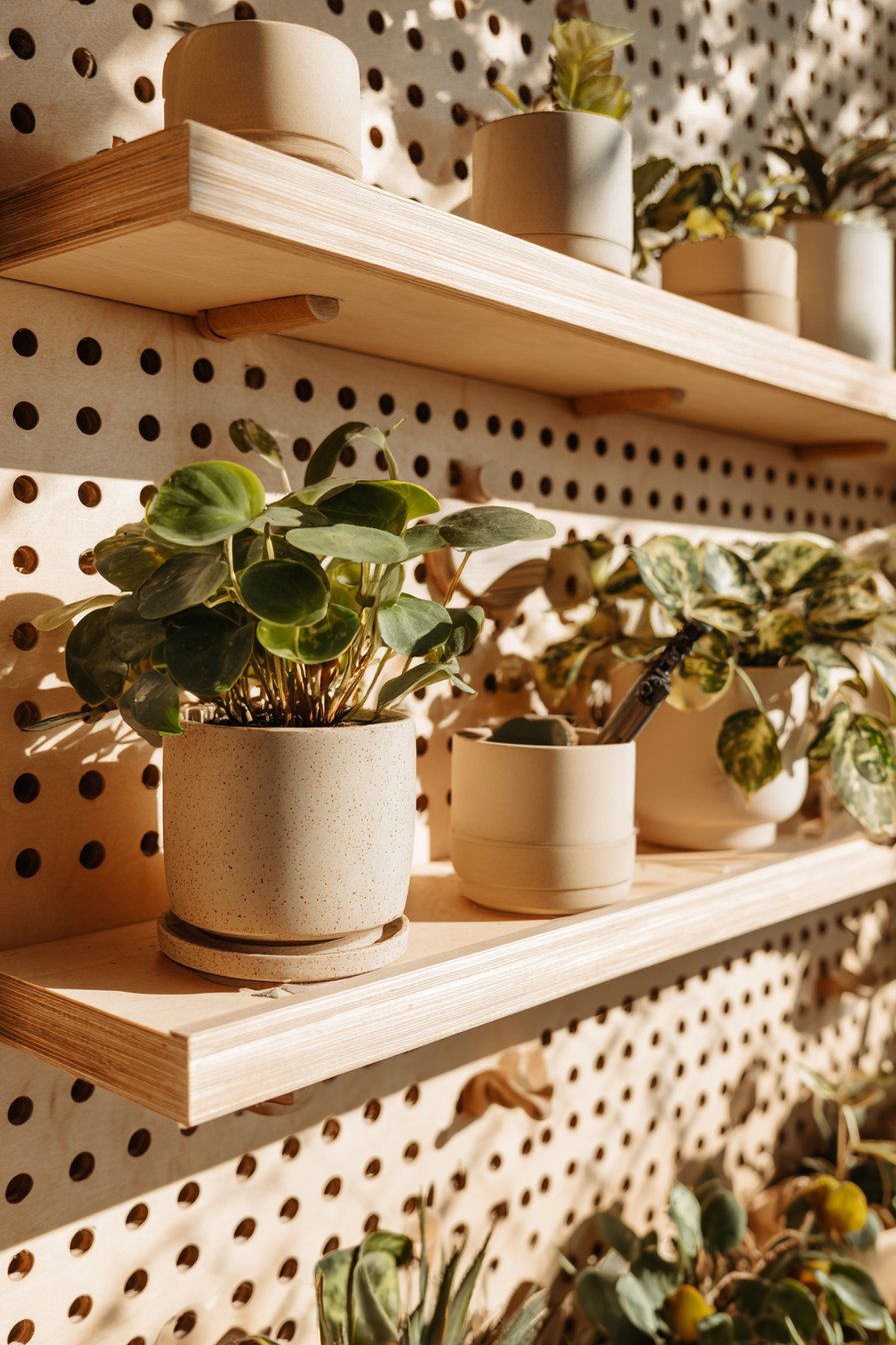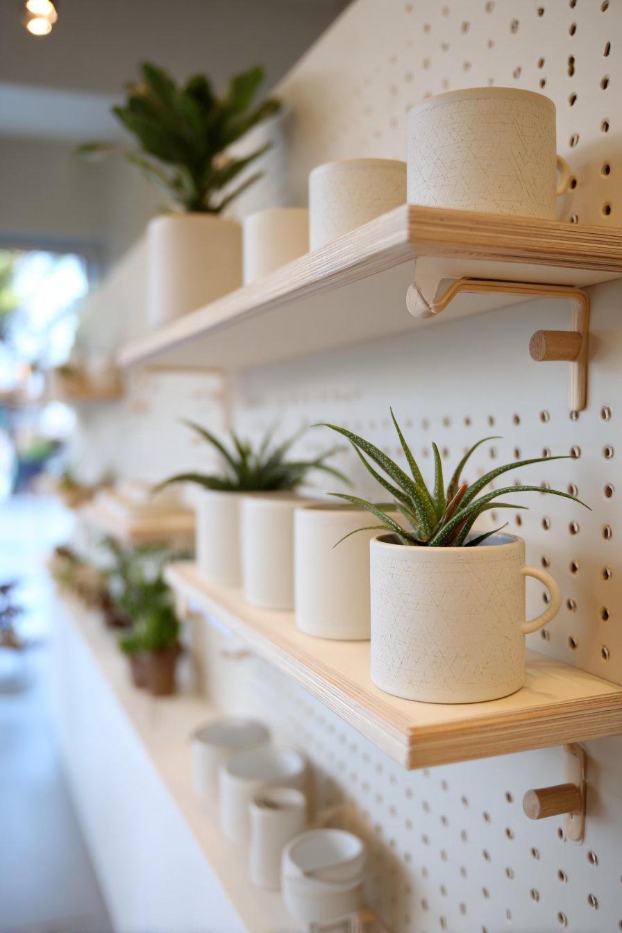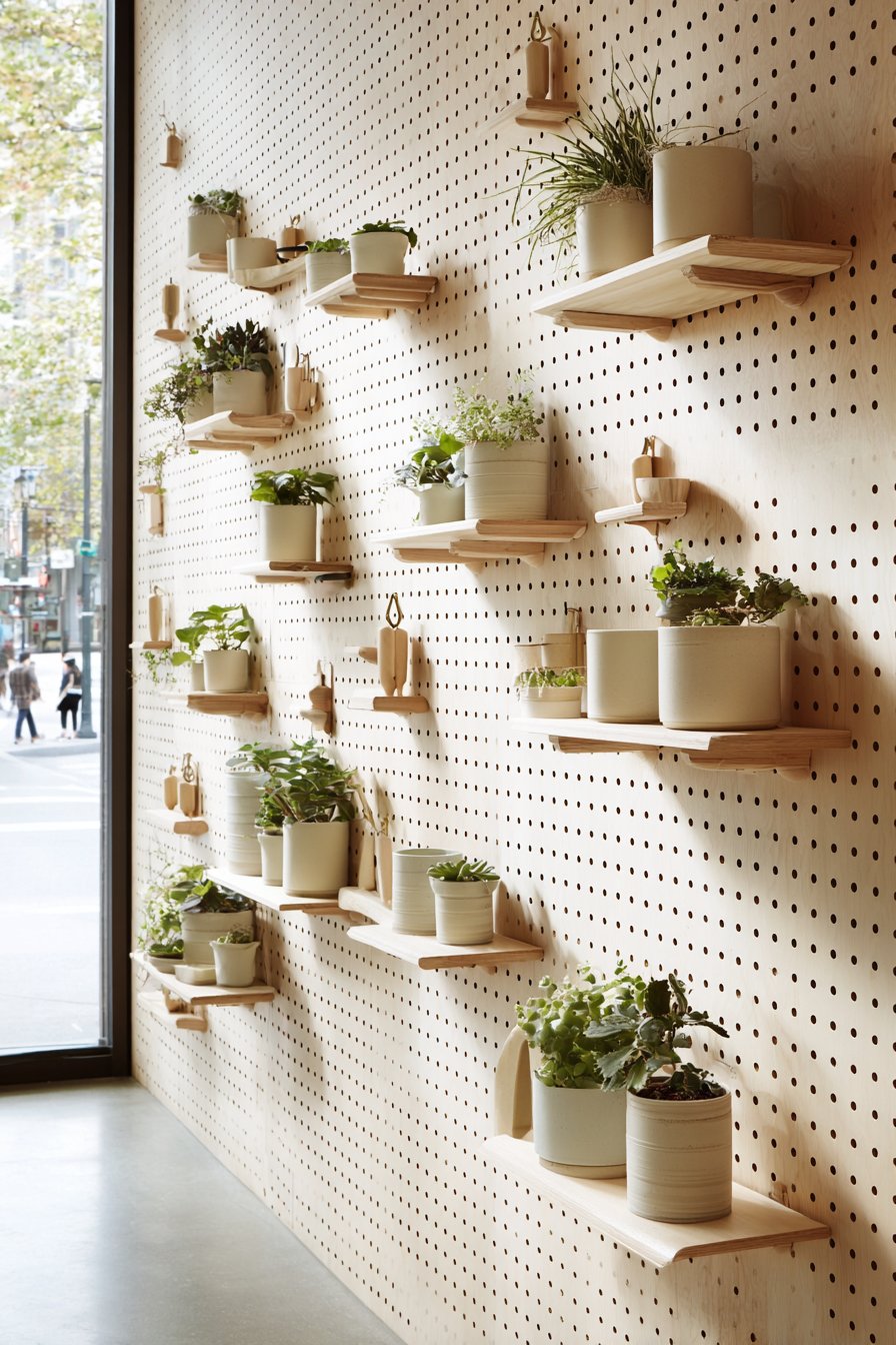 The practical benefits extend beyond mere aesthetics. Wooden pegs inserted into the board holes support not just shelves but also hooks for hanging planters, small tools, and gardening accessories. This integrated approach creates a plant care station where everything needed for maintenance lives in one accessible location. Small hand pruners hang from one hook, a decorative watering can from another. Favorite plant mister bottles find homes alongside coiled twine for training climbing plants. This visible storage transforms plant care from chore to ritual by making tools beautiful objects worthy of display rather than items hidden in cluttered drawers or garage corners. The natural birch wood brings warmth without darkness, its pale tone maintaining the airy spaciousness that defines Scandinavian interiors even when the pegboard is fully utilized.