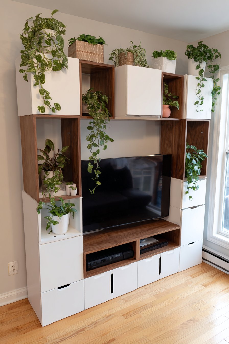 Challenging the notion that technology and nature must remain separate, an entertainment center with integrated plant shelving creates an indoor plant shelf idea that brings organic life to media-focused furniture. This custom built-in cabinetry surrounds a wall-mounted television with thoughtfully designed compartments specifically intended for plant display. The rich walnut wood provides sophisticated warmth while the combination of closed storage below and open shelving alongside the screen creates visual balance. This design acknowledges modern reality—most living rooms organize around television viewing—while refusing to let that technology dominate the space aesthetically. The flanking plant shelves create symmetry and natural framing that softens the screen’s hard edges and black surface, making the television feel like an integrated element rather than a technological intrusion into carefully designed interiors.