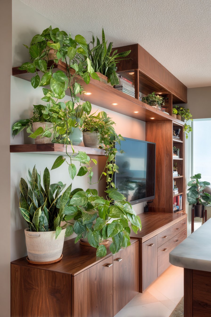 The plant selection addresses the unique challenges of this location: plants must tolerate the variable light conditions created by television viewing (sometimes dark, sometimes bright from windows, occasionally illuminated by screen glow), handle temperature fluctuations from electronic equipment, and maintain attractive appearance from the primary viewing position—the sofa. Trailing pothos and philodendrons cascade gracefully from upper compartments, their flowing forms contrasting beautifully with the rectangular geometry of the cabinetry and screen. Snake plants provide vertical accents that echo the television’s upright form while requiring minimal maintenance. Rubber plants contribute substantial glossy foliage that adds weight and presence, preventing the greenery from appearing merely decorative rather than integral to the design. The plant placement ensures that even when the television is being watched, viewers’ peripheral vision includes natural elements, subtly reducing the screen-time feel through the presence of living plants.