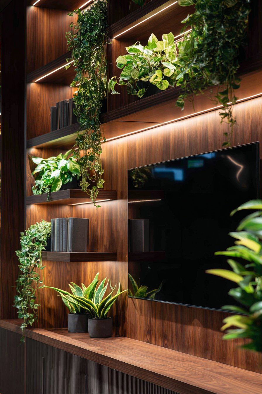 The lighting strategy serves both human and plant needs without compromising either. Ambient room lighting from table lamps and floor lamps provides evening illumination for television viewing that’s also adequate for plant health—most moderate-light houseplants can thrive in typical living room conditions supplemented by occasional natural light from nearby windows. Subtle LED strip lights installed beneath upper shelving compartments provide accent illumination that highlights the plants while creating pleasant ambient glow during movie watching. During daytime, natural light from living room windows supplements artificial lighting, ensuring plants receive adequate photosynthesis opportunities. This thoughtful integration demonstrates that technology and nature needn’t compete for attention but can coexist harmoniously in contemporary homes where both play important roles in daily life.