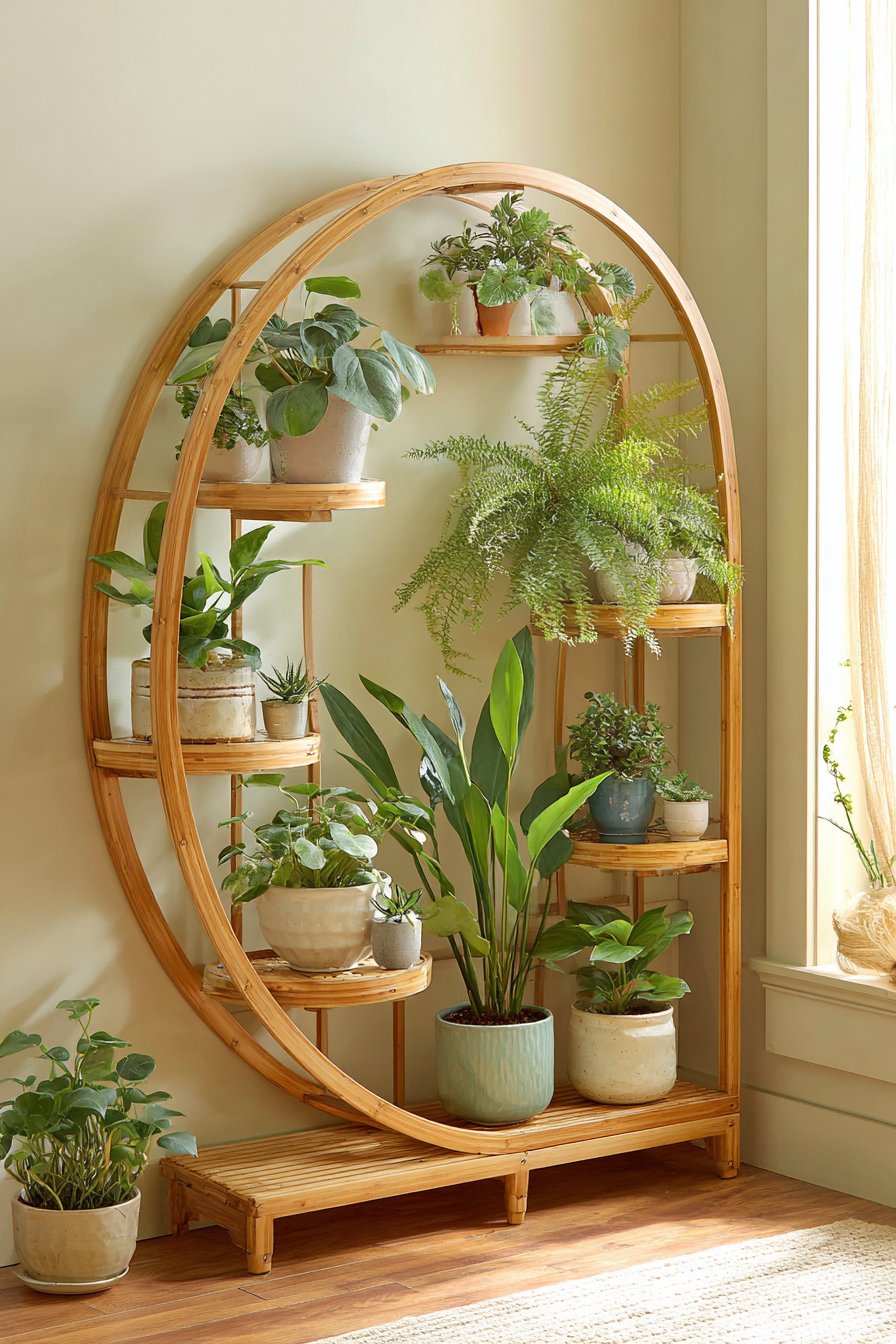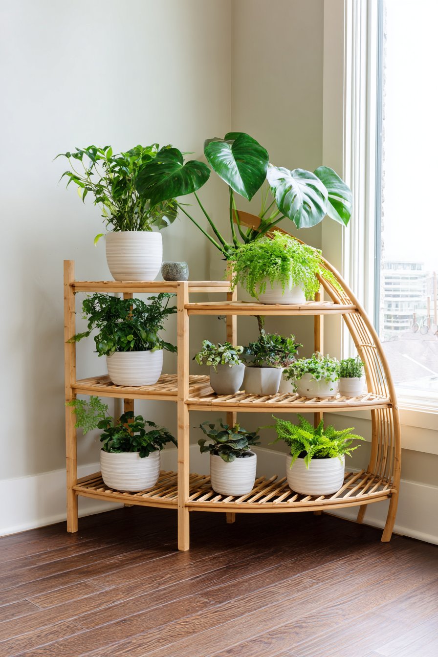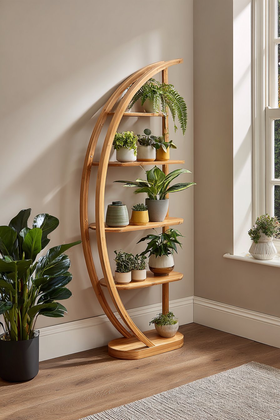 The quarter-circle design specifically addresses corner placement, a thoughtful feature that maximizes space efficiency. Corners often present design challenges—they’re difficult to furnish effectively, can feel dark and forgotten, and rarely receive optimal light. This plant stand transforms those challenges into opportunities, fitting snugly into the corner angle while its curved shelves reach outward, claiming space without blocking pathways or making rooms feel cramped. The stand works particularly well in rooms with minimalist aesthetics where its clean lines and natural materials align with principles of simplicity and connection to nature. Side lighting from adjacent windows creates interesting shadows and highlights across the curved shelves and varied plant forms, the shifting light throughout the day adding dynamic visual interest to what might otherwise be static furniture.