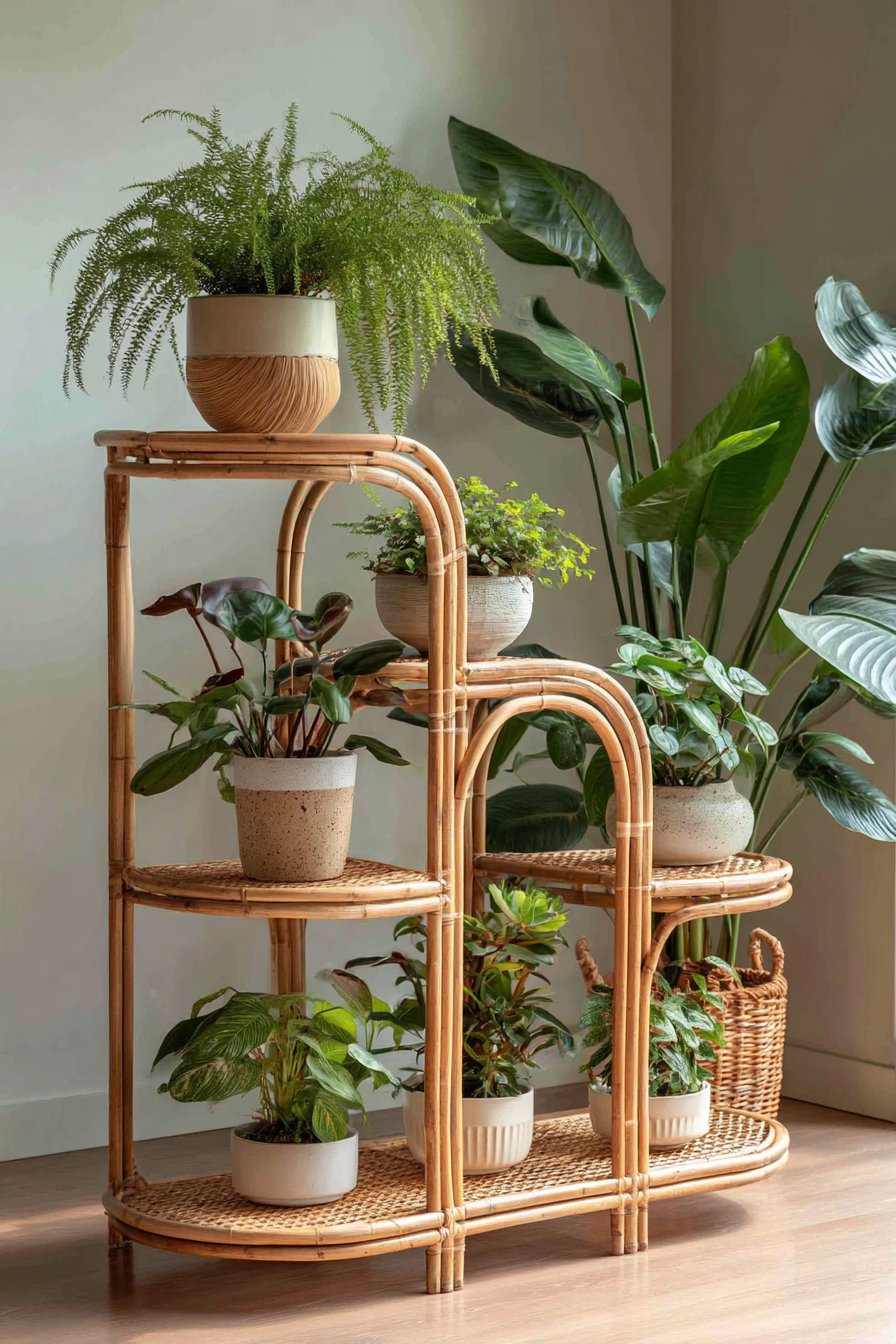 The magic of this arrangement lies in its apparent effortlessness, though achieving this “collected over time” aesthetic actually requires thoughtful curation. Mismatched terracotta pots in various sizes mingle with hand-painted ceramics and woven baskets, each container adding its own personality to the display. Macramé plant hangers suspended from the upper rungs introduce vertical interest and additional textural layers, their handcrafted knots and natural cotton fibers perfectly aligned with the bohemian ethos. The interplay of textures—smooth leaves against rough wood, soft macramé against hard ceramic—creates a sensory richness that invites closer inspection.