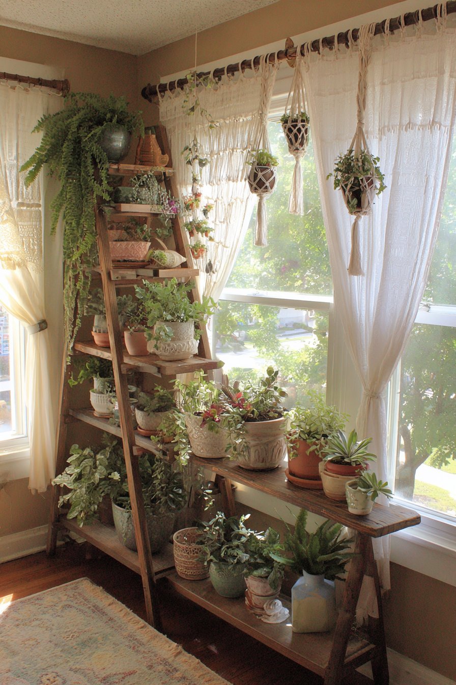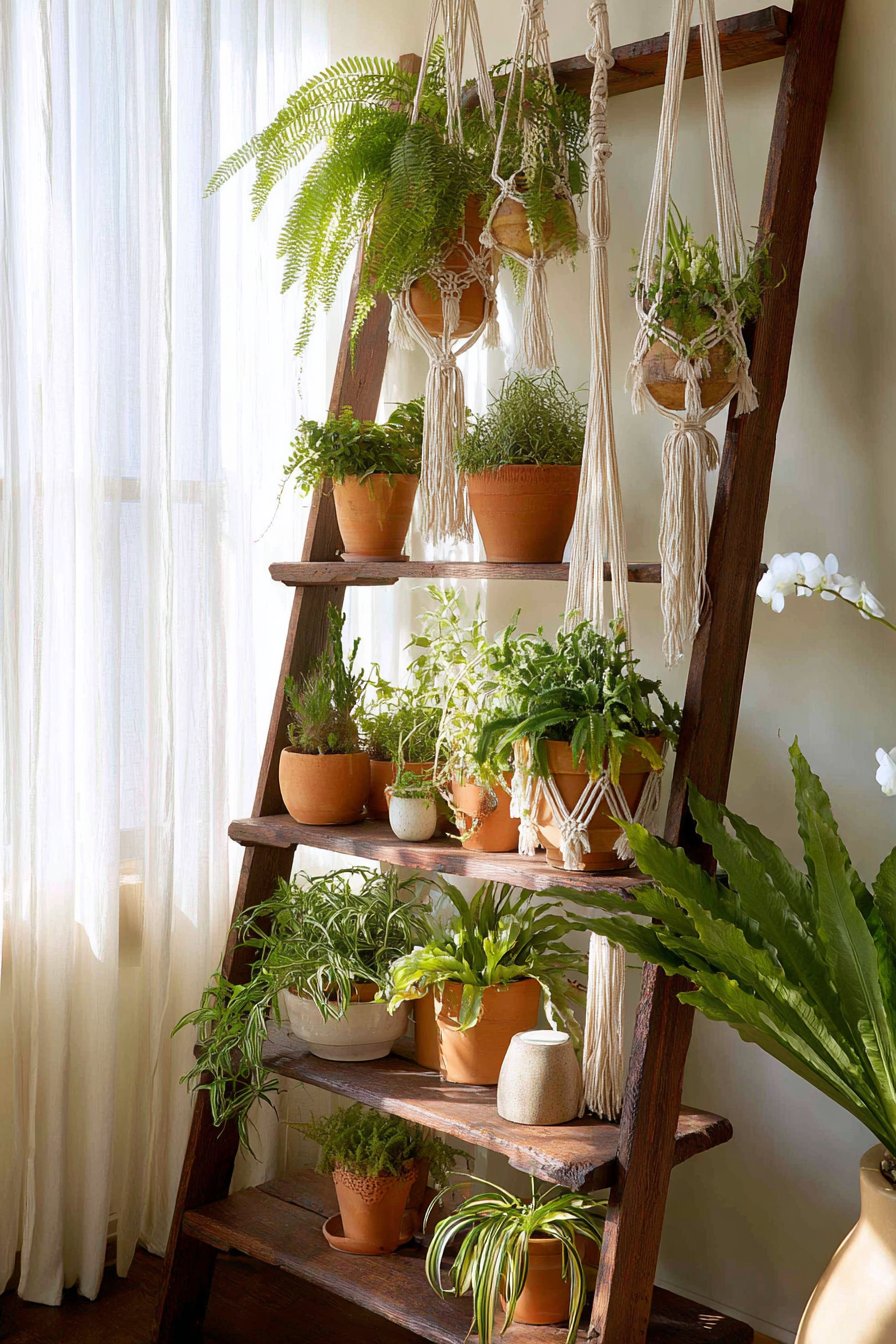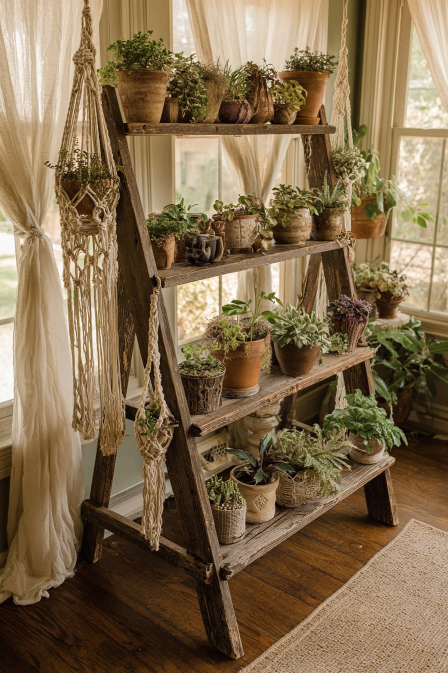 - Add macramé hangers to upper rungs to maximize vertical space and introduce handcrafted texture