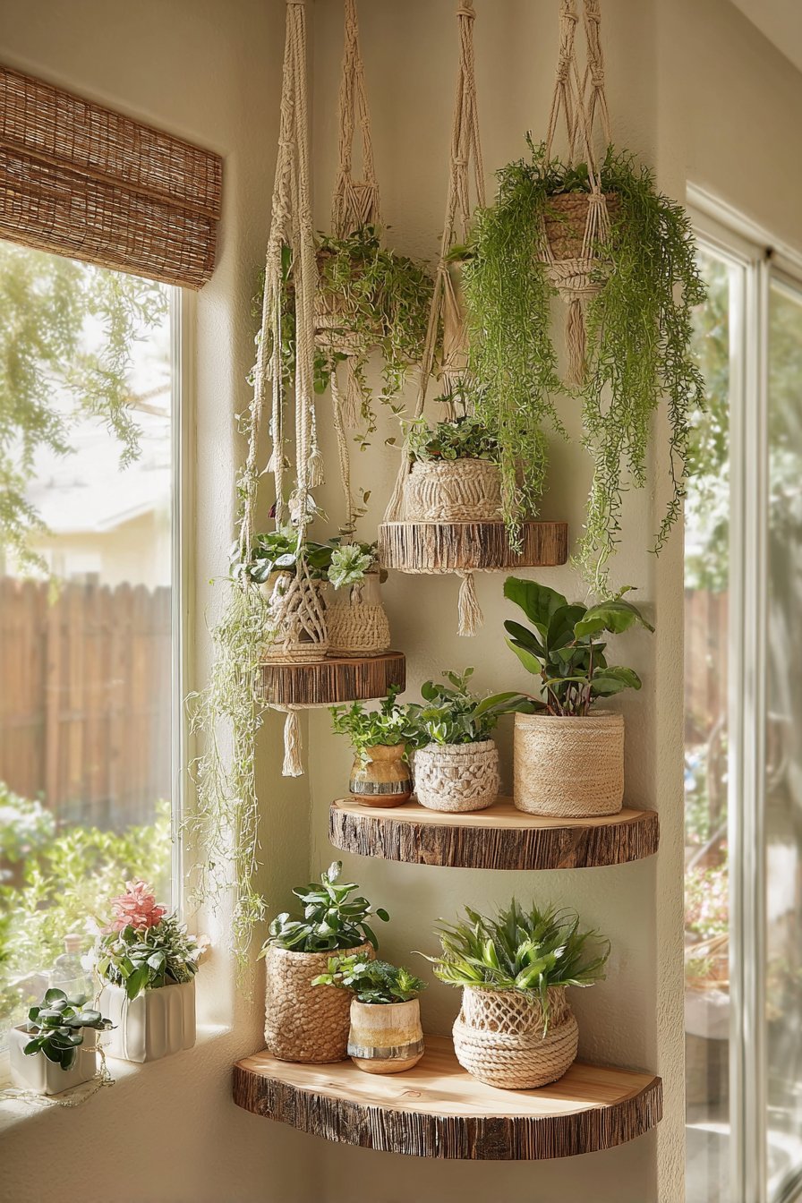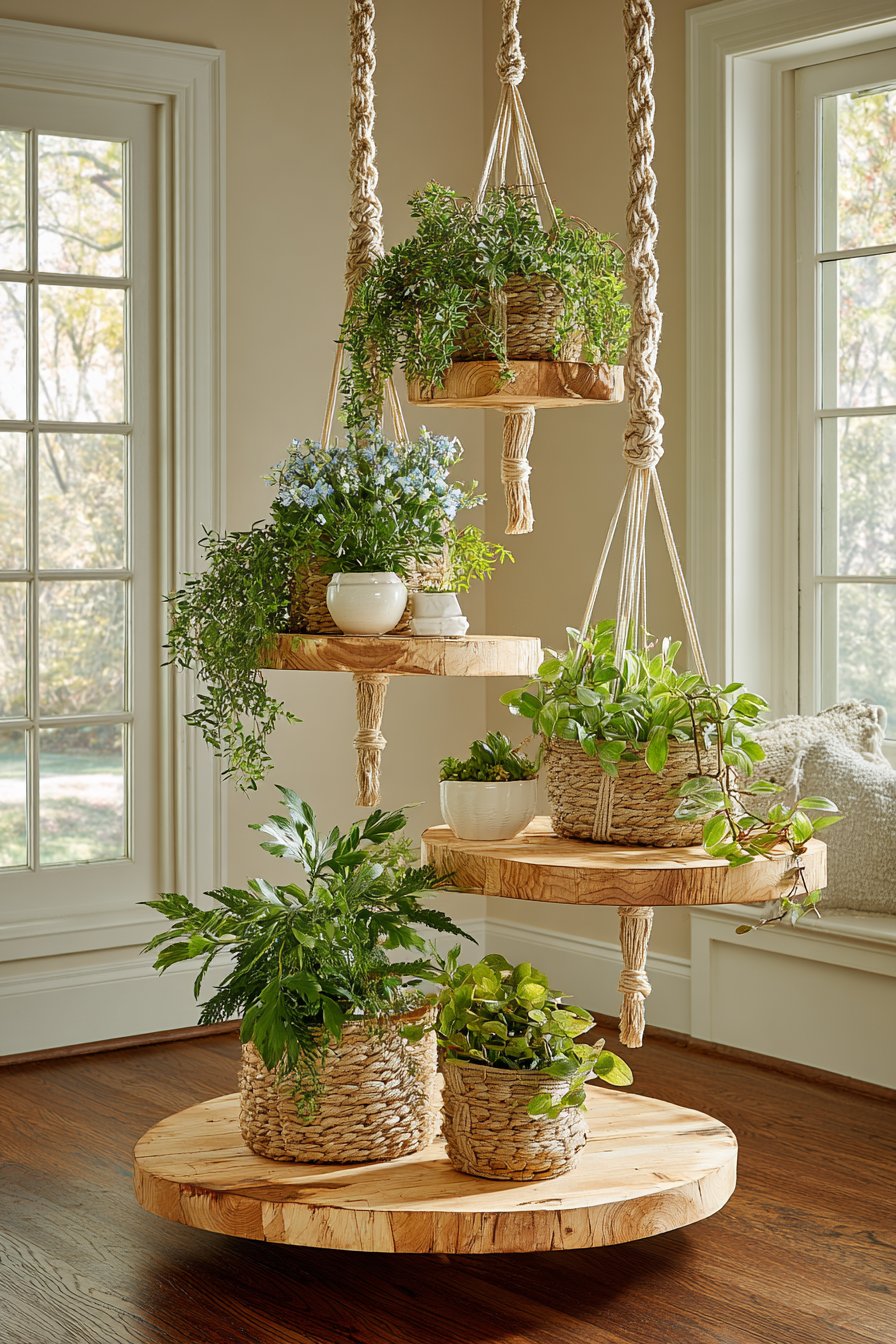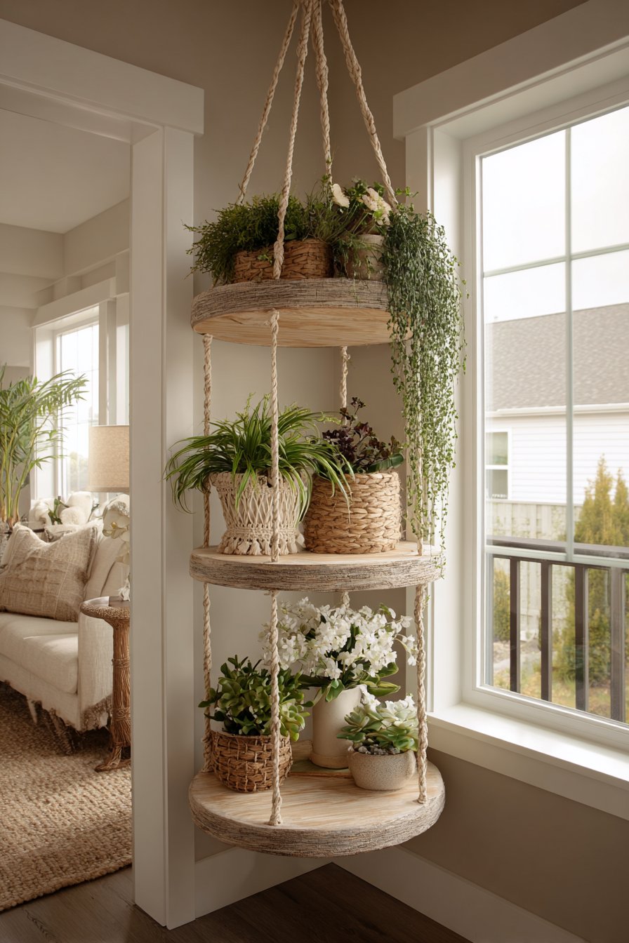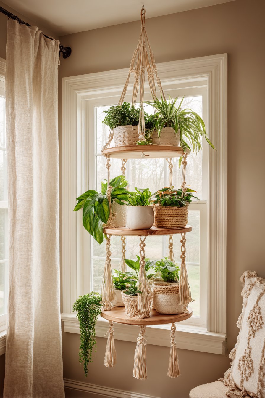 - Add macramé hangers to upper rungs to maximize vertical space and introduce handcrafted texture