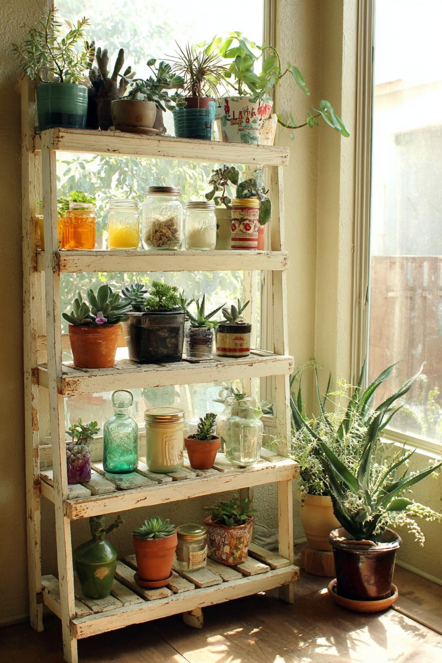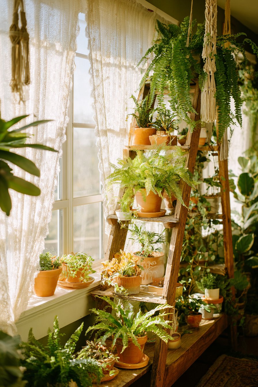 Embracing the spirit of creative reuse, a vintage wooden ladder transformed into a plant stand epitomizes bohemian design philosophy. This indoor plant shelf idea celebrates imperfection and individuality, with each weathered rung telling its own story while serving a new purpose. The ladder leans casually against the wall in a sun-drenched corner, its worn patina and rustic character providing the perfect counterpoint to an exuberant collection of plants. Multiple levels display an eclectic botanical mix—trailing plants like string of pearls and pothos cascade from upper rungs, creating living curtains of green, while fuller ferns and flowering varieties occupy the more stable middle sections. The lower rungs hold larger, leafy plants in substantial pots that ground the entire composition.