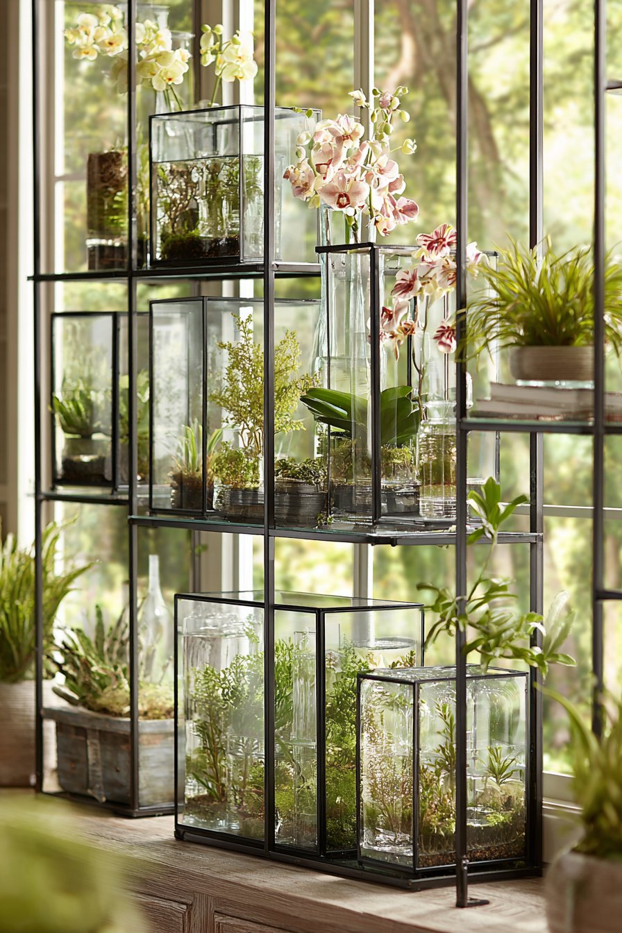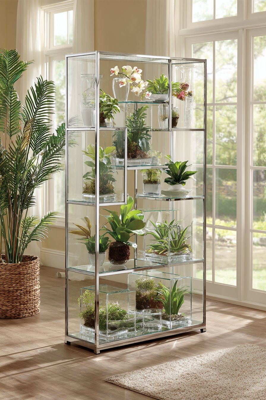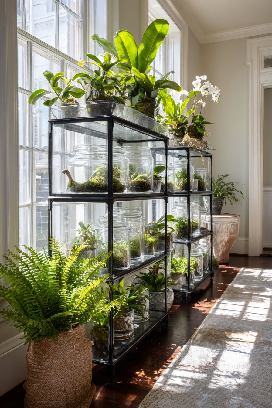 Creating a botanical showcase that celebrates transparency and light, a greenhouse-style shelving unit with glass sides and metal frame brings conservatory elegance to indoor spaces. This indoor plant shelf idea features multiple levels of clear glass shelves supported by slender metal framework, typically powder-coated in black or bronze for minimal visual weight. The transparency serves multiple purposes: aesthetically, it creates an ethereal quality where plants appear almost suspended in air; practically, it allows light to penetrate from all angles, ensuring even specimens on lower shelves receive adequate illumination. The glass sides complete the greenhouse aesthetic while containing humidity—particularly beneficial for tropical plants that thrive in more humid microenvironates than typical homes provide.