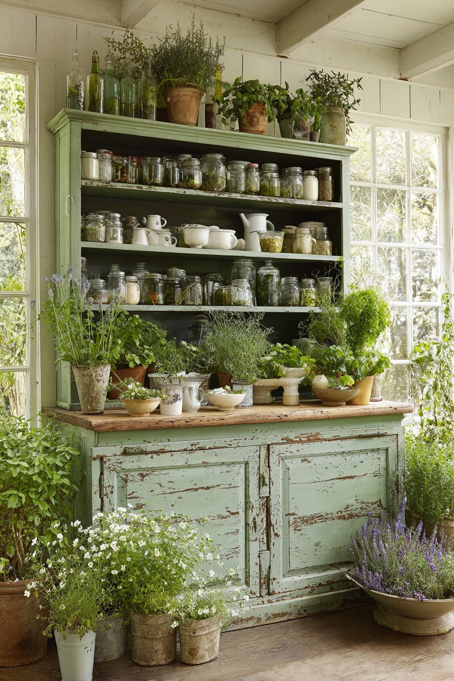 - Use vintage containers for plants—mason jars, enamelware, antique planters—to maintain cohesive aesthetic