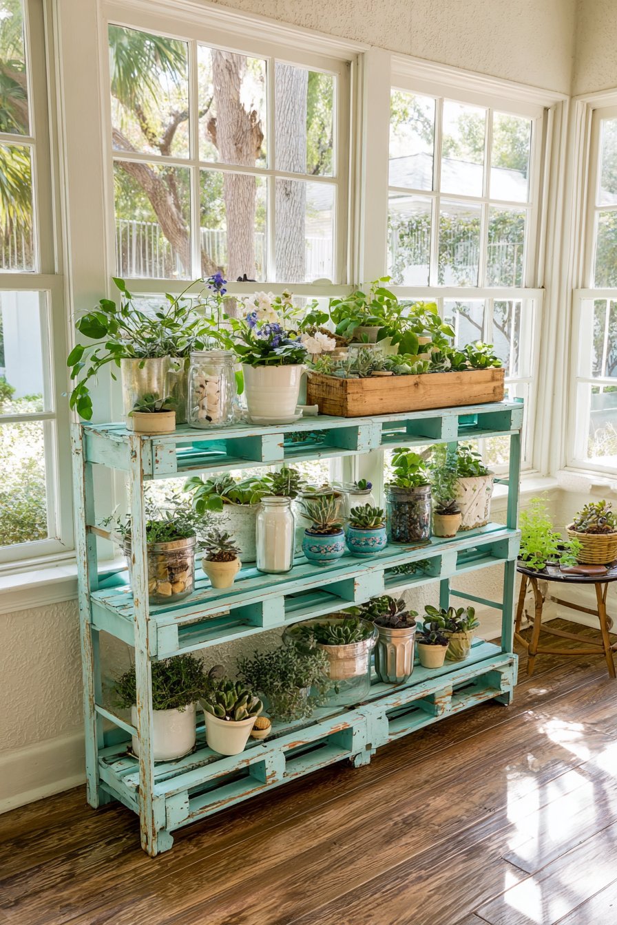 Abundant natural light proves essential for this display, not just for plant health but for the visual impact of sunlight interacting with vintage surfaces. Morning light streaming through multiple windows illuminates dust motes dancing in the air, catches water droplets on leaves and makes them sparkle, highlights the varied patinas on the distressed paint, and creates the warm, nostalgic atmosphere that makes vintage-focused spaces so appealing. The sunroom location creates ideal growing conditions for a diverse plant collection while the vintage bookshelf provides the architectural framework that prevents abundant plant growth from reading as mere clutter. This indoor plant shelf idea resonates particularly with those who value sustainability, find beauty in imperfection, and appreciate the stories embedded in objects that have lived previous lives.