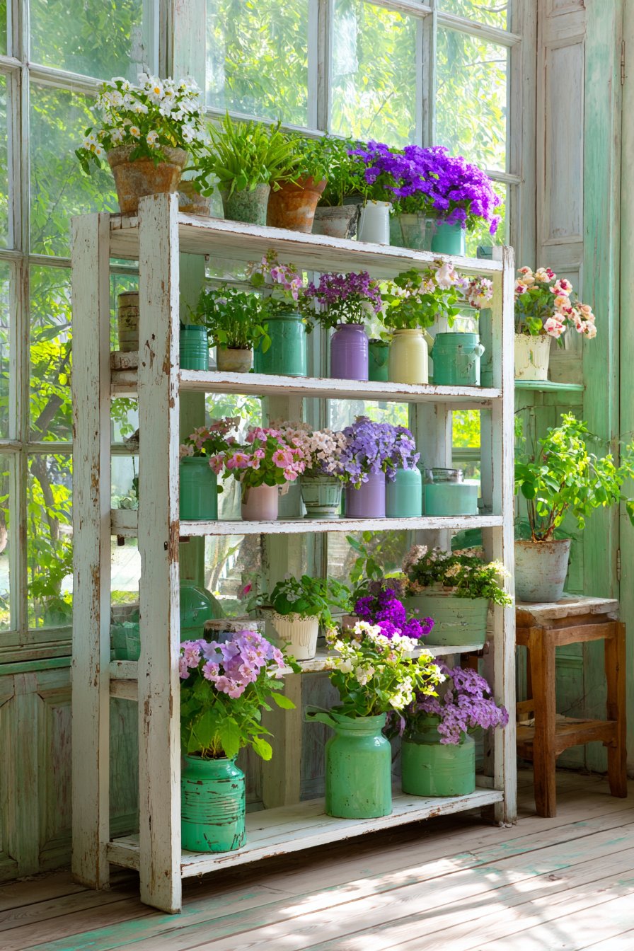 The plant selection leans into the shabby chic and cottage garden aesthetic that vintage furniture naturally evokes. Mason jars become planters for fresh herbs, their utilitarian simplicity perfectly aligned with the vintage ethos of valuing function alongside beauty. Enamelware containers—white with blue trim, showing chips that reveal the dark metal beneath—hold flowering plants like miniature roses, African violets, or begonias that add welcome color. Antique planters discovered at the same estate sales and flea markets that yielded the bookshelf itself complete the collected-over-time appearance. The plant mix includes flowering varieties, fragrant herbs, and lush foliage plants, creating the exuberant, slightly wild abundance associated with cottage gardens where structure takes a back seat to profusion and charm.