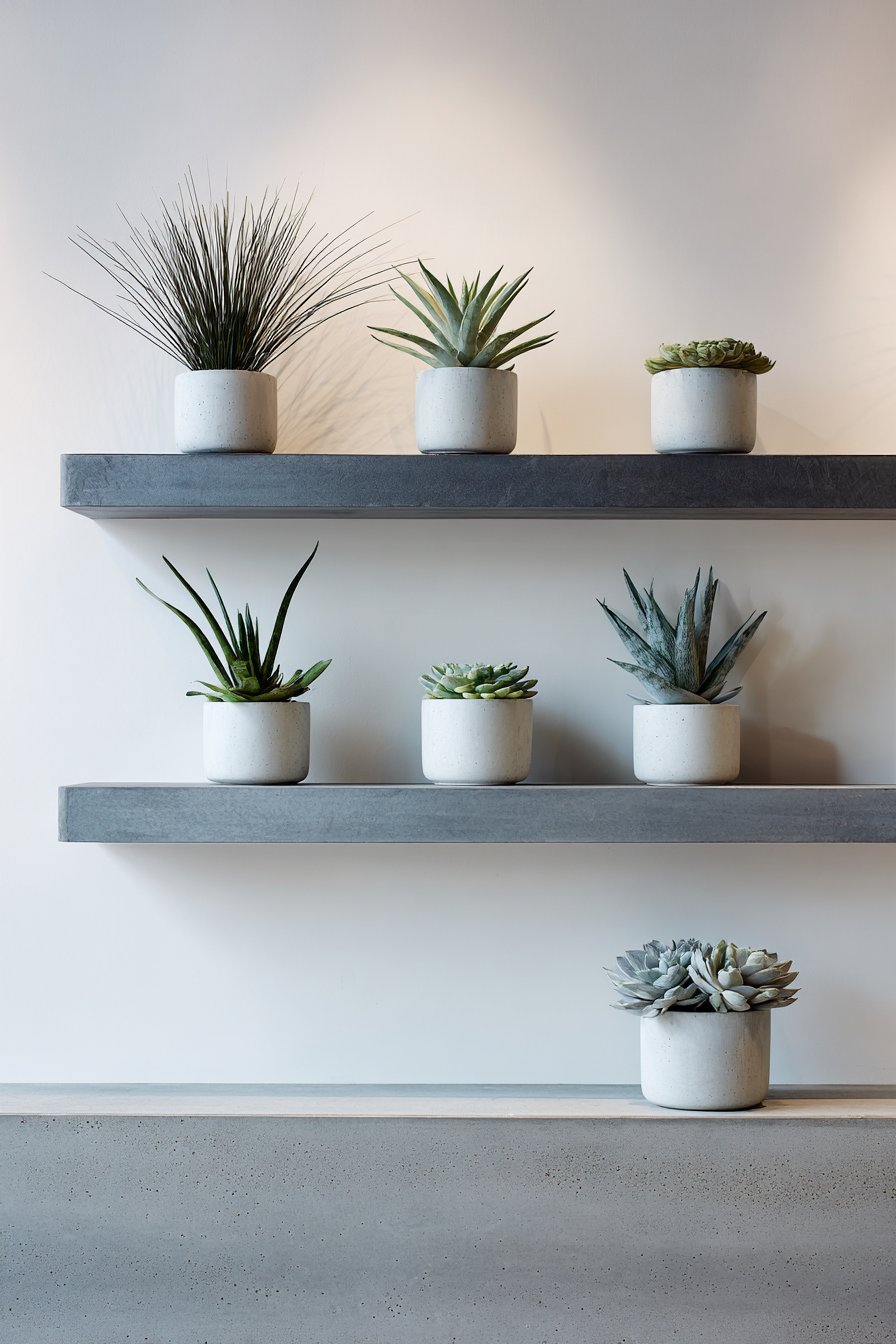 - Choose concrete shelves with clean, crisp edges—any imperfections will read as flaws rather than character in minimalist settings