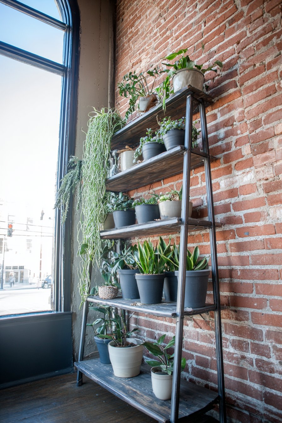 Lighting considerations elevate this display from merely functional to genuinely inspiring. Tall warehouse-style windows flood the space with natural light that changes throughout the day, casting dramatic shadows that emphasize the three-dimensional quality of the shelving structure. The interplay of light and shadow across the various planes—brick, wood, metal, and foliage—creates an ever-changing visual experience that rewards observation. The practical benefits are equally significant: the open design allows excellent air circulation, the sturdy construction accommodates even heavy ceramic planters, and the modular nature of pipe shelving means the system can be adjusted or expanded as your plant collection grows.
