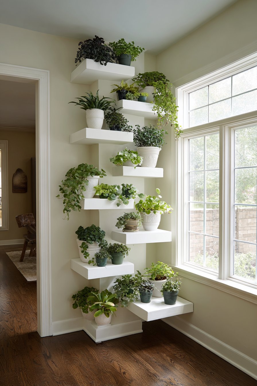Transforming an often-overlooked corner into a striking vertical garden, this indoor plant shelf idea features floating shelves arranged in a dynamic zigzag pattern that climbs the wall like a three-dimensional sculpture. The white-painted wood shelves create bold geometric lines against the wall, their angular progression drawing the eye upward and making clever use of vertical space that might otherwise remain empty. This arrangement demonstrates how thoughtful design can turn spatial limitations into opportunities for creative expression. Each shelf in the zigzag formation holds plants of varying sizes, from petite succulents in minimal white ceramic pots to medium trailing pothos that soften the sharp angles with their cascading greenery. The graduated sizing—larger plants on lower shelves, progressively smaller specimens above—creates natural visual flow while respecting the structural logic of weight distribution.