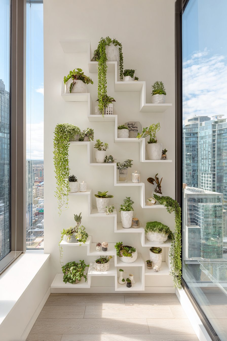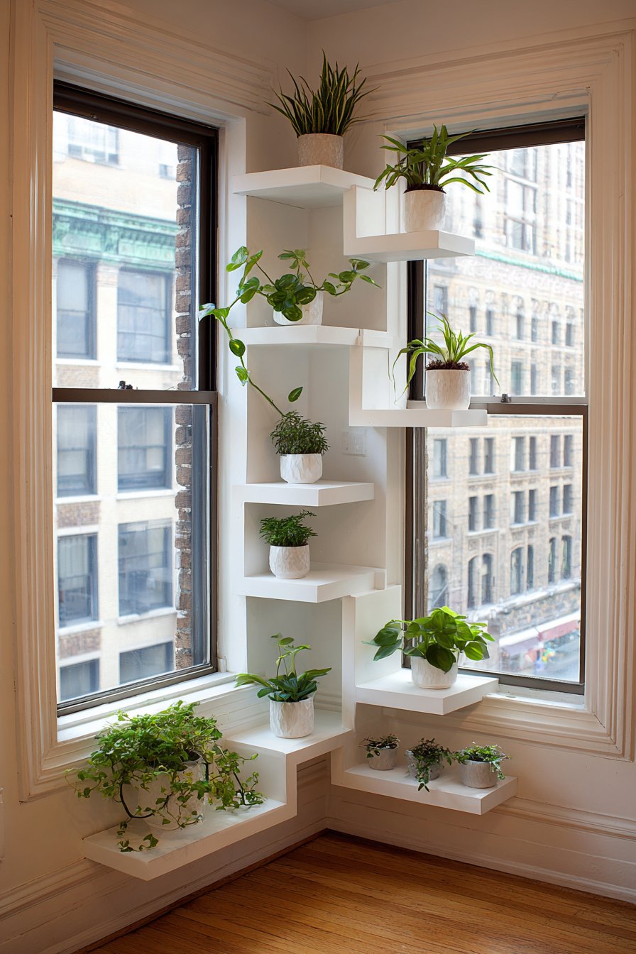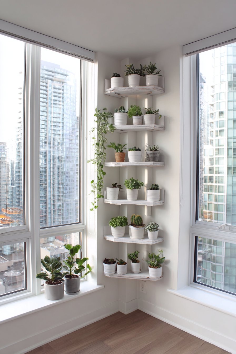 The genius of this design lies in its ability to maximize corner space without overwhelming it. Corners often present challenges in interior design: furniture doesn’t fit quite right, artwork looks awkward, and the space feels wasted. These geometric floating shelves solve that problem elegantly, turning a potential dead zone into a focal point that catches attention from multiple viewing angles. The white finish keeps the shelves from competing with the plants for attention, instead serving as a clean canvas that makes the varied greens of the foliage pop with vibrant intensity. The coordinating white ceramic planters maintain visual continuity, creating a cohesive look that feels intentional and designed rather than haphazard.