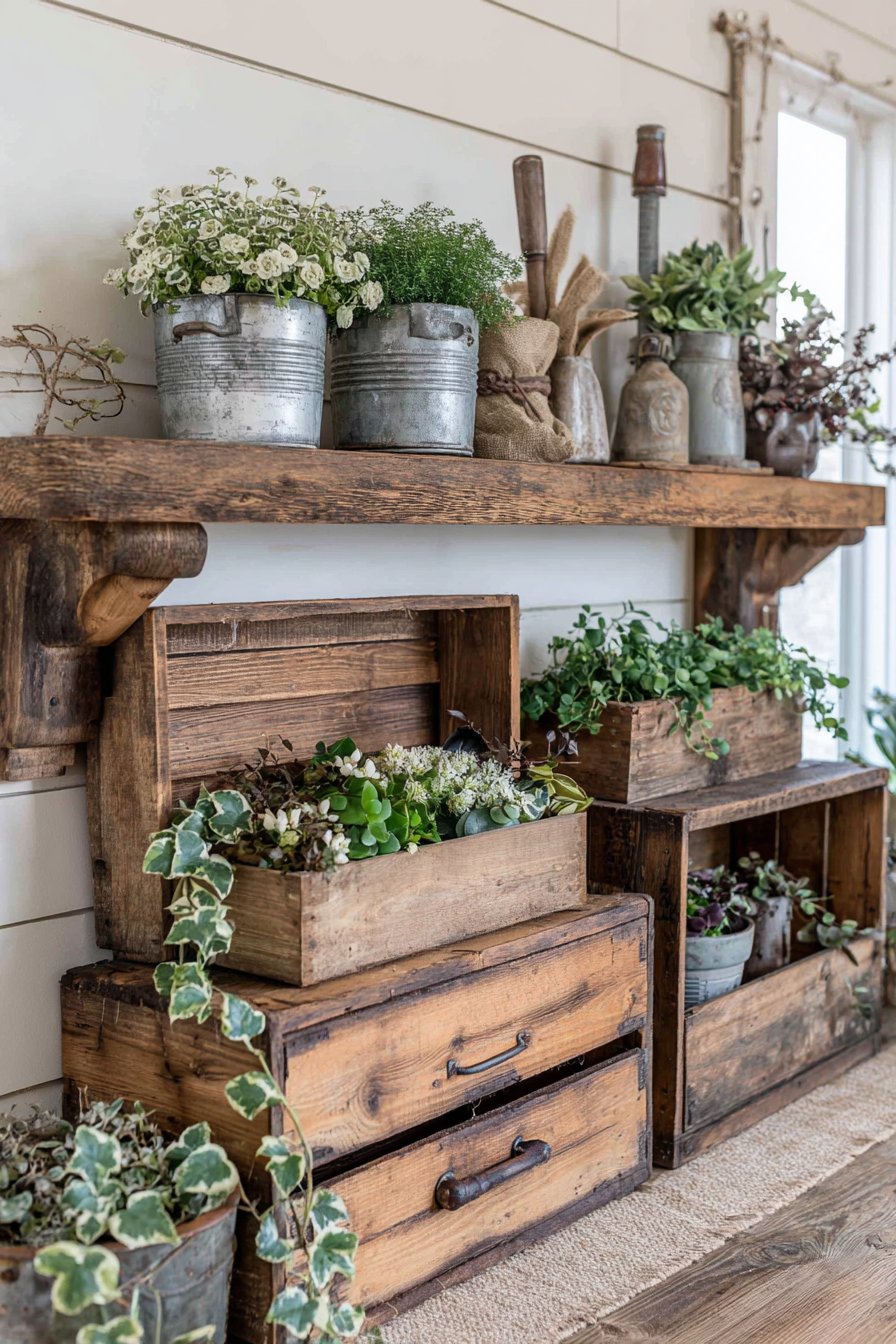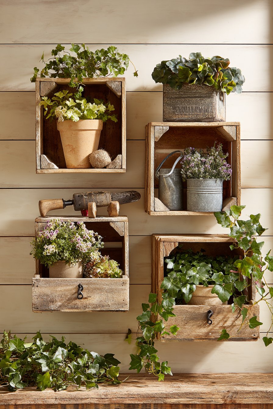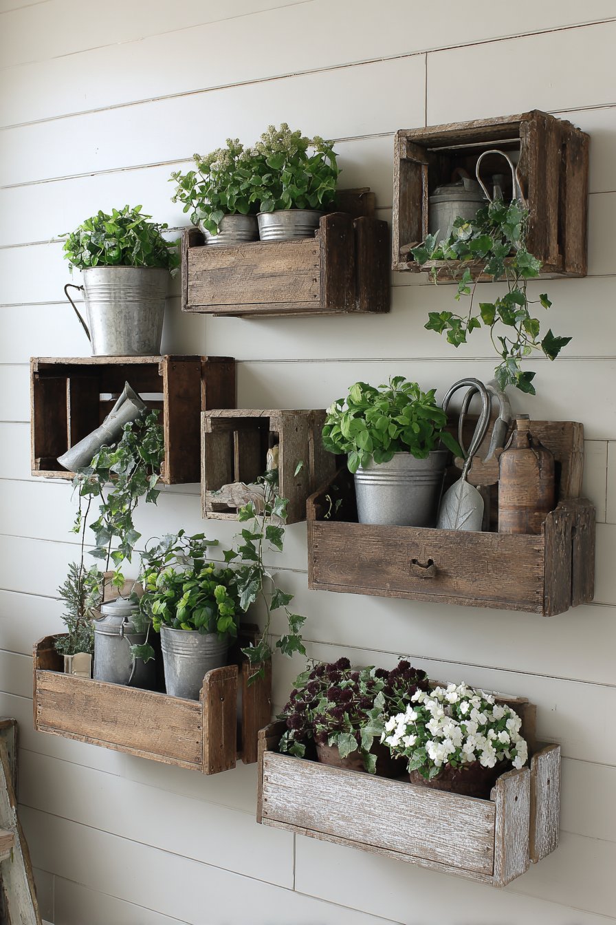 - Consider adding vintage-style hooks between or below crates for hanging plants or tools