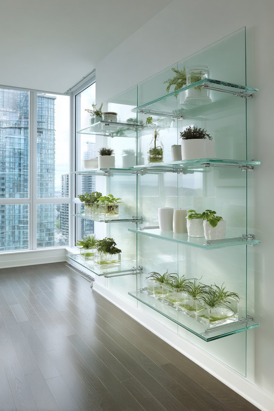The plant selection for this display requires careful consideration to complement rather than overpower the delicate shelving structure. Plants housed in clear glass containers reveal their root systems, transforming typically hidden underground networks into fascinating displays of natural engineering—fibrous roots spreading like dendrites, bulbs nestled in soil layers, or even hydroponic systems where roots float in nutrient-rich water. Minimalist white ceramic pots provide clean contrast against the transparent shelves, their simple cylindrical forms echoing the modern aesthetic. The restrained approach to plant selection—favoring architectural specimens like sleek snake plants, sculptural agave, and geometric succulents—ensures the display feels curated rather than cluttered.