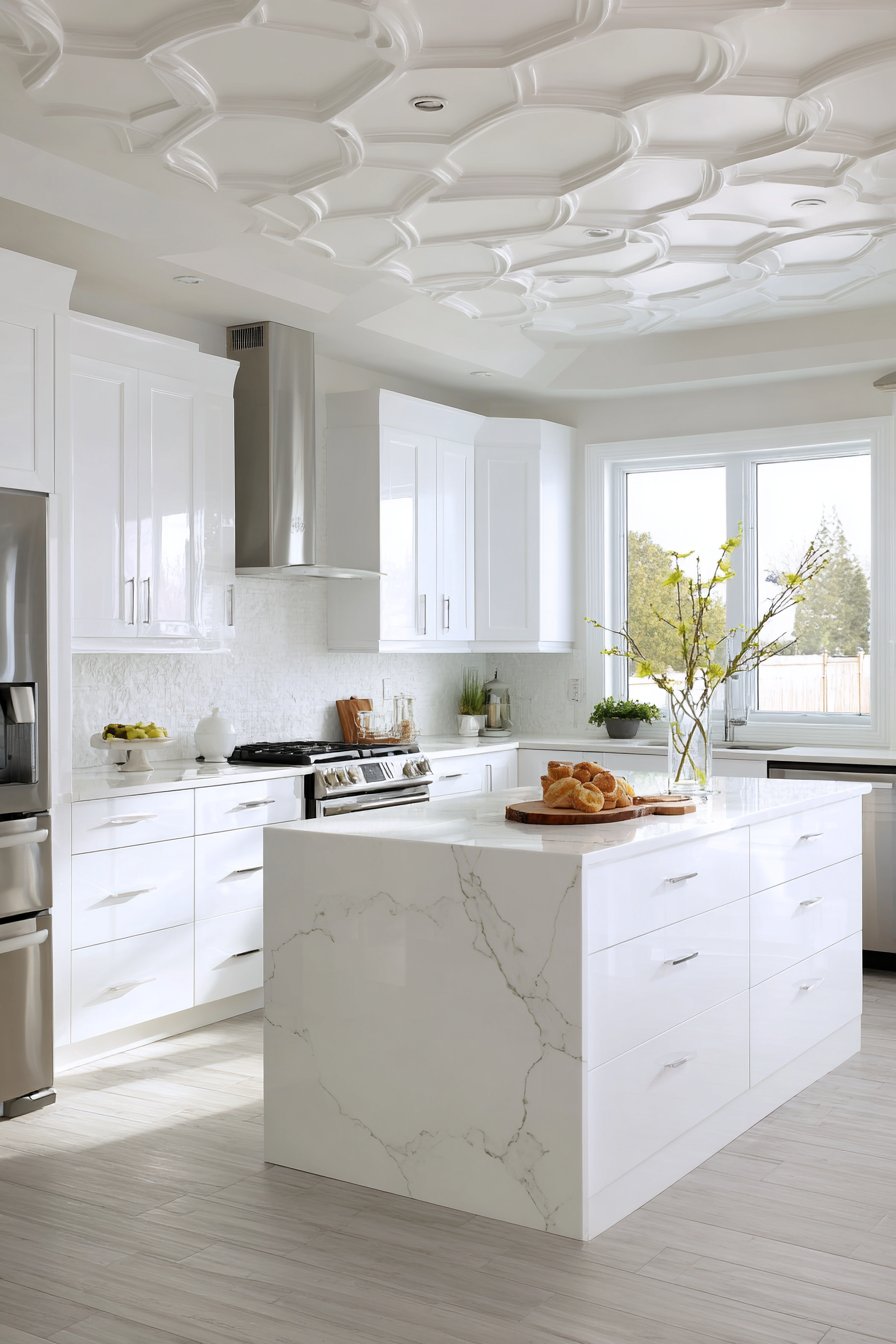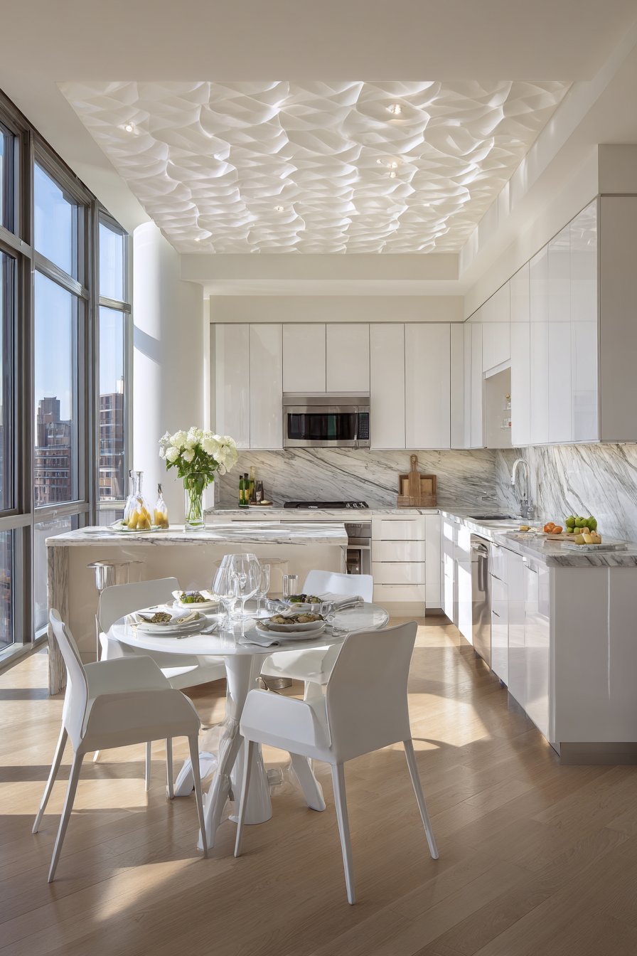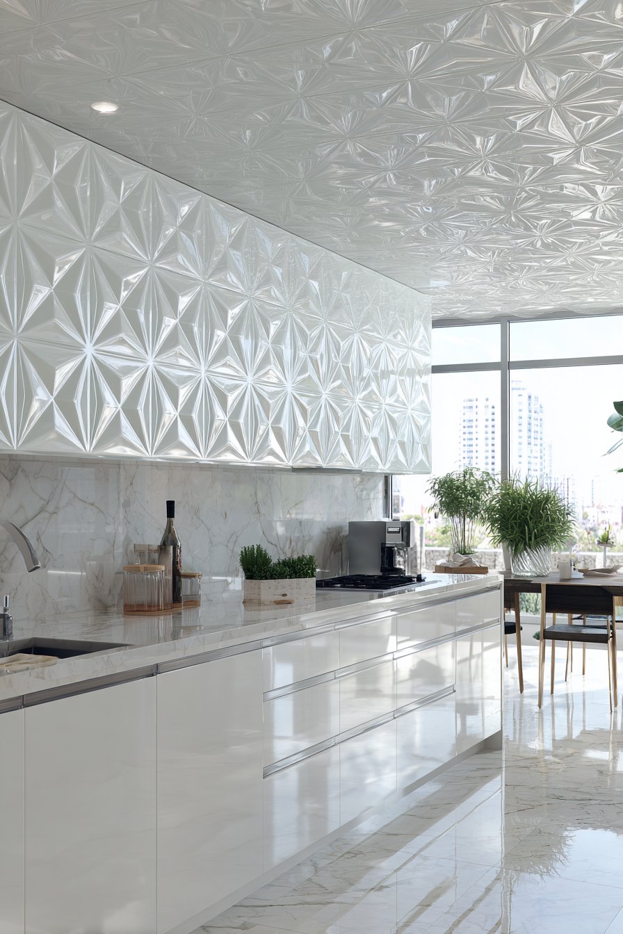 Subtle texture adds dimension without pattern complexity, and textured ceiling tiles with geometric relief create visual interest through shadow play rather than color or ornament. This design features white ceiling tiles arranged in a grid with slight dimensional variation that catches light and creates ever-changing shadow patterns throughout the day. The tiles integrate seamlessly with recessed lighting positioned within the tile grid, maintaining the ordered geometric composition. The modern kitchen’s glossy white cabinets and marble backsplash provide reflective surfaces that enhance light distribution while the textured ceiling adds tactile dimension.