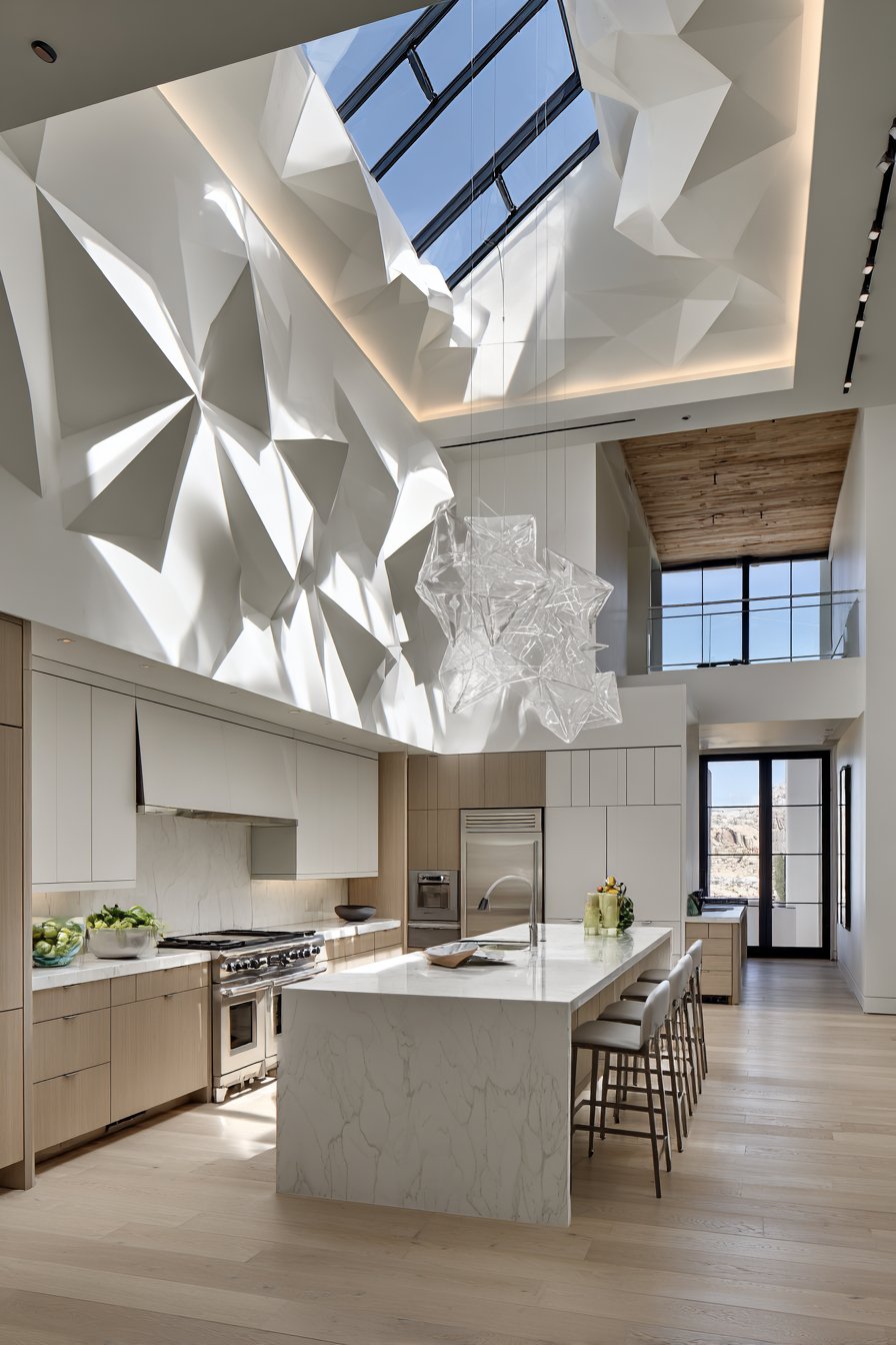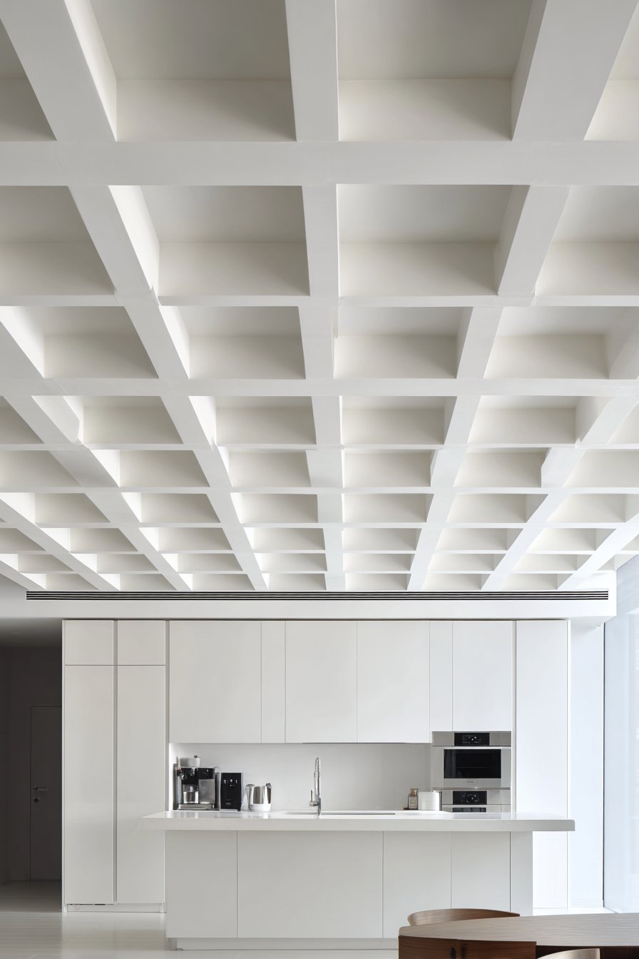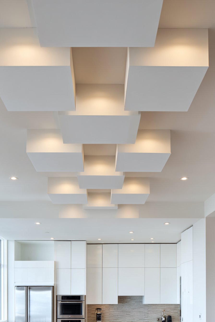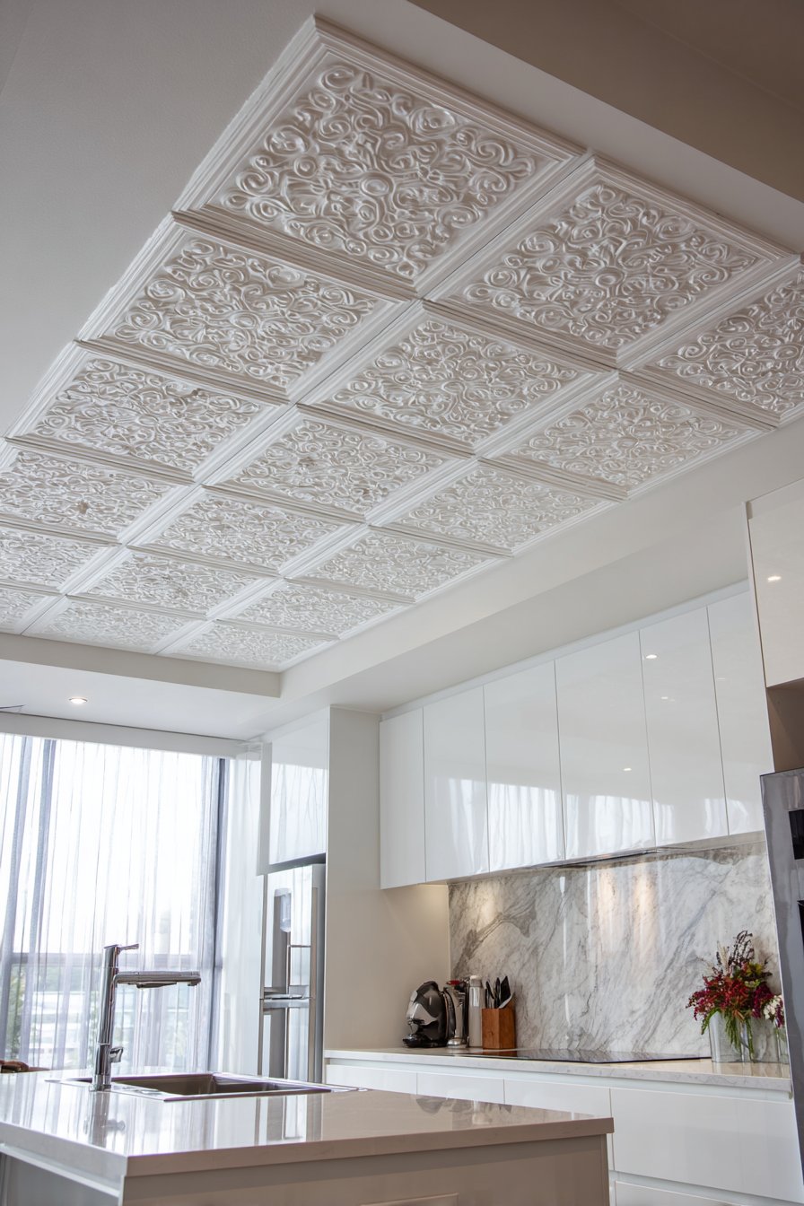 Subtle texture adds dimension without pattern complexity, and textured ceiling tiles with geometric relief create visual interest through shadow play rather than color or ornament. This design features white ceiling tiles arranged in a grid with slight dimensional variation that catches light and creates ever-changing shadow patterns throughout the day. The tiles integrate seamlessly with recessed lighting positioned within the tile grid, maintaining the ordered geometric composition. The modern kitchen’s glossy white cabinets and marble backsplash provide reflective surfaces that enhance light distribution while the textured ceiling adds tactile dimension.