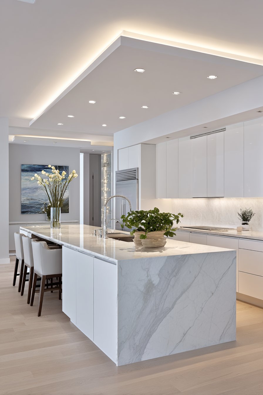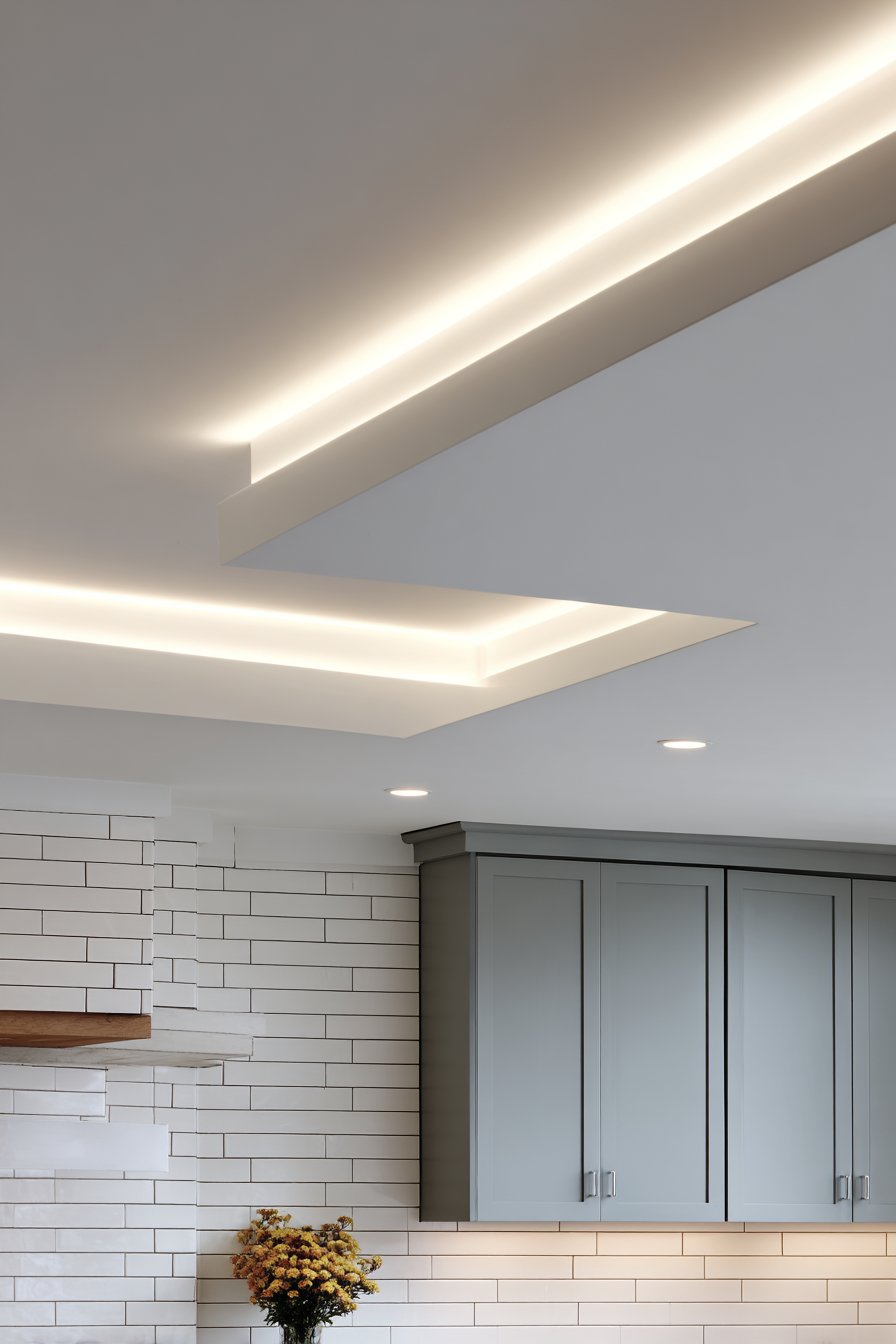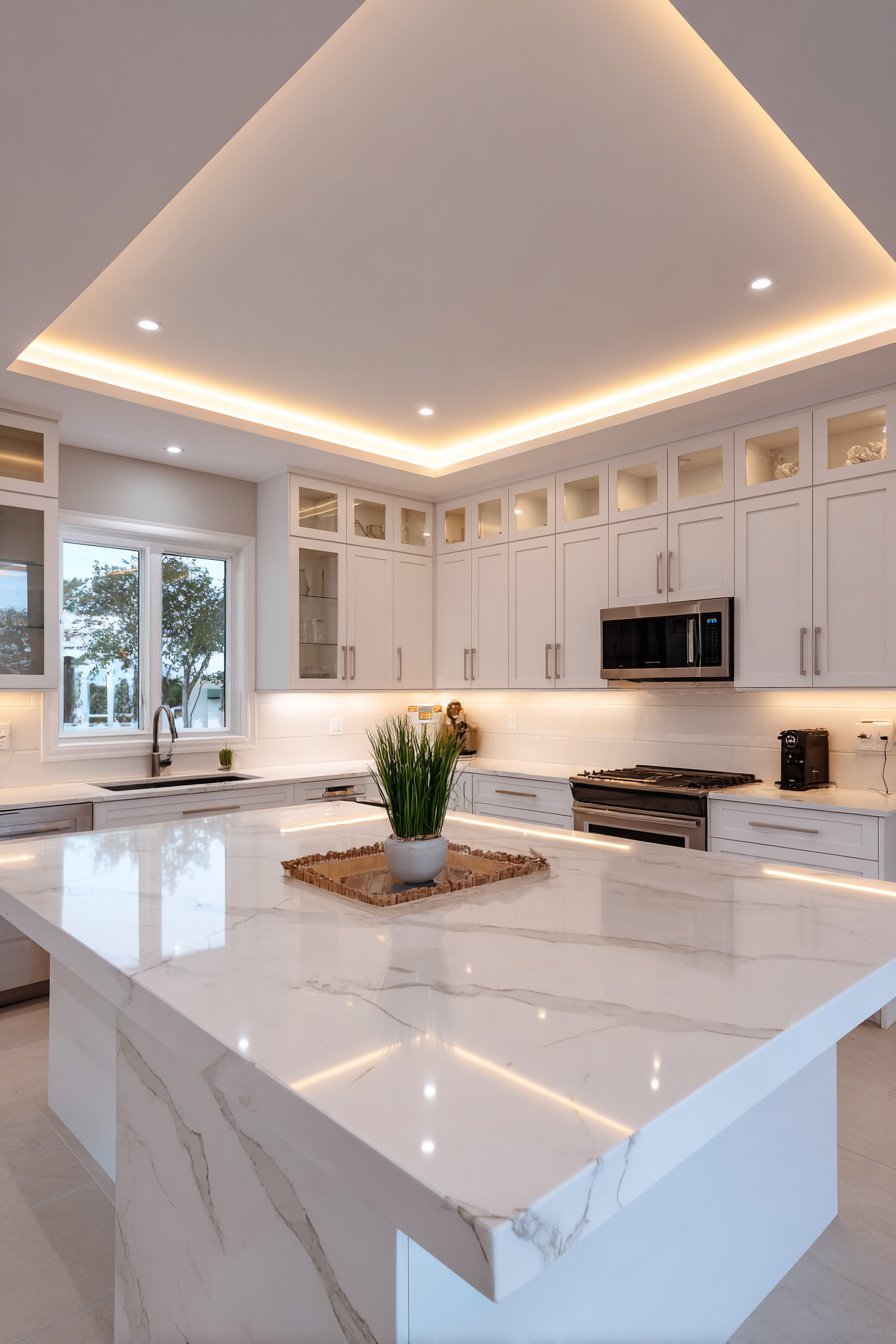 Indirect lighting creates sophisticated ambiance, and perimeter cove lighting produces a floating ceiling effect through concealed illumination. This design features a minimalist white ceiling with continuous cove detail where ceiling meets walls, containing concealed LED strip lighting that creates warm ambient illumination and visual separation. The floating effect emerges from the indirect light washing the ceiling surface while the cove detail remains shadow-free. Additional recessed task lighting over work areas provides focused illumination for cooking activities. The kitchen’s contemporary white cabinets with waterfall quartz countertops maintain the clean, minimal aesthetic that allows the architectural ceiling detail to shine.