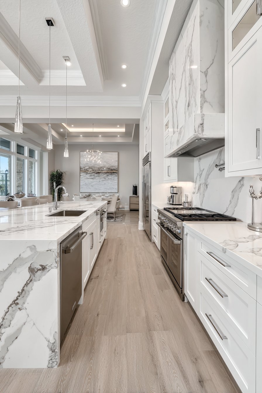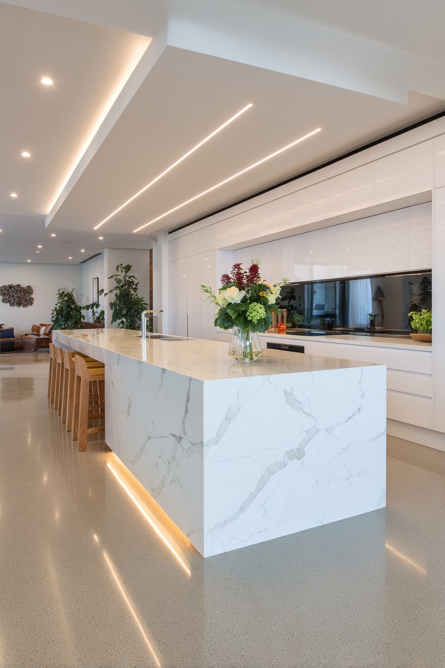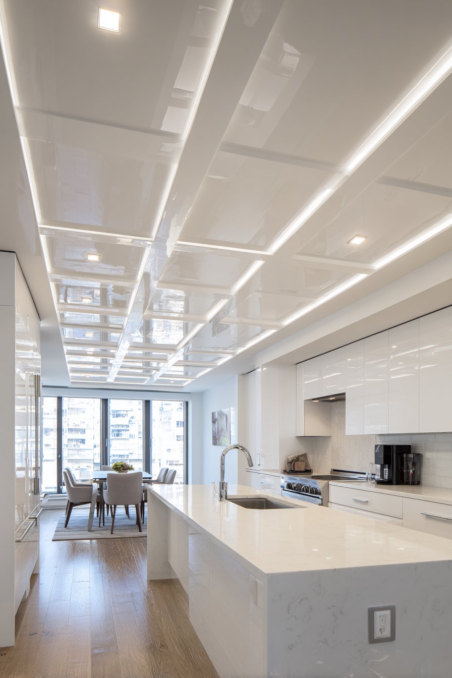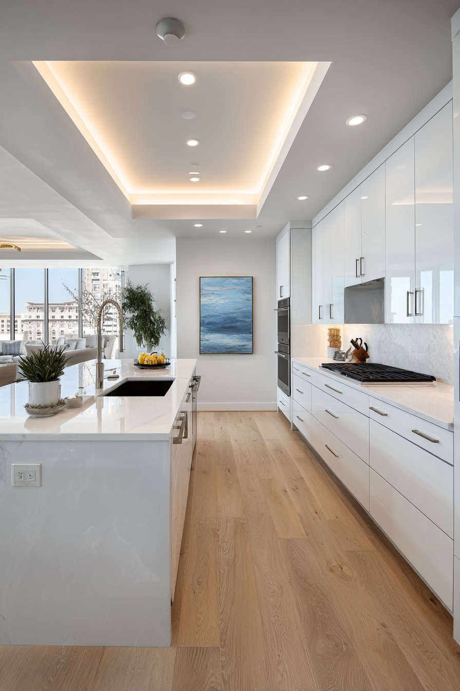 Indirect lighting creates sophisticated ambiance, and perimeter cove lighting produces a floating ceiling effect through concealed illumination. This design features a minimalist white ceiling with continuous cove detail where ceiling meets walls, containing concealed LED strip lighting that creates warm ambient illumination and visual separation. The floating effect emerges from the indirect light washing the ceiling surface while the cove detail remains shadow-free. Additional recessed task lighting over work areas provides focused illumination for cooking activities. The kitchen’s contemporary white cabinets with waterfall quartz countertops maintain the clean, minimal aesthetic that allows the architectural ceiling detail to shine.