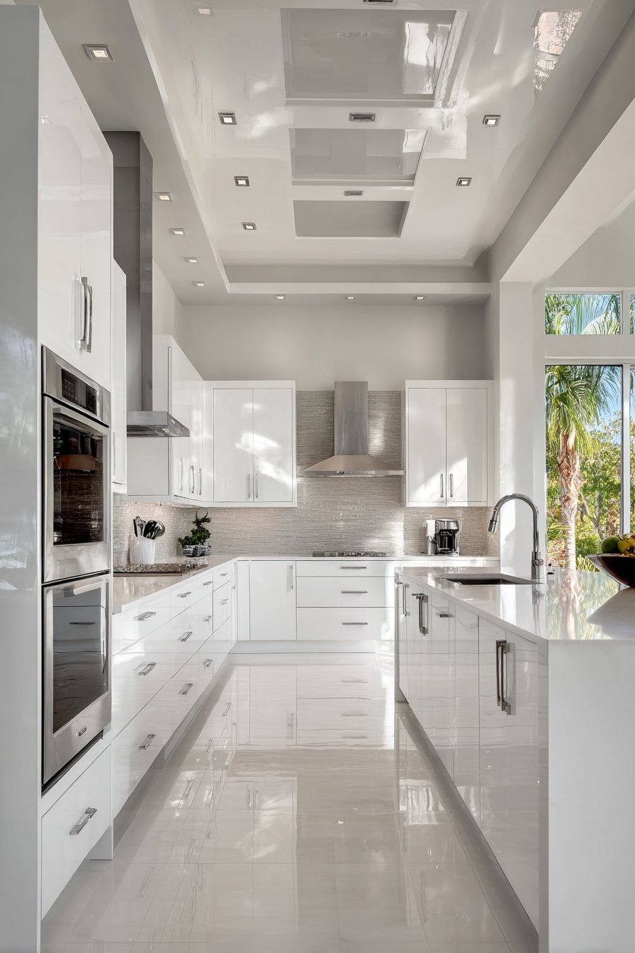 The tray ceiling represents one of the most popular modern ceiling treatments, offering architectural depth without overwhelming the space. This design features a recessed center section that creates a subtle dimensional quality, while concealed LED strip lighting along the perimeter adds both ambient illumination and visual drama. The crisp white finish maintains a clean, contemporary aesthetic that serves as an ideal backdrop for modern kitchen design. The recessed lighting fixtures, finished in brushed nickel, provide focused task lighting exactly where needed for food preparation and cooking activities.
