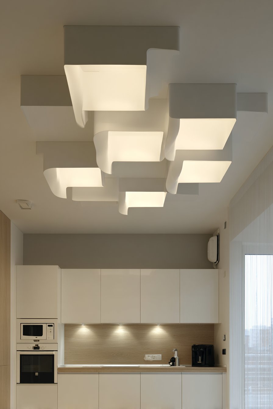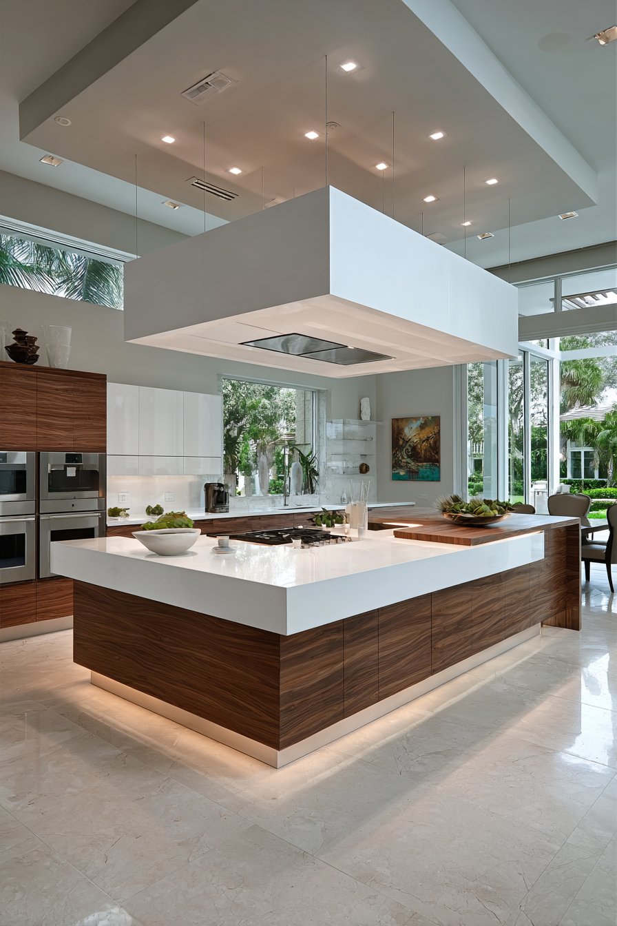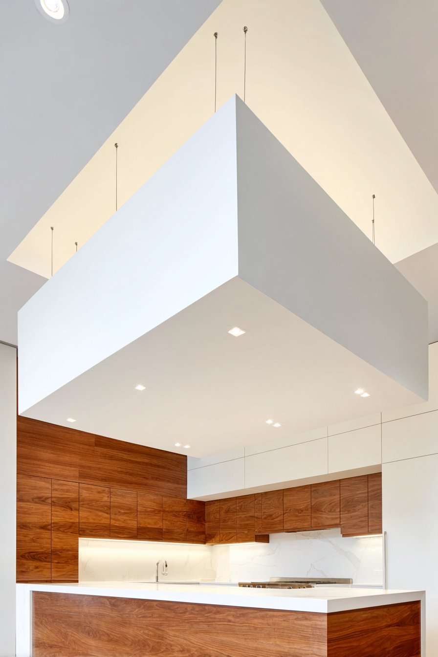 Defining zones within open-plan spaces requires subtle architectural gestures, and a suspended floating panel above the kitchen island creates focus without walls. This design features a rectangular panel suspended from the ceiling by thin metal cables, incorporating downward-facing LED lights that illuminate the island work surface while the panel itself becomes a sculptural element. The suspension system creates dimensionality while maintaining visual openness—the panel defines the island zone without blocking sight lines or creating heavy bulk. The white and wood kitchen cabinetry provides a refined backdrop that allows the floating panel to command attention as a design feature.
