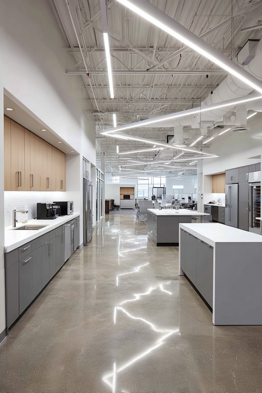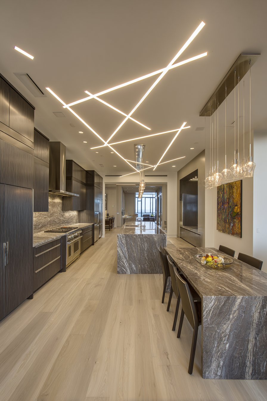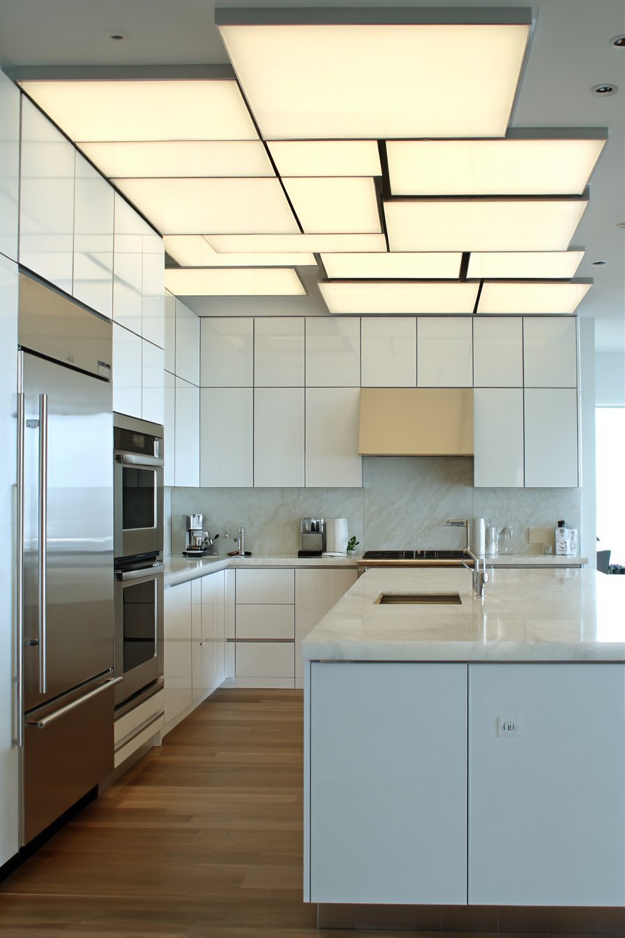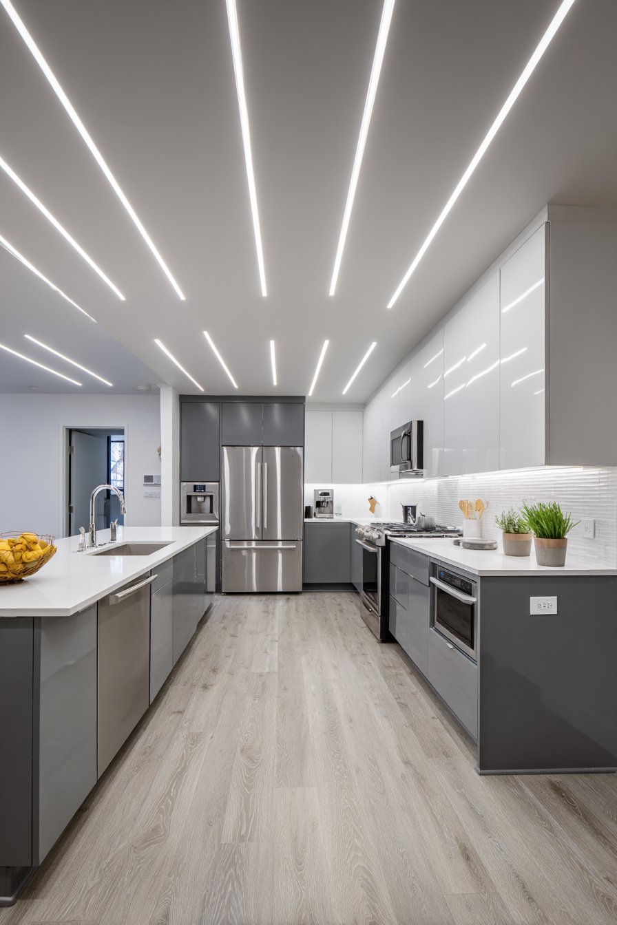 The linear light channel typically measures three to six inches wide and one to two inches deep, creating a subtle but visible recessed detail in the ceiling plane. The continuous LED strip within produces even, shadow-free illumination along its entire length, creating a light blade effect that draws the eye through the space. This design works particularly well in galley kitchens or long, narrow layouts where the linear element emphasizes the room’s natural proportions rather than fighting against them.