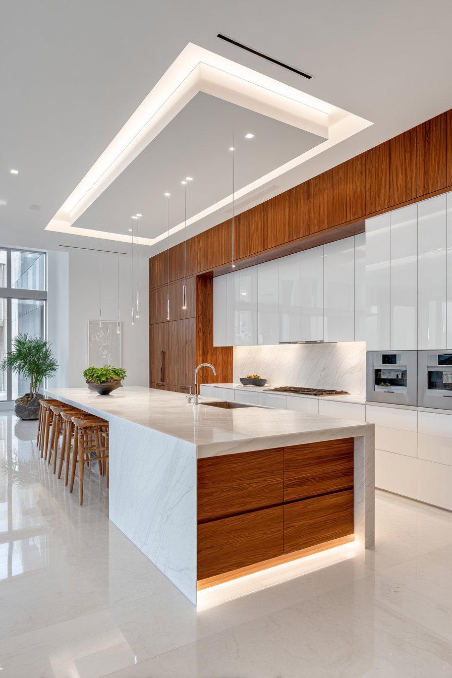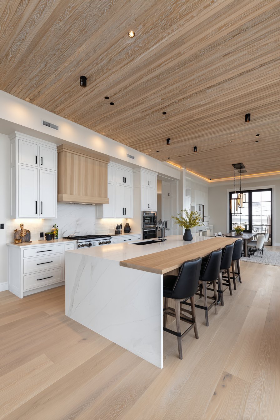 This ceiling treatment adds significant warmth to contemporary kitchens that might otherwise feel cool or austere. The natural wood grain provides organic texture and variation that prevents monotony, while the backlit effect creates dimensional quality and visual interest. The slat direction should relate to the kitchen’s proportions and layout—running slats perpendicular to the longest dimension can make narrow kitchens feel wider, while parallel orientation emphasizes length.