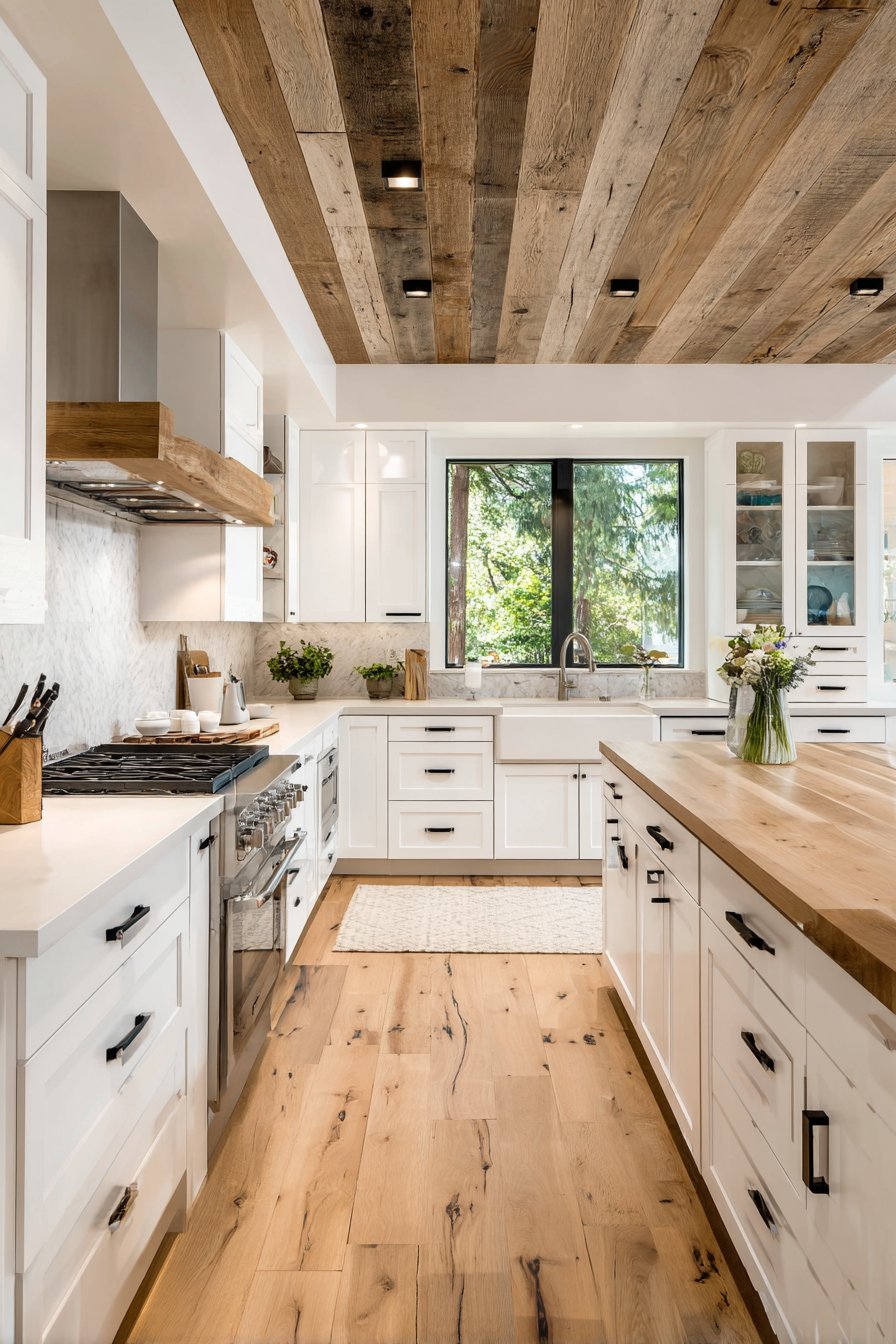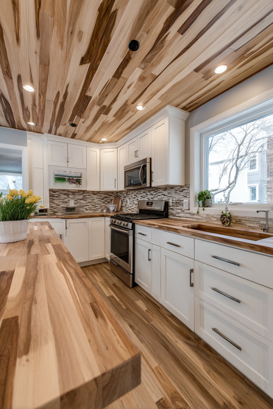 The integration of recessed spotlights between the beams demonstrates how modern design successfully merges aesthetics with functionality. These fixtures provide essential task lighting without interrupting the clean linear pattern established by the beams. The wood tone introduces natural variation and texture, creating visual interest that prevents the minimalist white kitchen below from feeling sterile or cold. This design approach works particularly well in kitchens with contemporary white cabinetry and stainless steel appliances, where the wood ceiling becomes a crucial warming element.