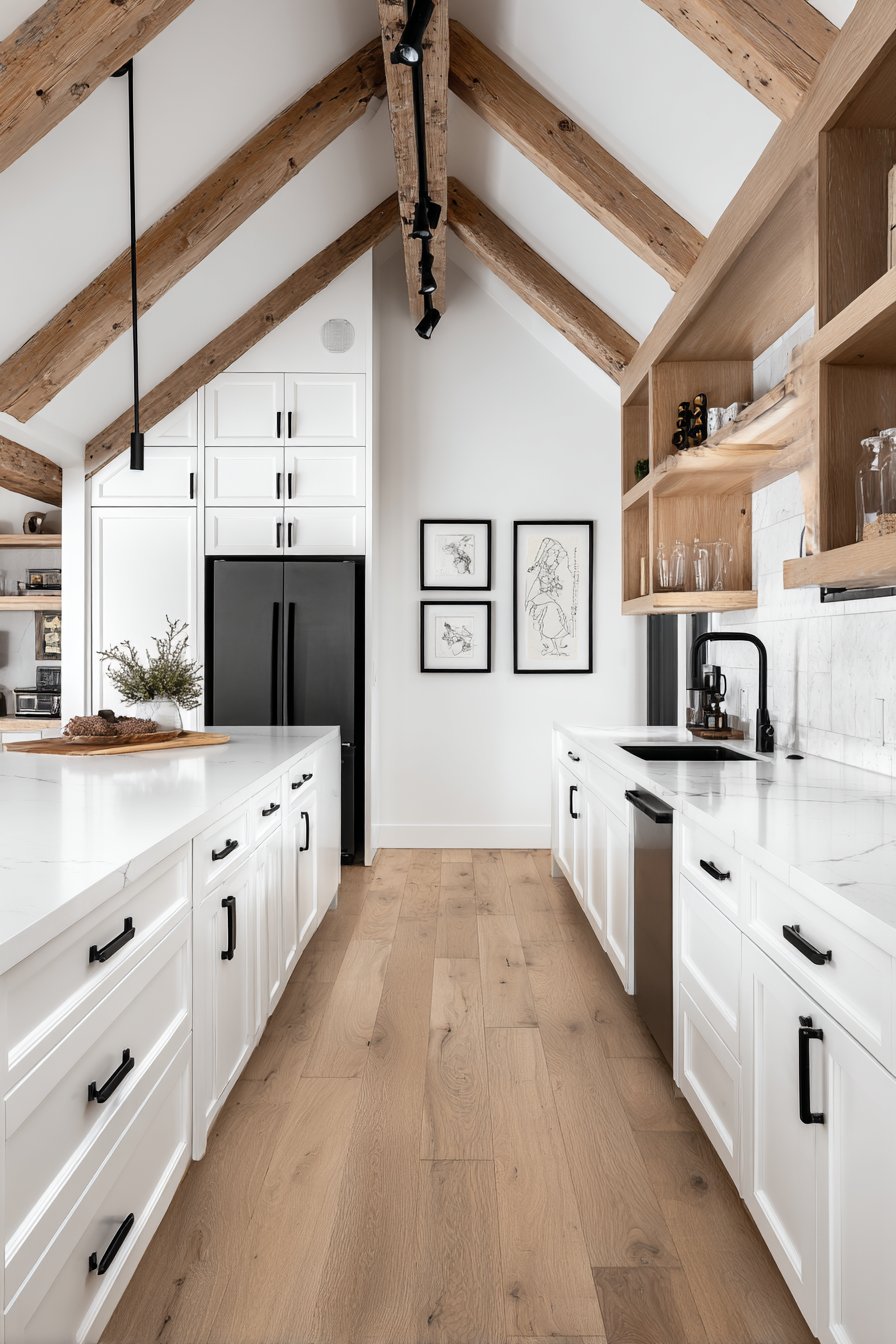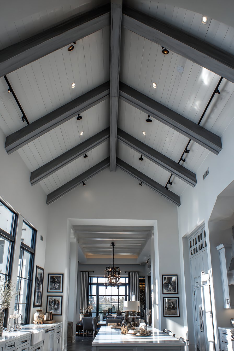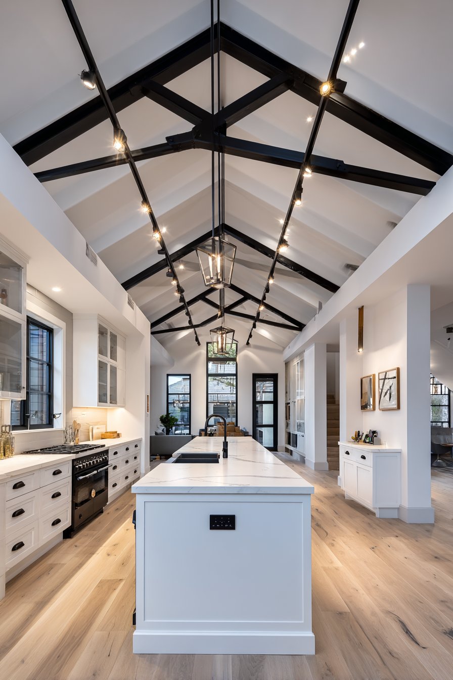 Height and volume transform kitchen environments, and a vaulted ceiling with exposed black metal beams creates dramatic spatial expansion. This design features a white painted vaulted ceiling that follows the roof slope, intersected by structural beams finished in matte black metal. The industrial material choice and dark color create strong linear elements that emphasize the ceiling’s geometry while the white surfaces maximize light reflection and perceived spaciousness. Track lighting mounted along the beams provides flexible, adjustable task lighting that can be repositioned as kitchen needs evolve.