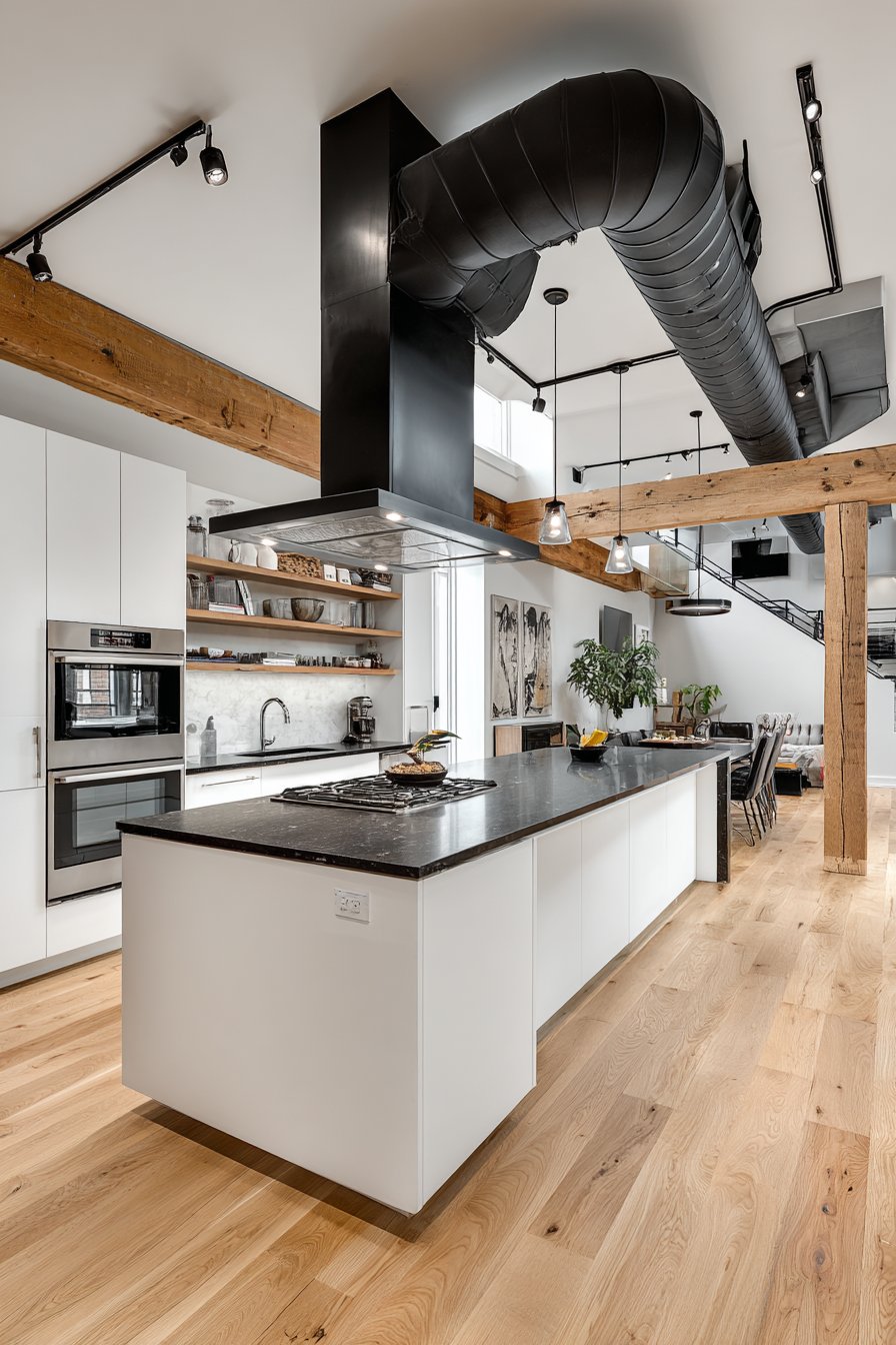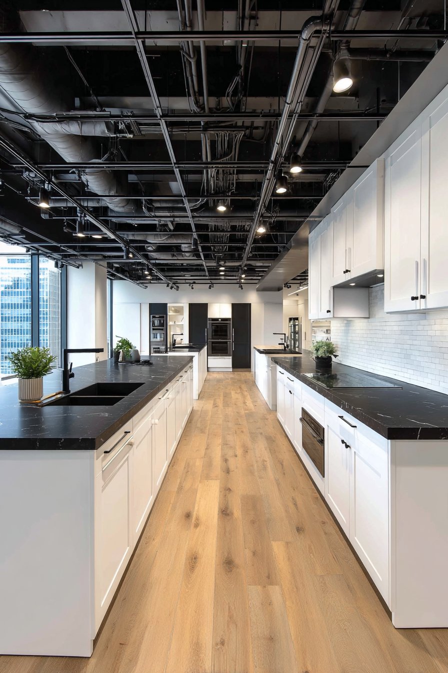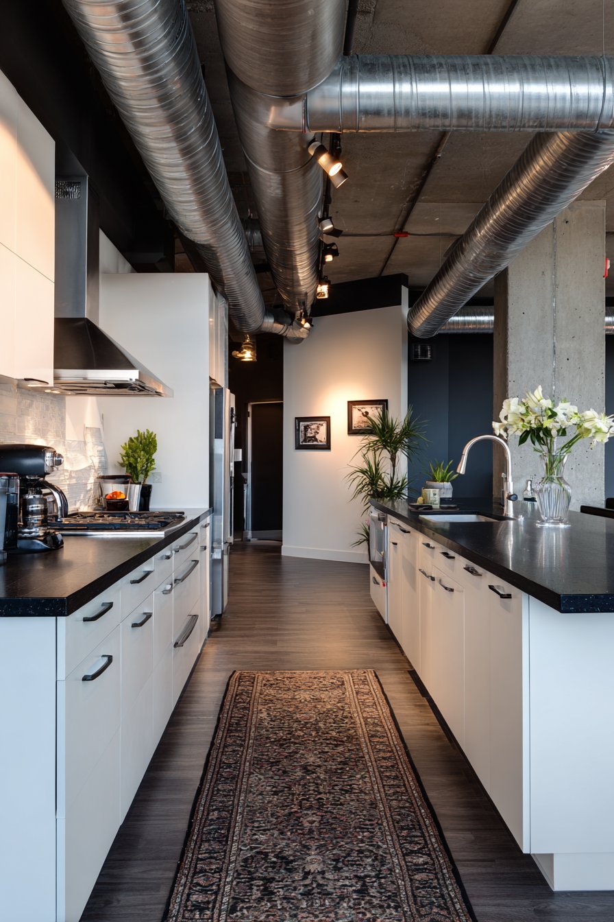 Height and volume transform kitchen environments, and a vaulted ceiling with exposed black metal beams creates dramatic spatial expansion. This design features a white painted vaulted ceiling that follows the roof slope, intersected by structural beams finished in matte black metal. The industrial material choice and dark color create strong linear elements that emphasize the ceiling’s geometry while the white surfaces maximize light reflection and perceived spaciousness. Track lighting mounted along the beams provides flexible, adjustable task lighting that can be repositioned as kitchen needs evolve.