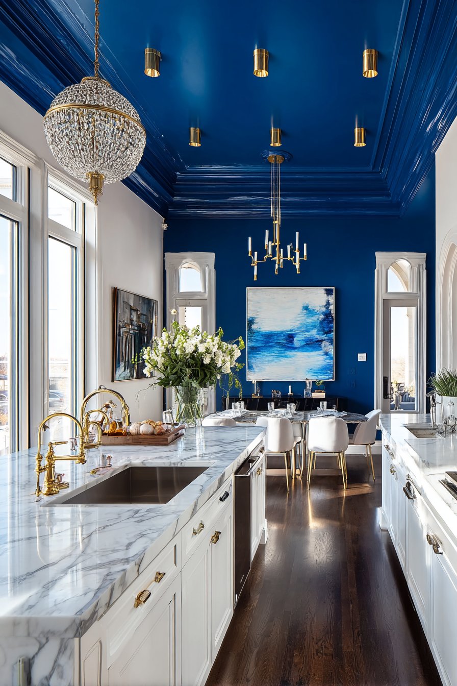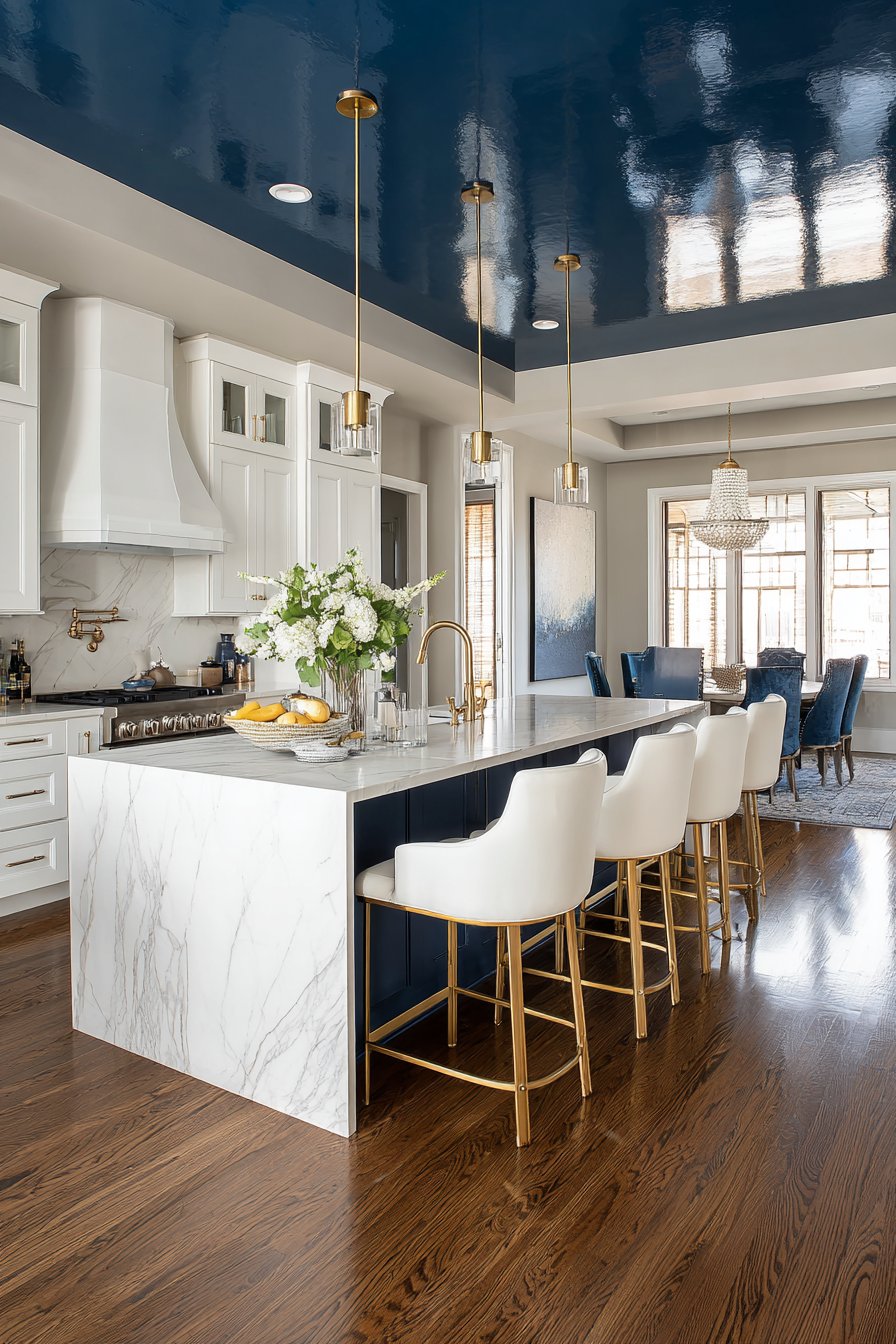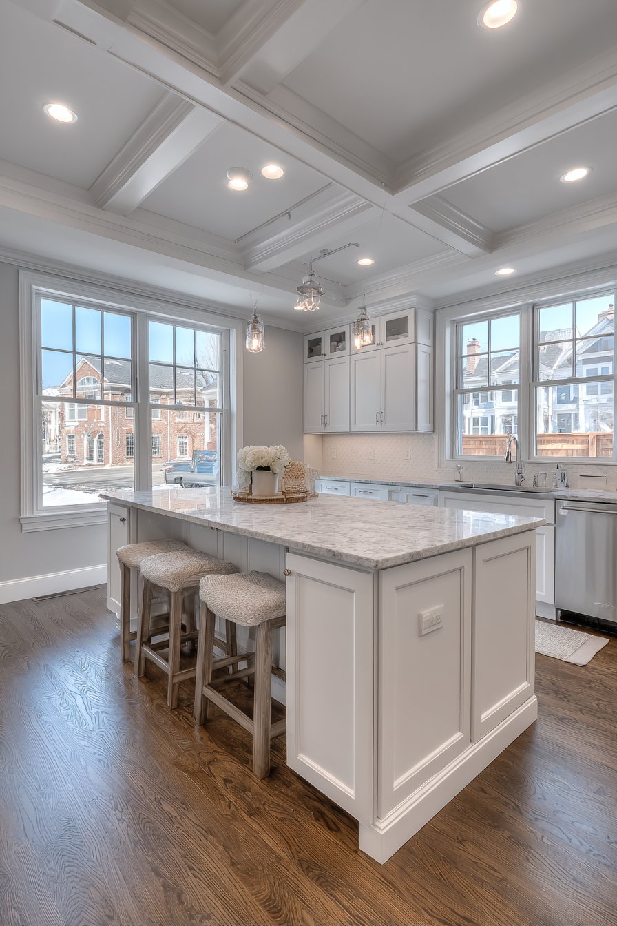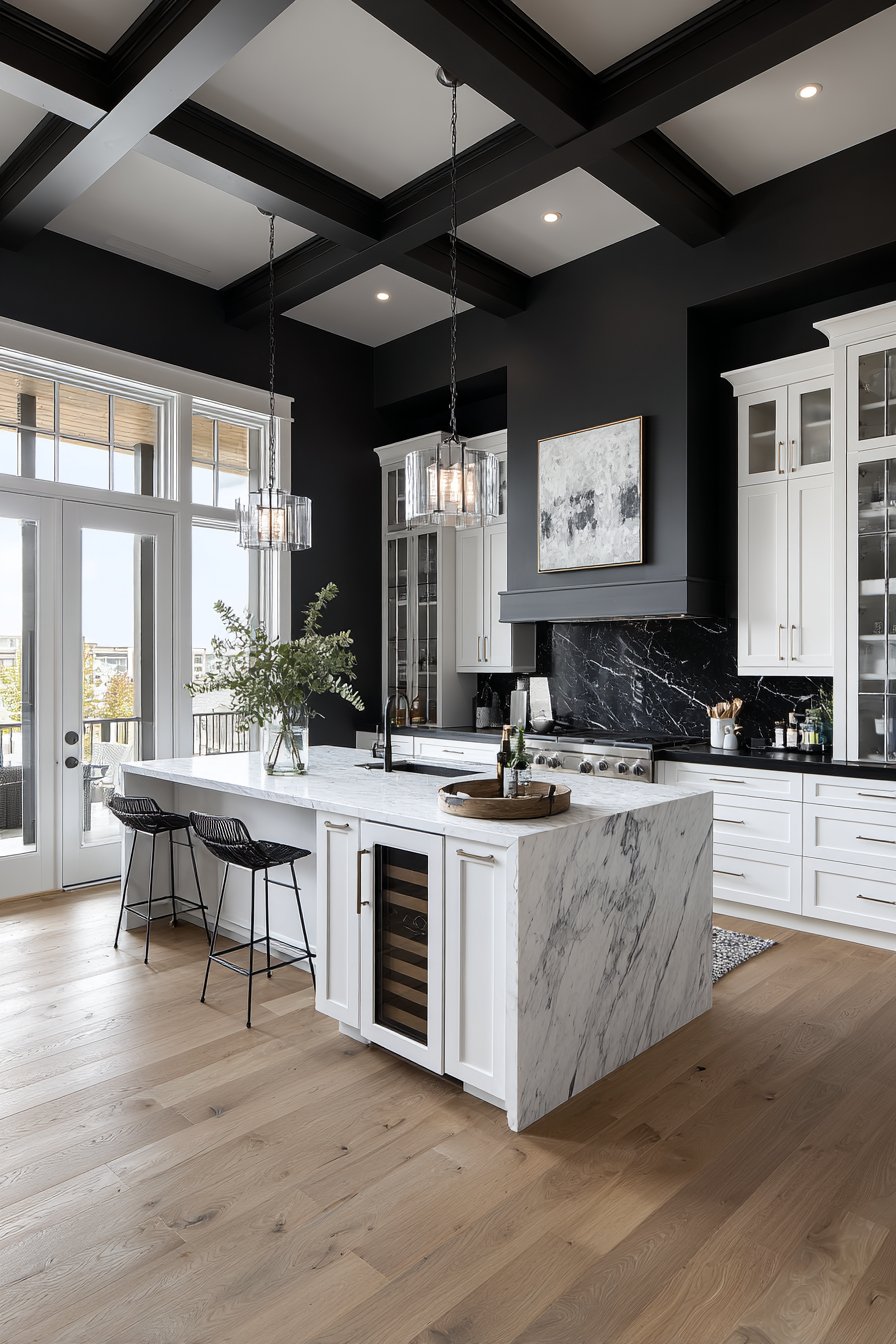 The psychological impact of a dark ceiling in a bright white kitchen cannot be overstated. This design approach defies conventional wisdom that ceilings must always be white to maximize light and space. Instead, the black coffered ceiling grounds the room, creating definition and structure while the bright white cabinetry and marble countertops below provide balance and prevent the space from feeling cave-like. The result is a kitchen with genuine design confidence—one that embraces contrast and makes a bold statement about the homeowner’s aesthetic sensibilities.