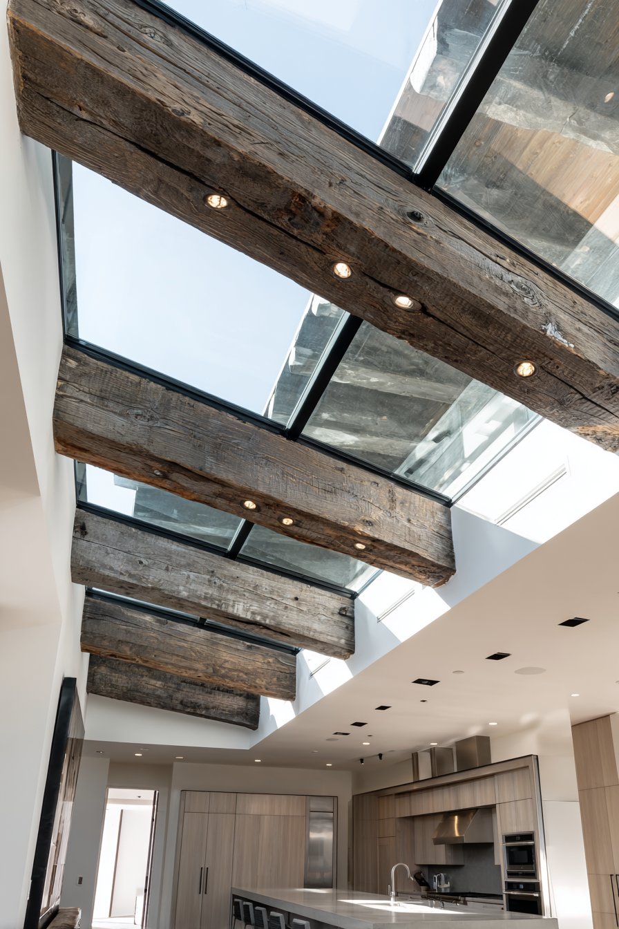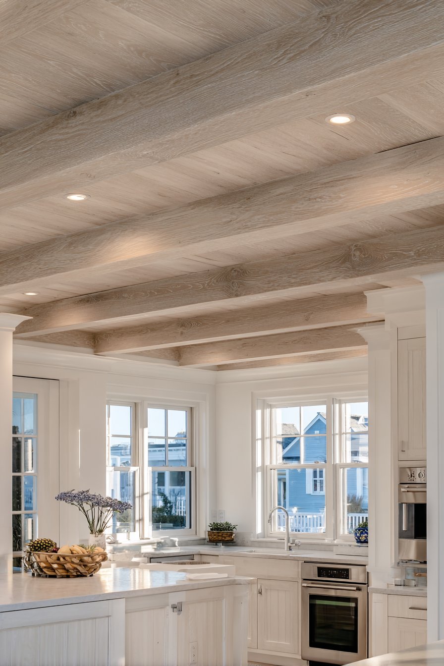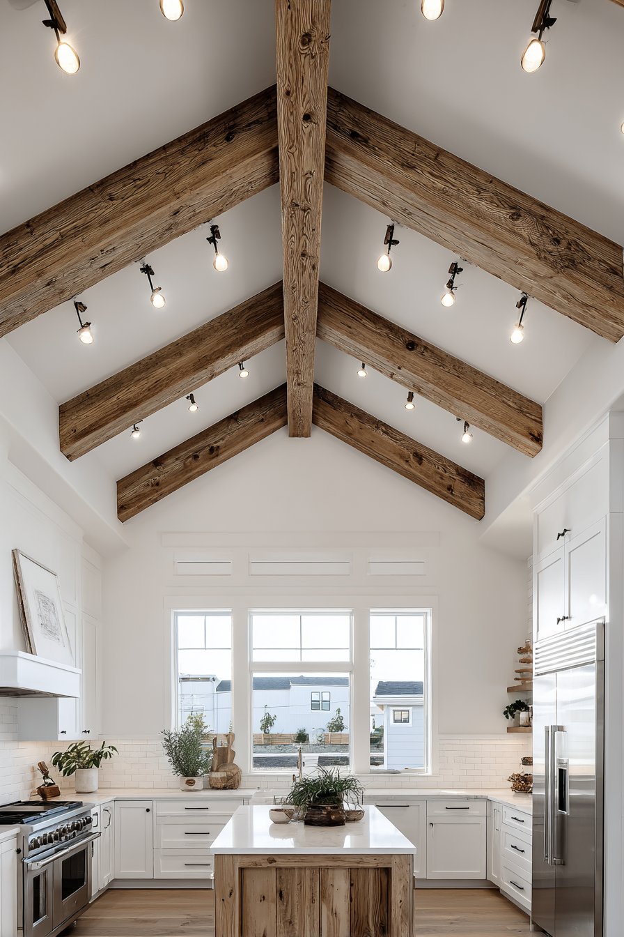 • Mount beams perpendicular to the main kitchen length to visually widen the space, or parallel to emphasize length