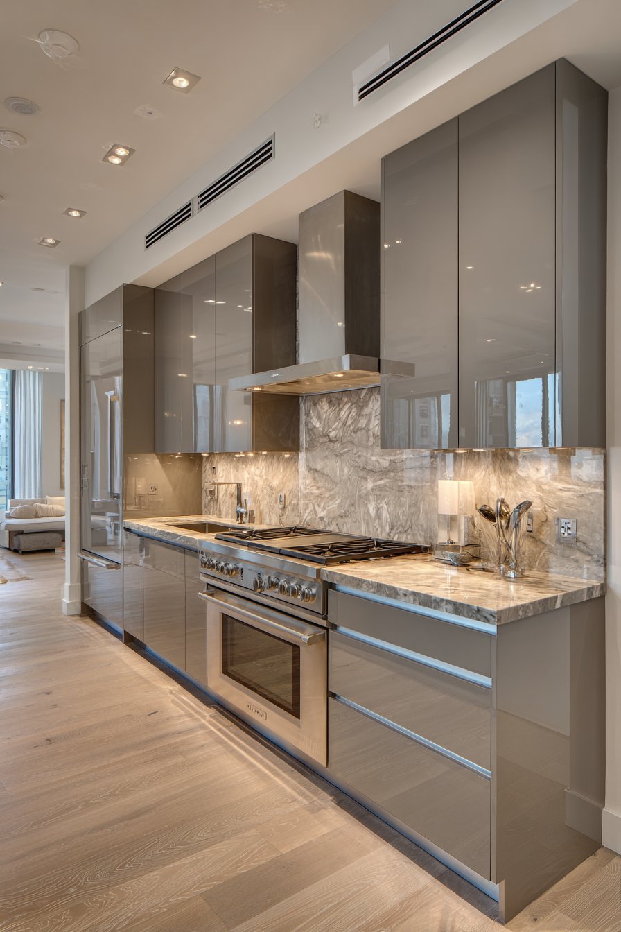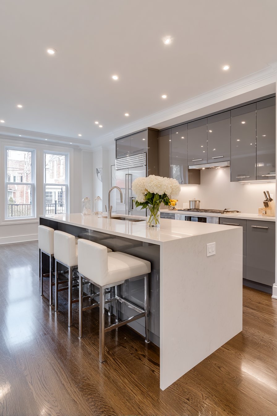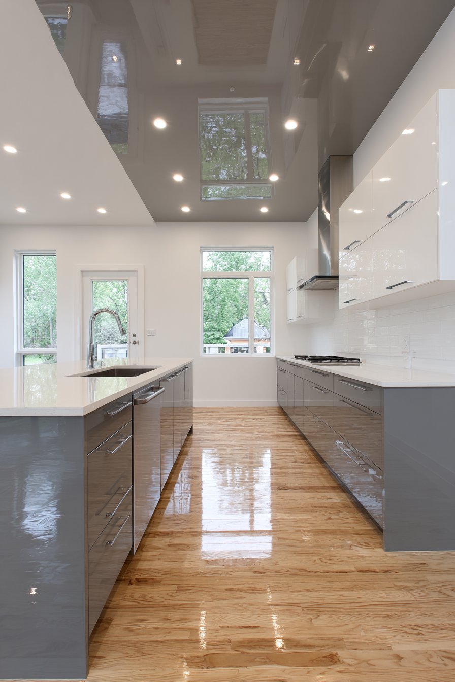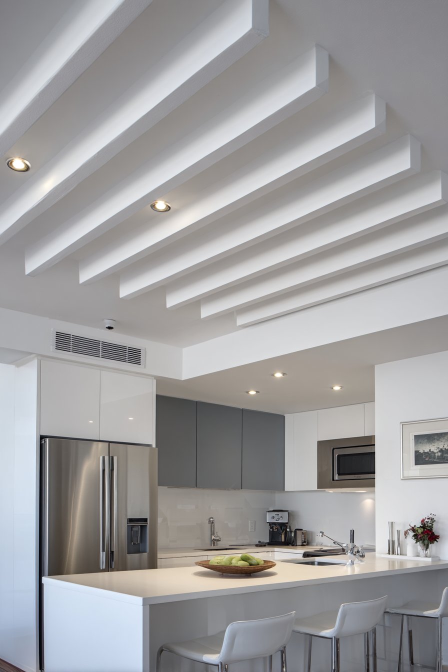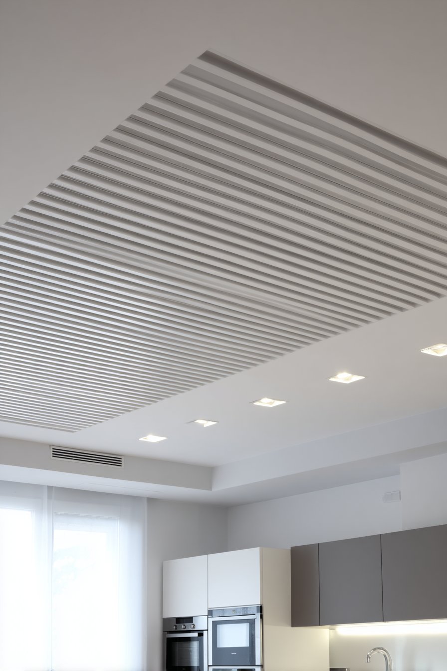 Building systems become design features when thoughtfully integrated, and continuous linear air diffusers transform HVAC components into architectural elements. This design features slim rectangular vents that run in parallel lines across the white ceiling, becoming part of the modern design language rather than apologetic interruptions. The flush-mounted diffusers deliver conditioned air throughout the space while their linear form creates rhythm and pattern. Recessed LED downlights alternate with the diffuser lines, creating a composed ceiling design where functional elements and lighting work together as a unified system. The contemporary kitchen with flat-panel grey and white cabinets echoes the ceiling’s emphasis on clean geometry and honest functionality.