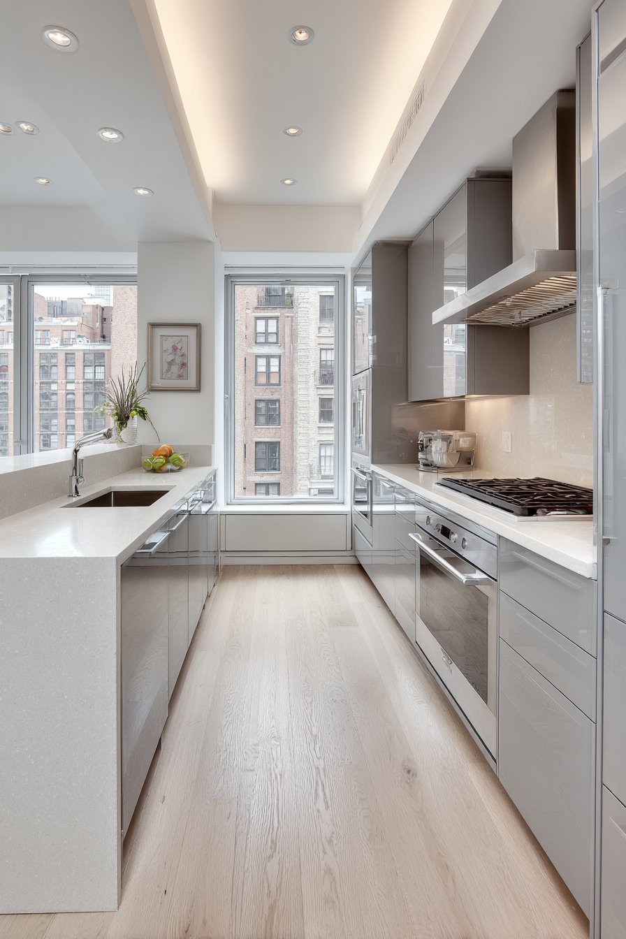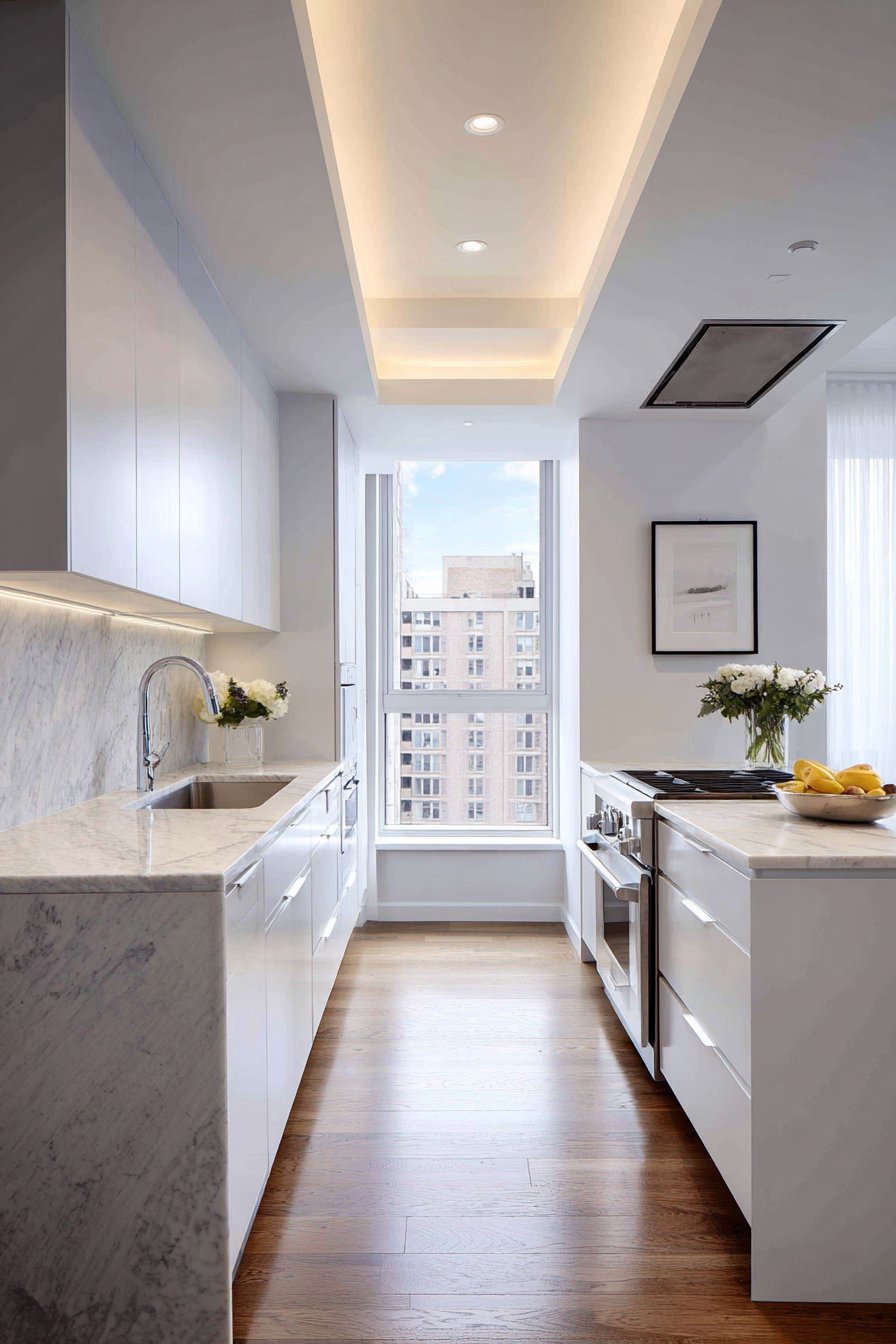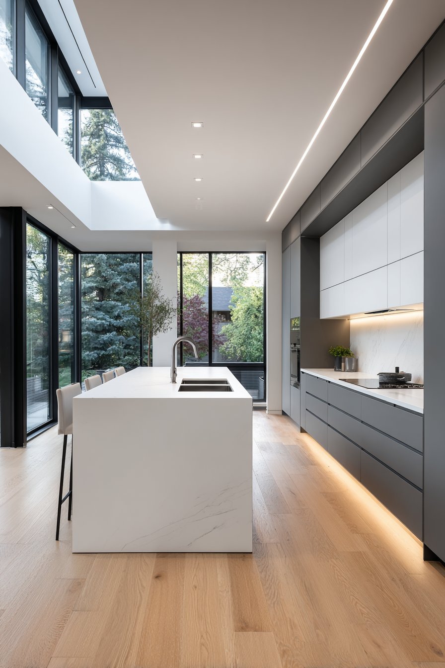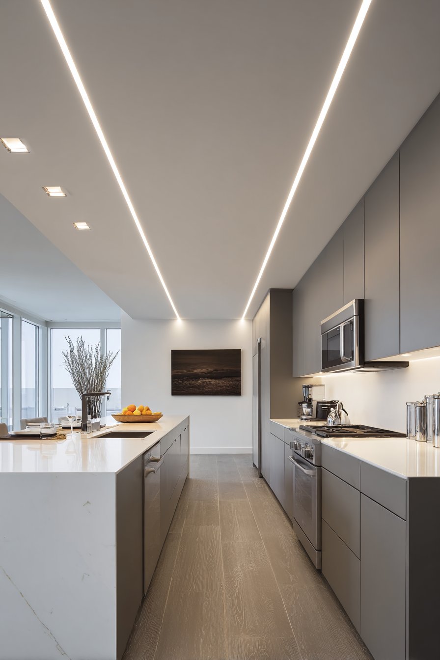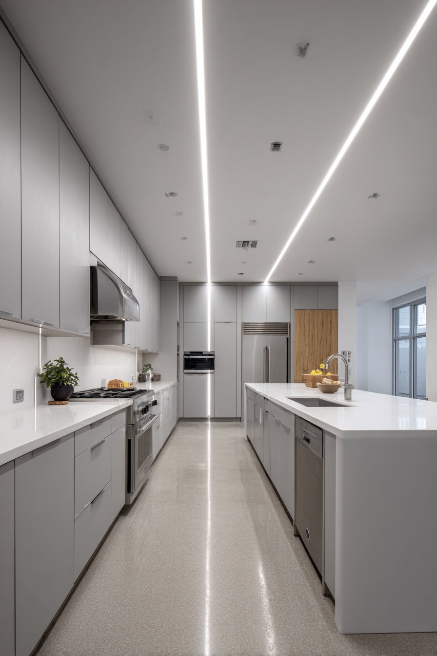 Clean, continuous lines define modern design, and a linear LED light channel creates a striking ceiling feature that emphasizes directional flow. This design features a smooth white ceiling with a recessed linear channel running the entire kitchen length, containing a continuous LED strip that creates a modern stripe of illumination. The minimalist gesture defines the space directionally while providing ambient lighting that complements additional small recessed spotlights positioned over work areas. This approach exemplifies how lighting can function as both utilitarian necessity and architectural element.