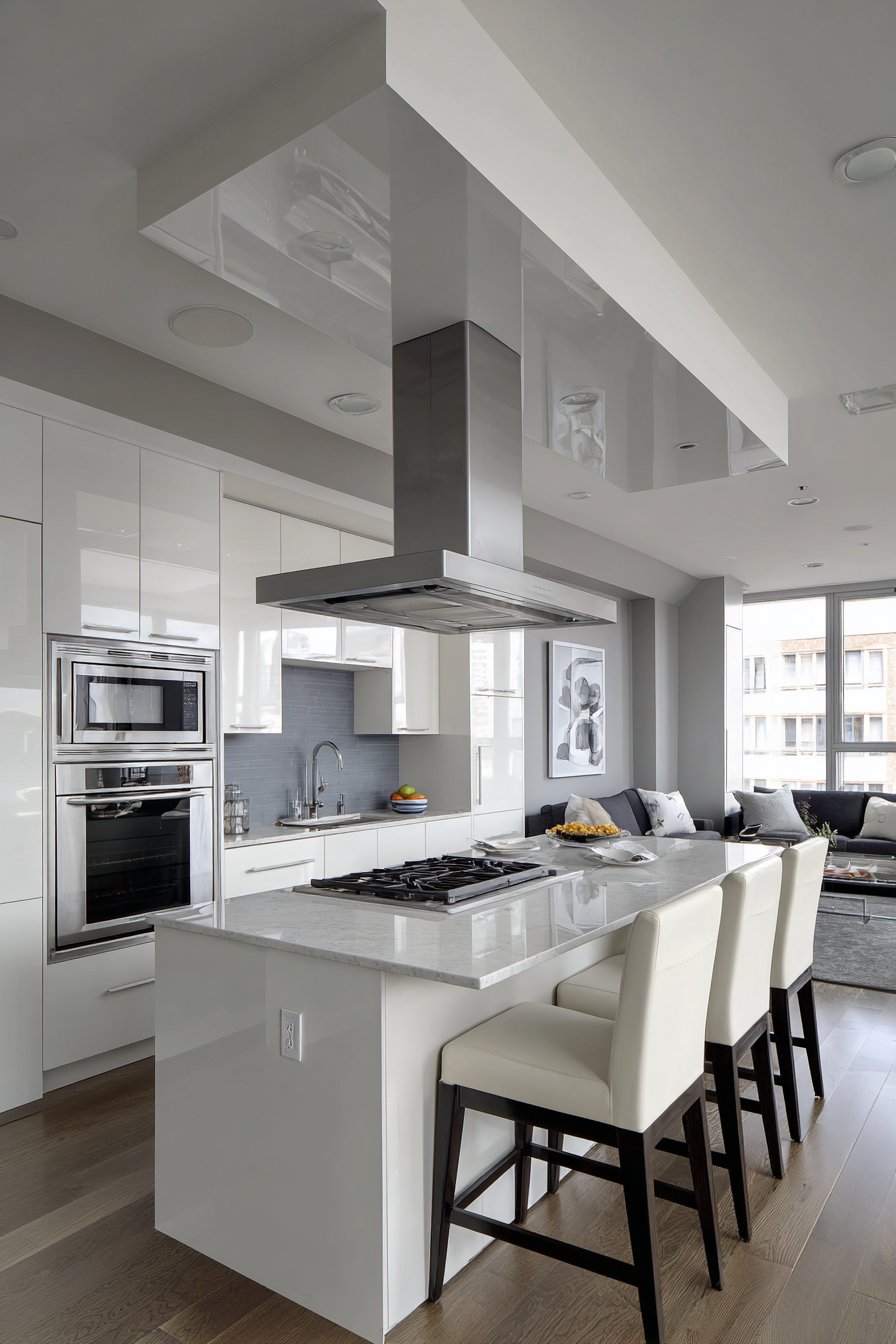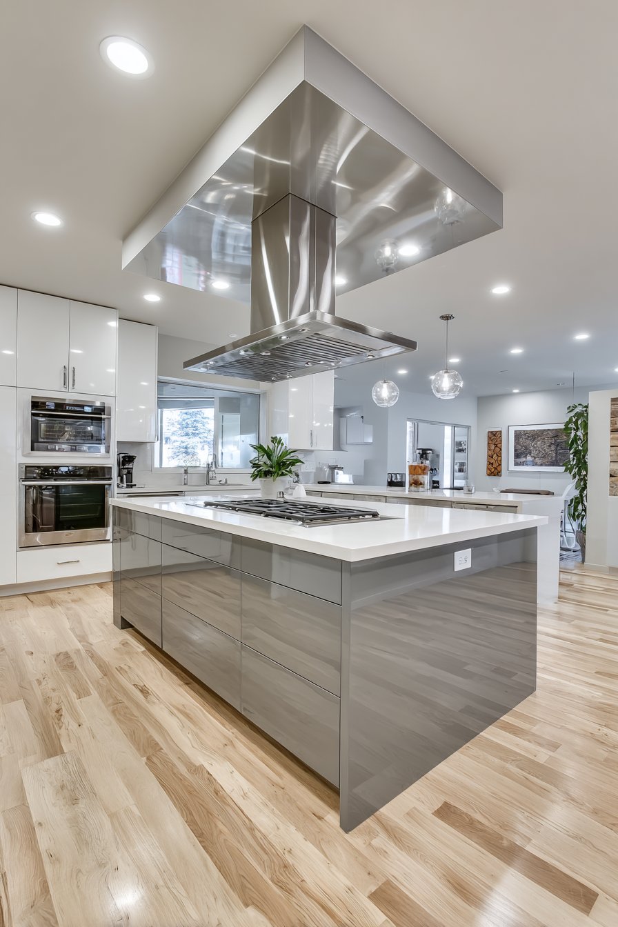 Functional equipment becomes design statement when treated as sculptural elements, and a ceiling-mounted range hood transforms a utilitarian appliance into a stunning focal point. This design features a sleek hood clad in brushed stainless steel suspended from the ceiling above the island cooktop, creating both a functional and visual centerpiece. The hood incorporates integrated LED lighting that illuminates the cooking surface while the metallic finish catches and reflects light throughout the kitchen. The flat white ceiling provides a simple backdrop with minimal additional recessed lights, allowing the hood to dominate as the primary ceiling feature.