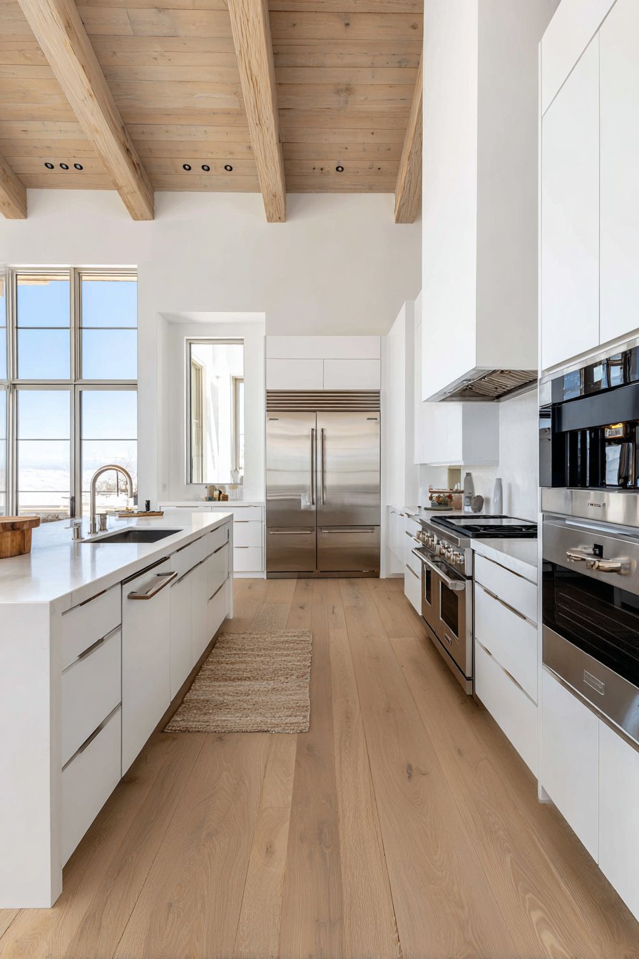 Natural wood brings organic warmth to modern kitchen design, and exposed beams in light oak finish create a stunning contemporary interpretation of this classic architectural element. Unlike traditional rustic beams that appear heavy and dark, these modern beams feature clean, straight lines and a natural light finish that complements rather than dominates the space. The beams run parallel across the ceiling in a linear arrangement, creating rhythm and directional flow while the white painted ceiling between them maintains brightness and openness.
