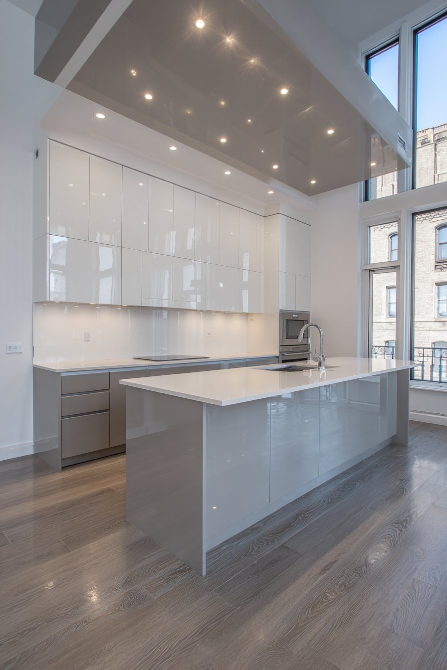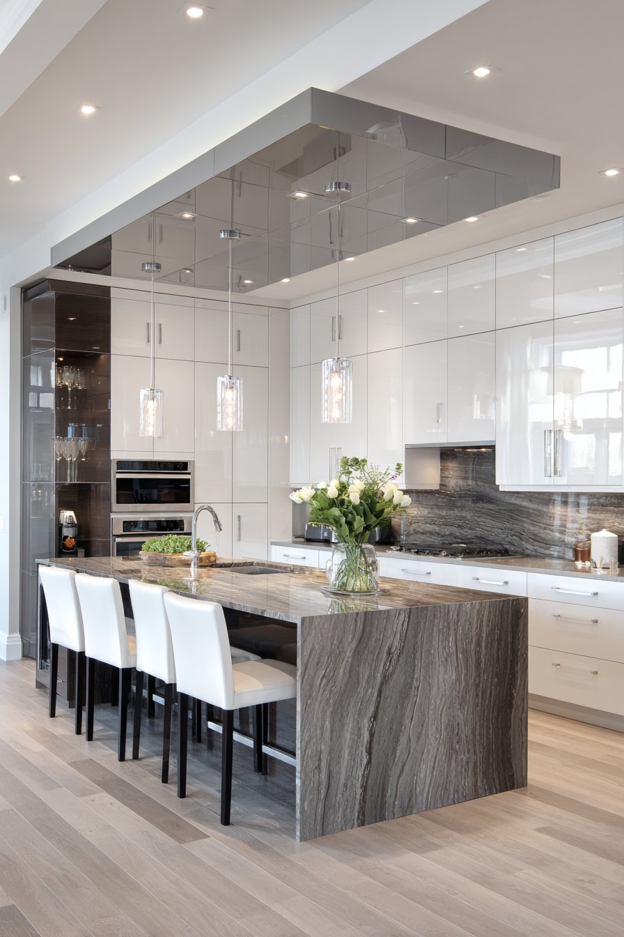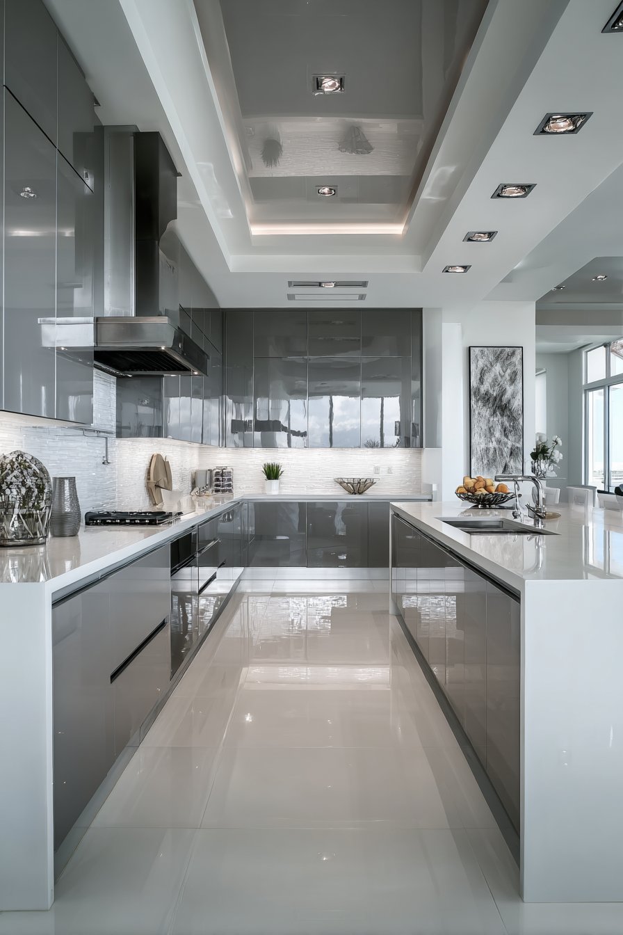Reflective surfaces expand space and multiply light, and mirrored ceiling panels create dramatic visual impact through reflection. This design features mirror panels installed over the island area, framed with thin brushed nickel channels in a geometric grid pattern. The surrounding white ceiling with recessed lighting maintains standard finished surfaces while the mirrored section doubles the visual impact of pendant lights and creates the illusion of increased ceiling height. The white and grey modern kitchen below benefits from the light multiplication and spatial expansion that reflection provides.