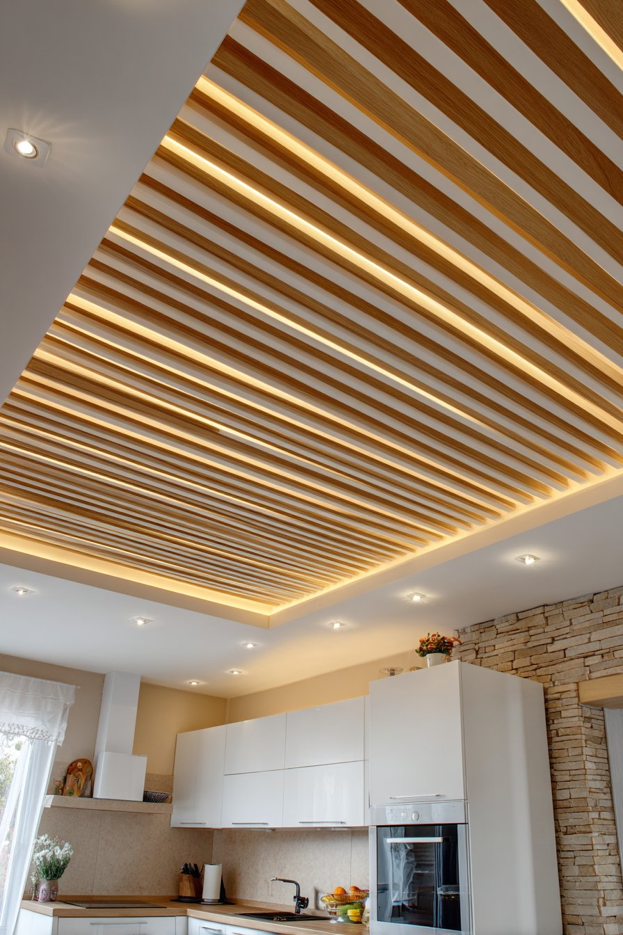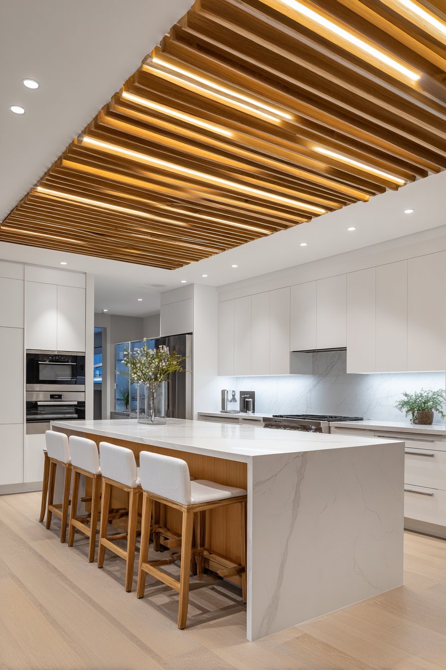 Layered lighting creates depth and atmosphere, and a wooden slat ceiling with integrated uplighting transforms natural material into a luminous feature. This design features parallel wood slats in light maple that create rhythmic pattern against a white ceiling backdrop, with gaps between slats allowing LED uplighting to create warm ambient glow. The linear slats run perpendicular to the kitchen length, emphasizing directional flow and spatial proportion. White modern cabinets and stone countertops provide refined contrast to the natural wood ceiling, creating balance between organic and manufactured elements.