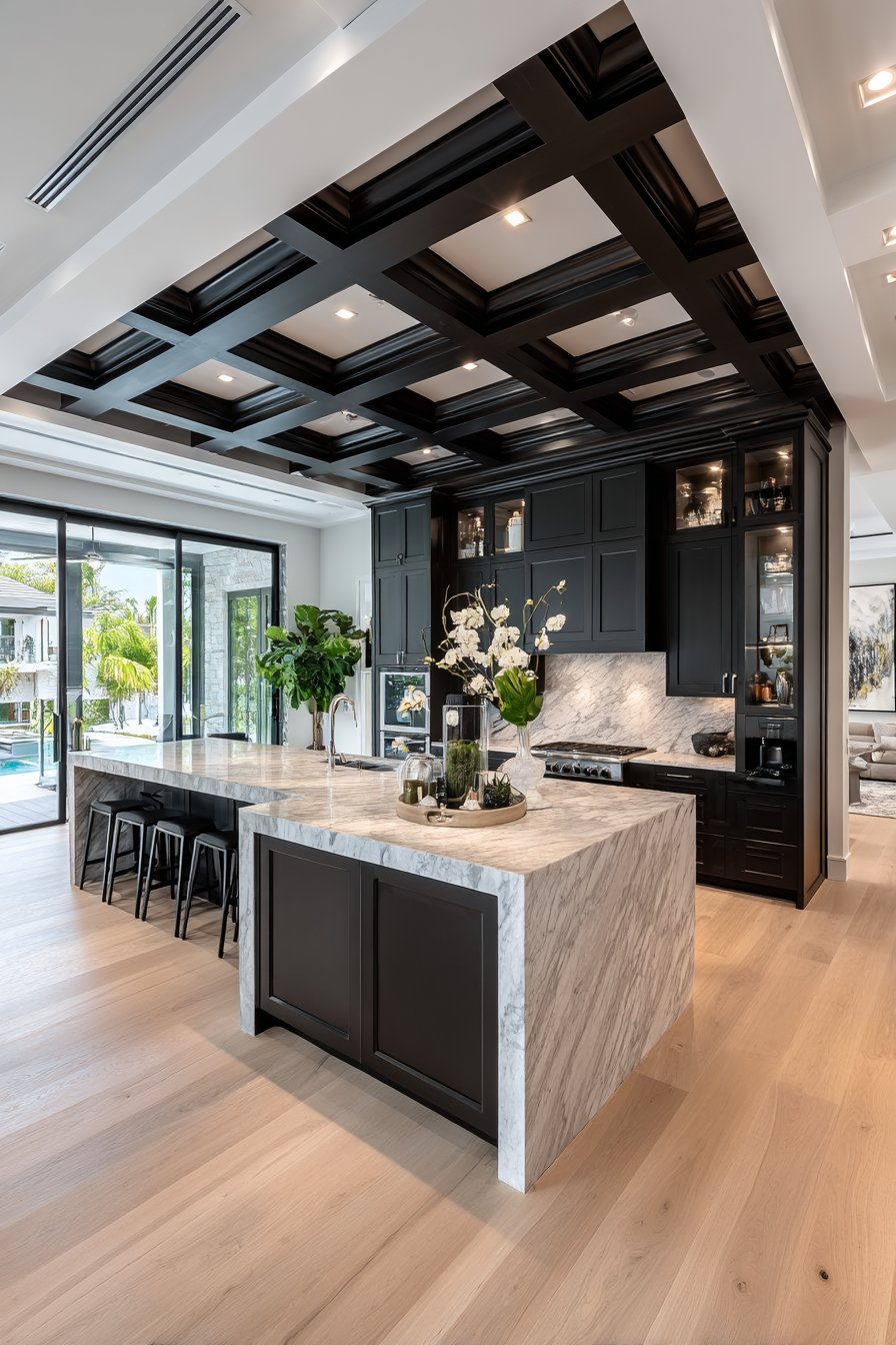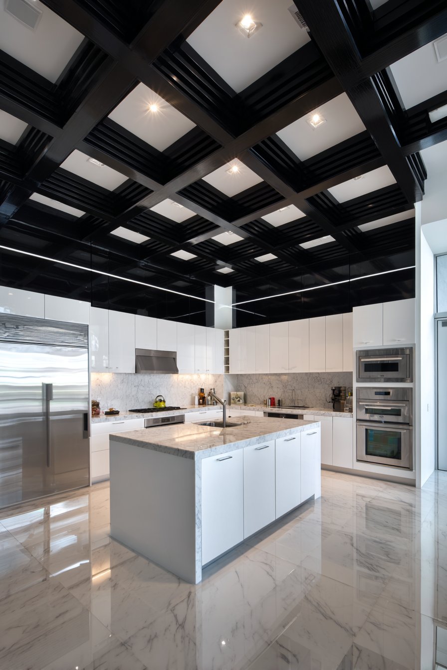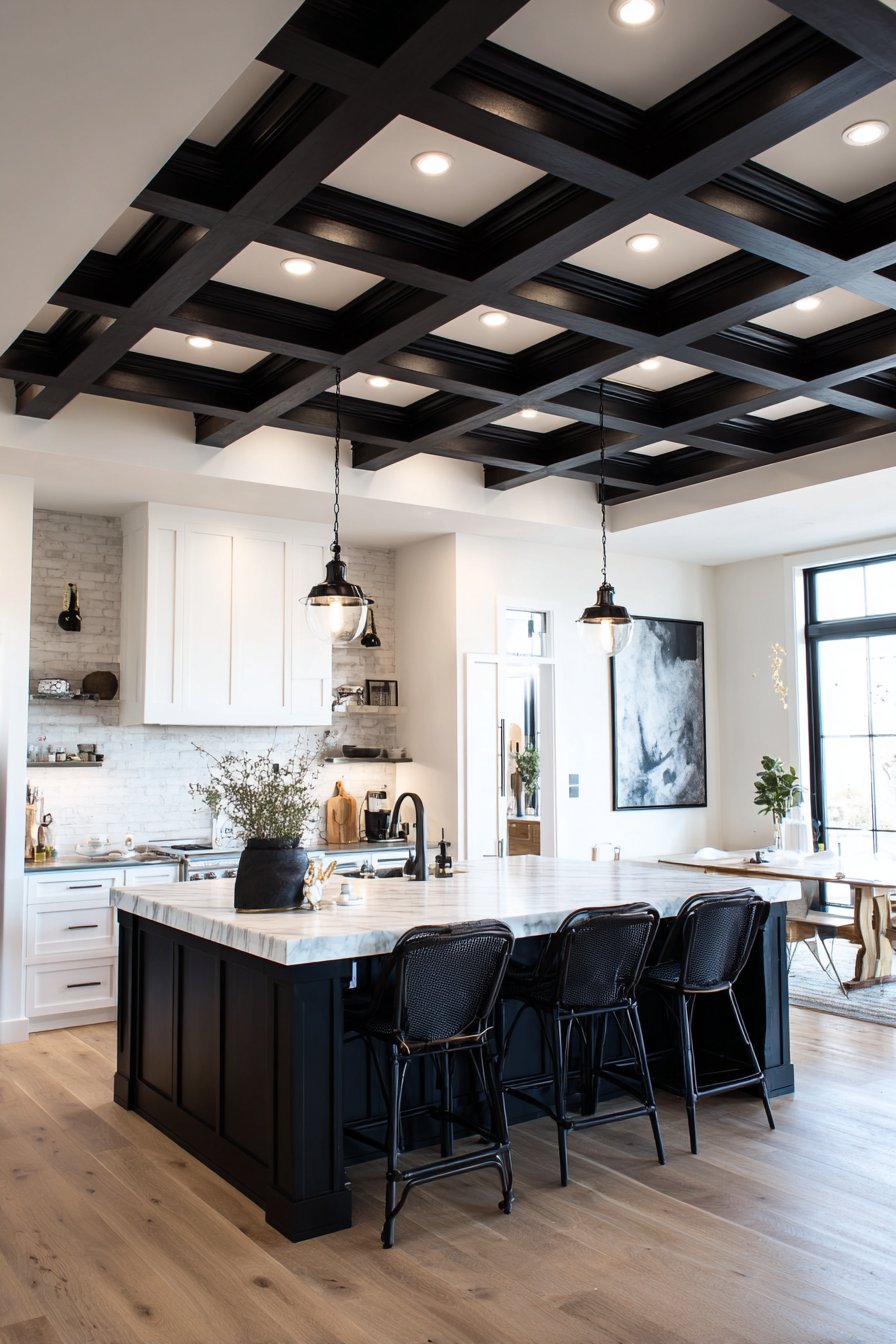 Bold and unexpected, the black coffered ceiling creates stunning visual drama in a modern kitchen. This design features a geometric grid pattern of matte black painted wood frames with recessed white panels, establishing a sophisticated contrast that immediately captures attention. The coffered structure adds architectural complexity and perceived height, while the black color scheme provides a contemporary twist on traditional coffered ceiling design. Minimal recessed lighting integrated into the white panels ensures adequate illumination without cluttering the striking geometric pattern.
