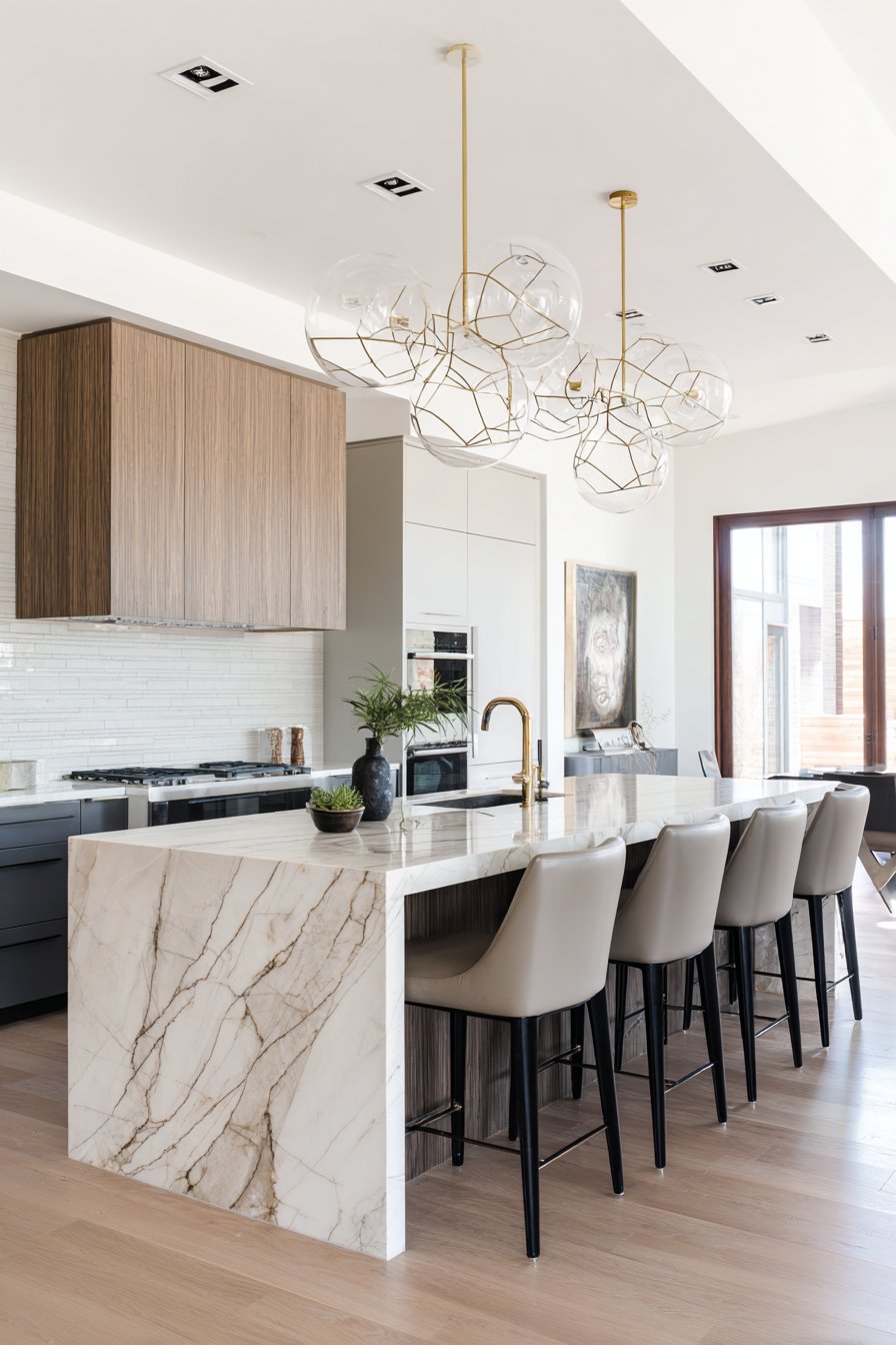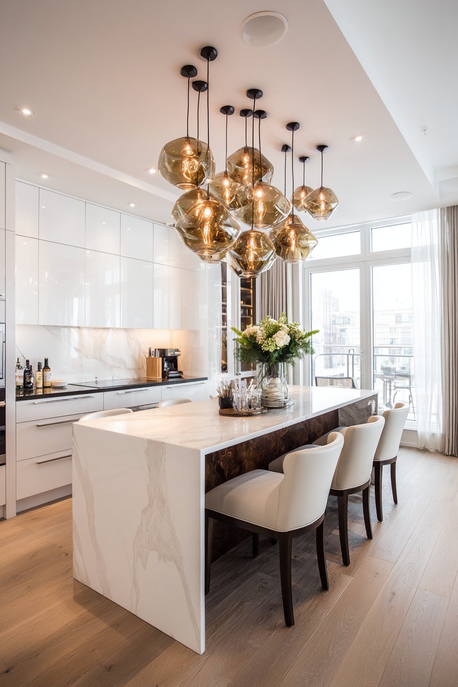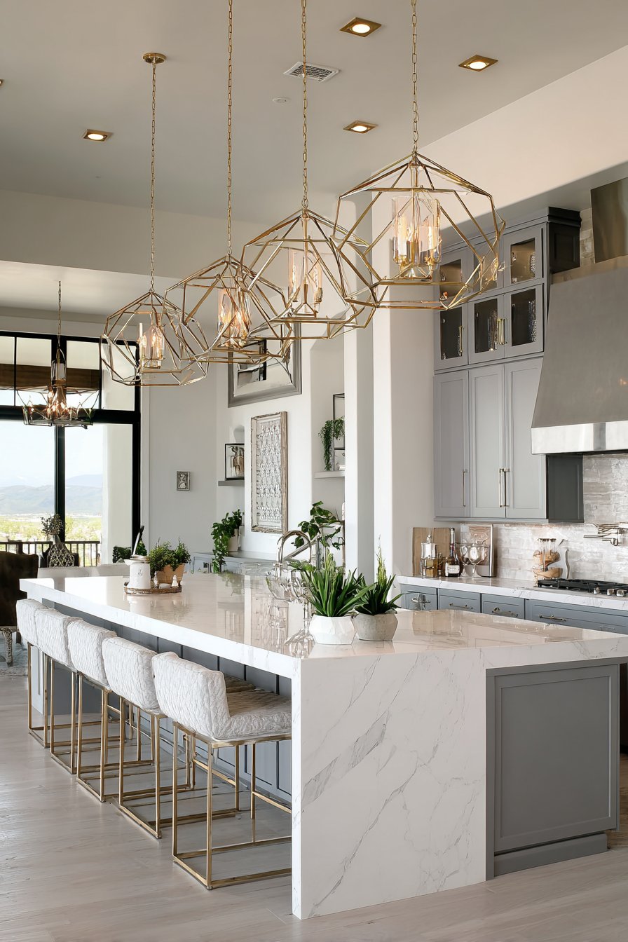Selecting the appropriate pendant cluster requires consideration of scale, style, and positioning. The cluster should contain three to five individual pendants of varying heights, creating visual interest through asymmetry while maintaining overall balance. The fixtures should hang at heights that provide adequate task lighting—typically twenty-eight to thirty-four inches above the island surface—while remaining well within the visual field to maximize their sculptural impact. The mixed material composition of gold metal and clear or smoked glass contributes textural variety that enlivens the monochromatic white and grey kitchen below.