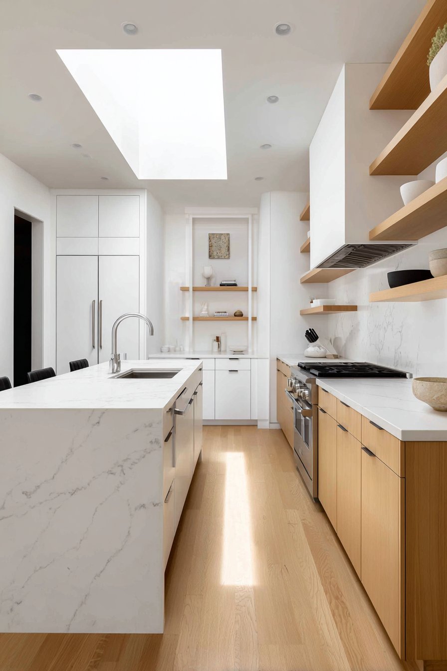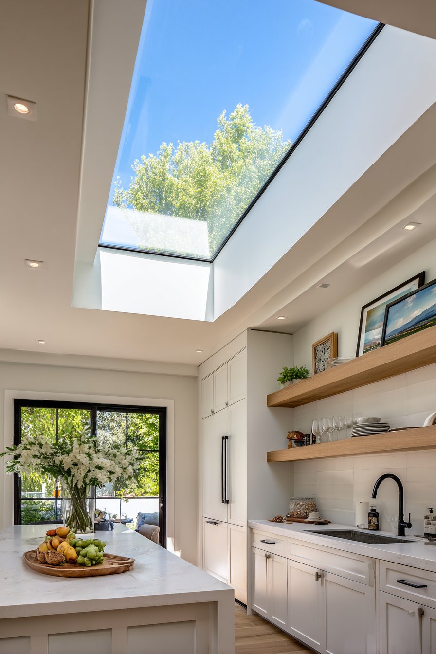 Natural light transforms kitchen environments, and a skylight installation represents one of the most impactful modern ceiling treatments. This design features a large rectangular skylight with minimal black frame detailing set into a flat white ceiling, creating a dramatic light well that floods the space with daylight. The skylight becomes a portal to the sky, introducing ever-changing natural light quality throughout the day and establishing a connection between interior and exterior environments. Supplemental recessed lighting strategically placed around the skylight provides evening illumination when natural light fades.