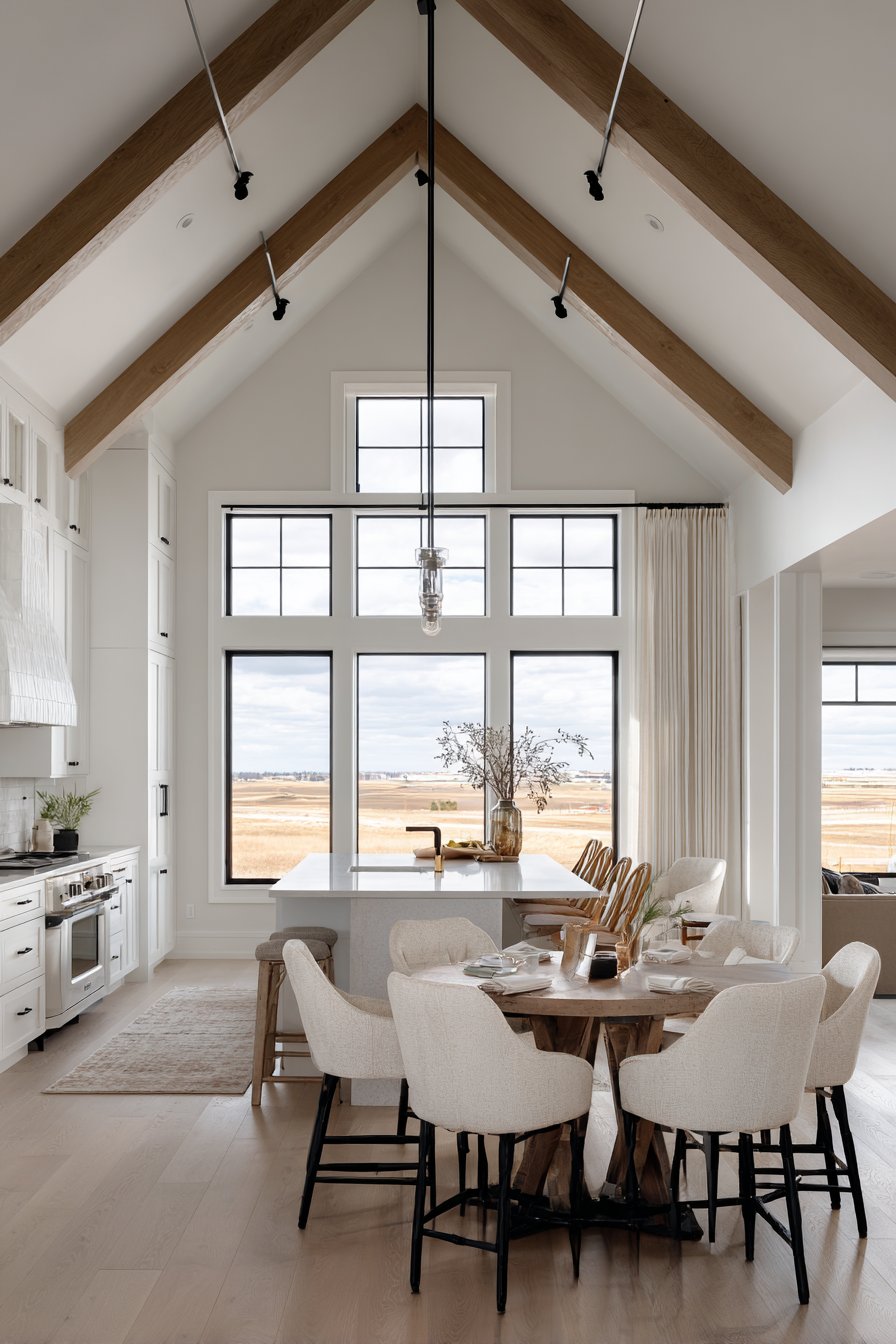 • Echo the black beam color in cabinet hardware, light fixtures, and island seating for design cohesion