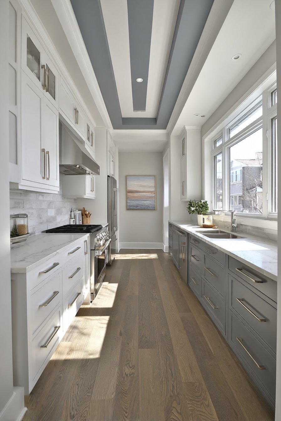 This ceiling treatment works best in kitchens with ceiling heights of nine feet or higher, allowing sufficient space for the soffit drop without creating oppressive lowered ceiling sections. The soffit typically drops twelve to eighteen inches below the main ceiling plane, measuring eighteen to twenty-four inches in depth to align with standard upper cabinet dimensions. The grey color choice should match cabinetry exactly, appearing as a continuation of the cabinet form rather than a separate architectural element.