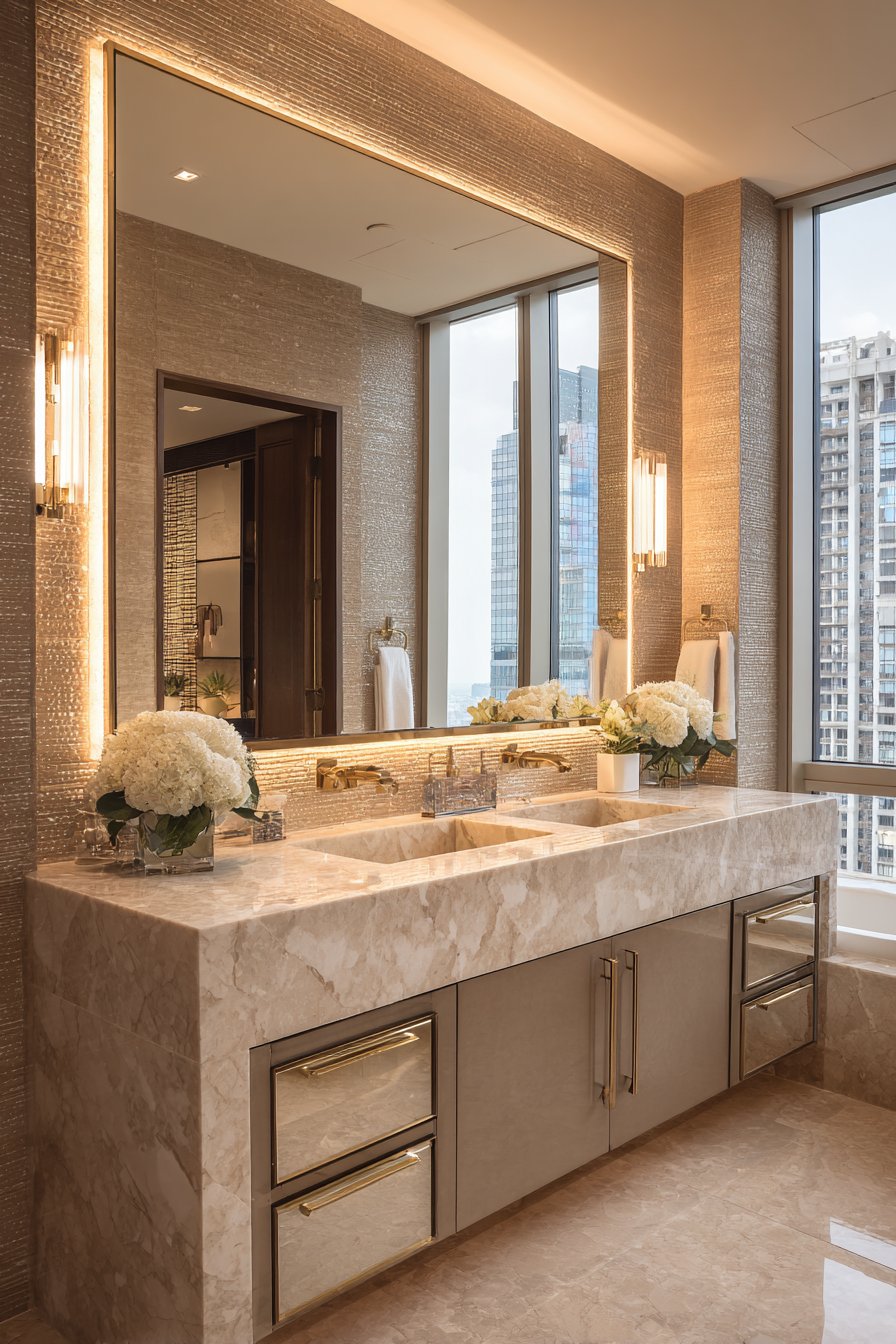 Symmetry and luxury converge in this elegant large bathroom mirror idea featuring twin oversized mirrors, each measuring approximately four feet wide, mounted above a double vanity configuration. The thin gold metal frames provide just enough definition to distinguish each mirror as an individual element while remaining refined enough to feel sophisticated rather than ornate. Between these substantial mirrors, a narrow vertical strip of marble tile extends from countertop to ceiling, serving as both practical divider and architectural detail. Elegant wall sconces positioned on this central strip provide balanced, symmetrical lighting that flatters without creating harsh shadows.