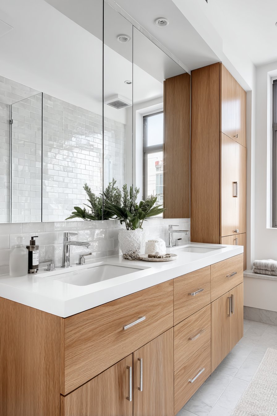 Key Design Tips: Work with experienced mirror installers who have expertise in corner mitering—this is not a DIY project. Ensure both walls meeting at the corner are perfectly plumb for proper mirror alignment. Consider the corner junction’s visibility from different angles and plan the miter accordingly. Coordinate lighting to illuminate both vanity areas evenly without creating hot spots. Select waterfall-edge countertops in materials that complement the mirror’s contemporary aesthetic. Verify that the corner configuration allows comfortable use of both vanities simultaneously. Include adequate storage solutions since corner areas can be challenging to access.