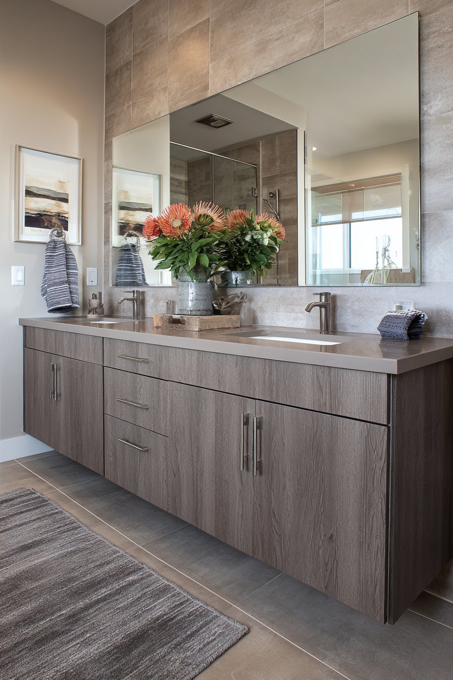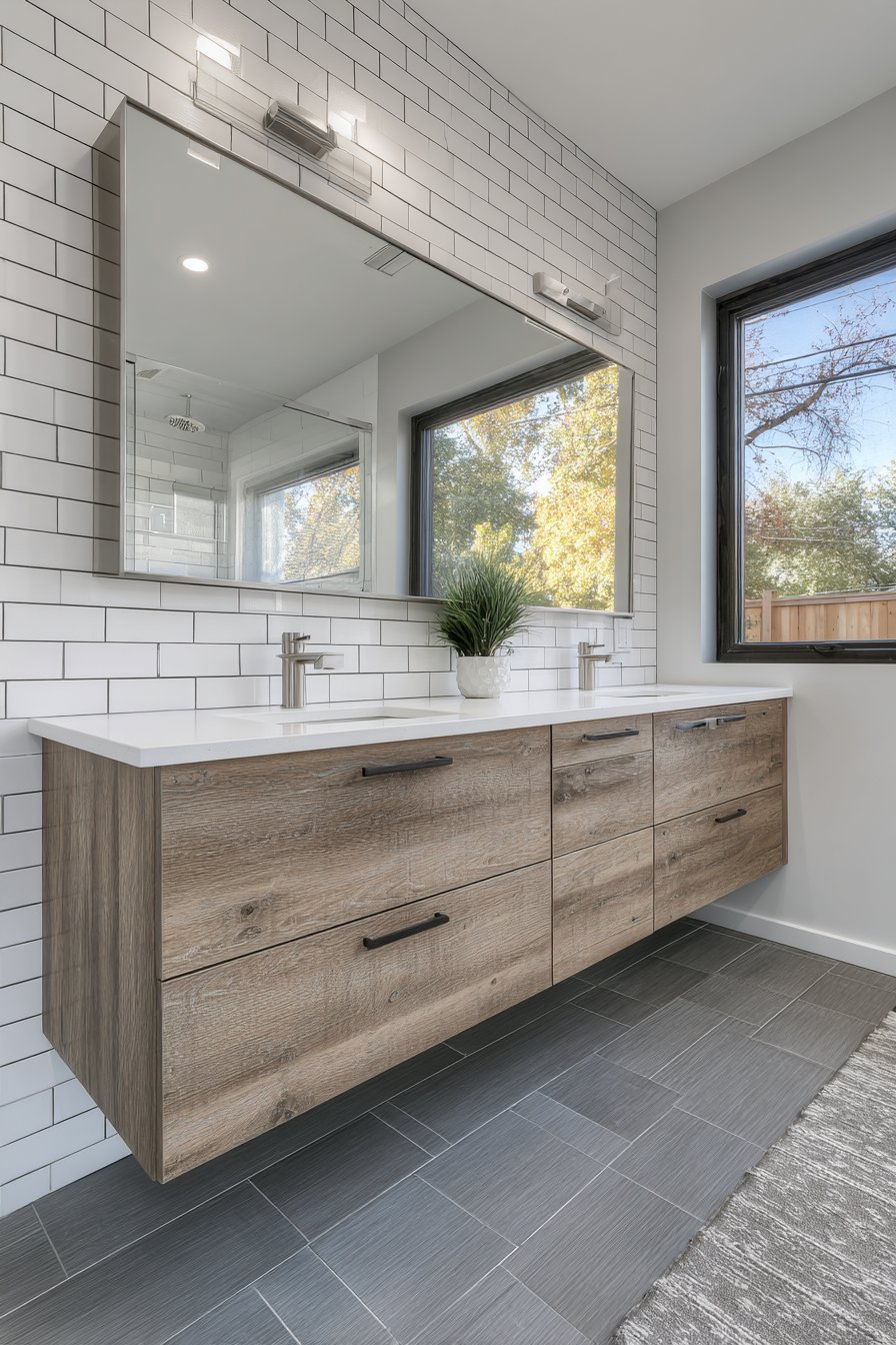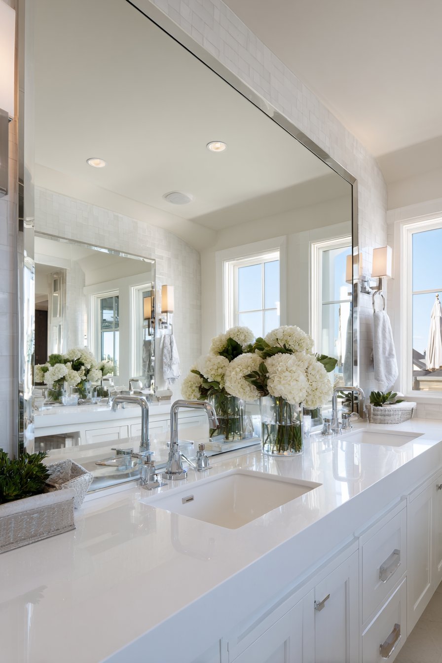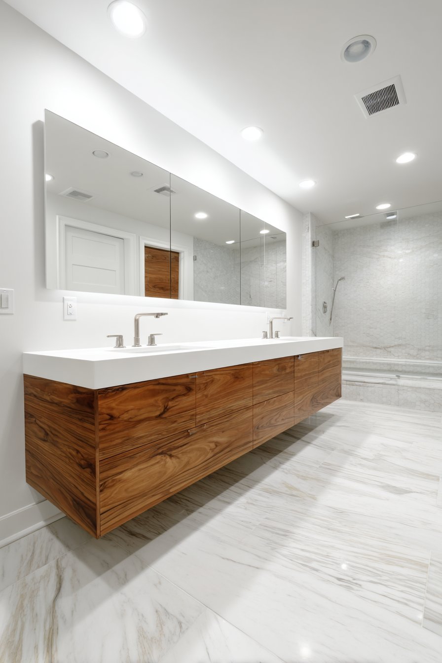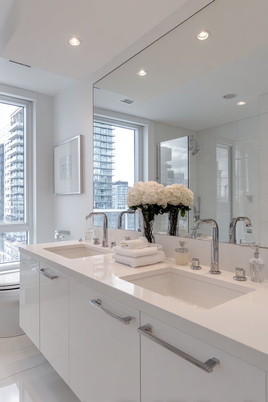 Wide-angle interior photography demonstrating the innovative corner mirror solution and its spatial expansion effect reveals the sophisticated planning required to execute this design successfully. Every element must be carefully coordinated—the vanity placement, countertop configuration, lighting position, and mirror dimensions all work together to create cohesive results. This large bathroom mirror idea particularly suits contemporary bathrooms with clean lines, shared master bathrooms requiring dual vanities, and any space where innovative space planning is necessary to maximize functionality within available square footage.
