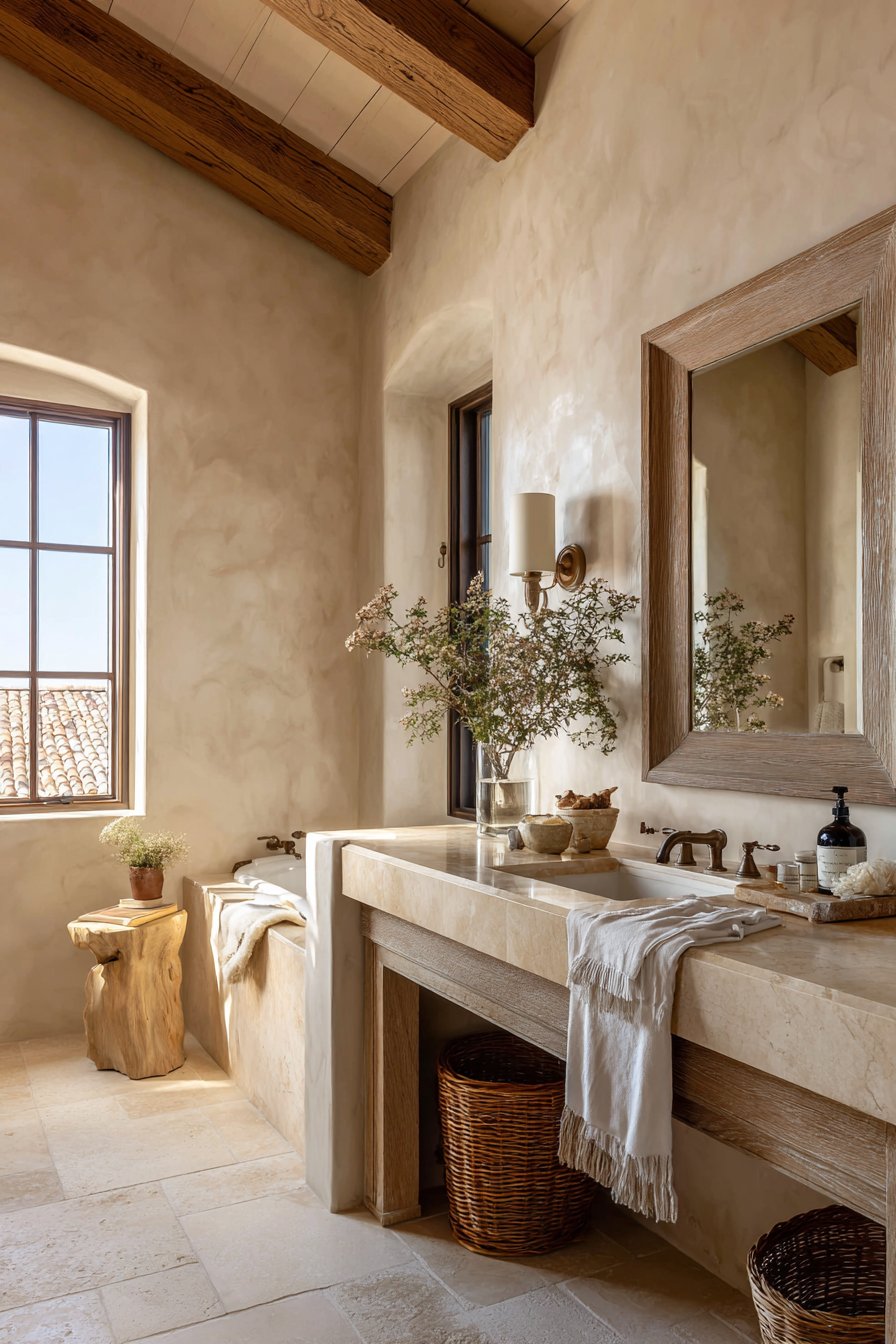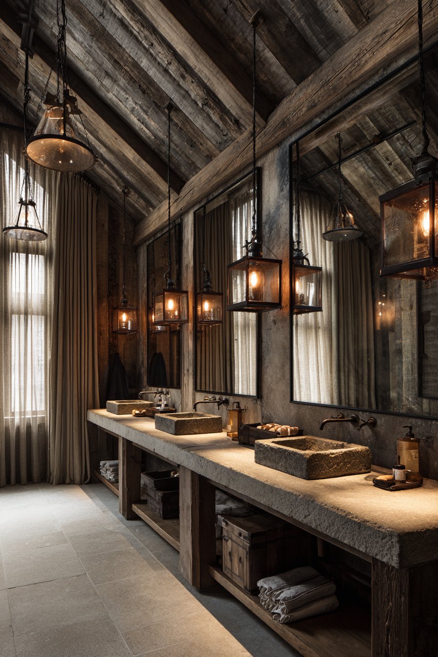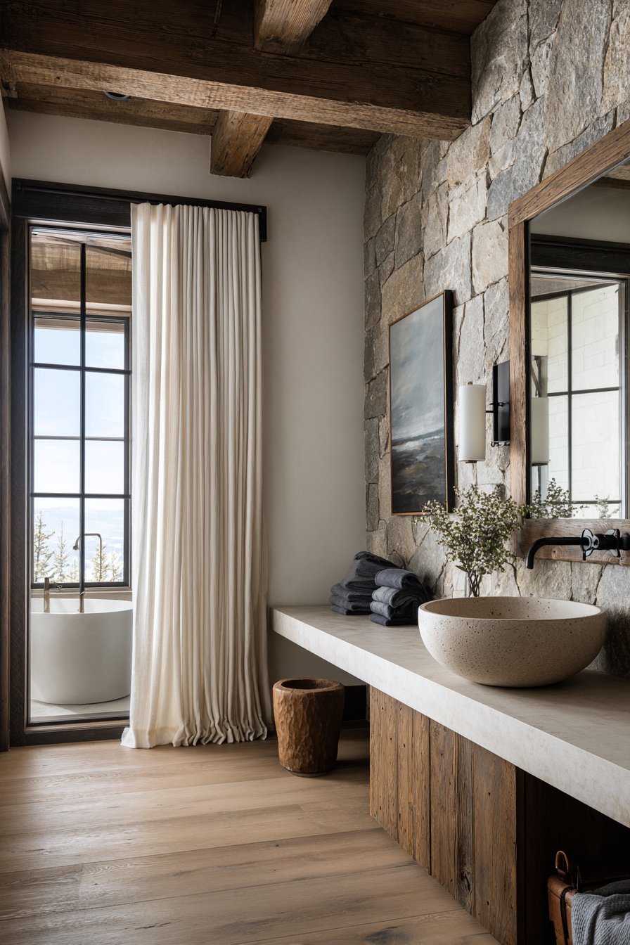The beauty of antiqued mirrors lies in their imperfection—the slightly mottled reflection, the irregular edges of the silvering, and the sense that this mirror has witnessed decades of daily rituals before finding its current home. These characteristics add soul and depth impossible to achieve with brand-new materials. Natural light filtering through sheer curtains highlights the mirror’s vintage character, catching on the reclaimed wood’s varied textures and emphasizing the organic irregularities in the mirror’s surface. This creates a bathroom environment that feels collected rather than decorated, as if each element was thoughtfully acquired over time rather than purchased in a single shopping trip.