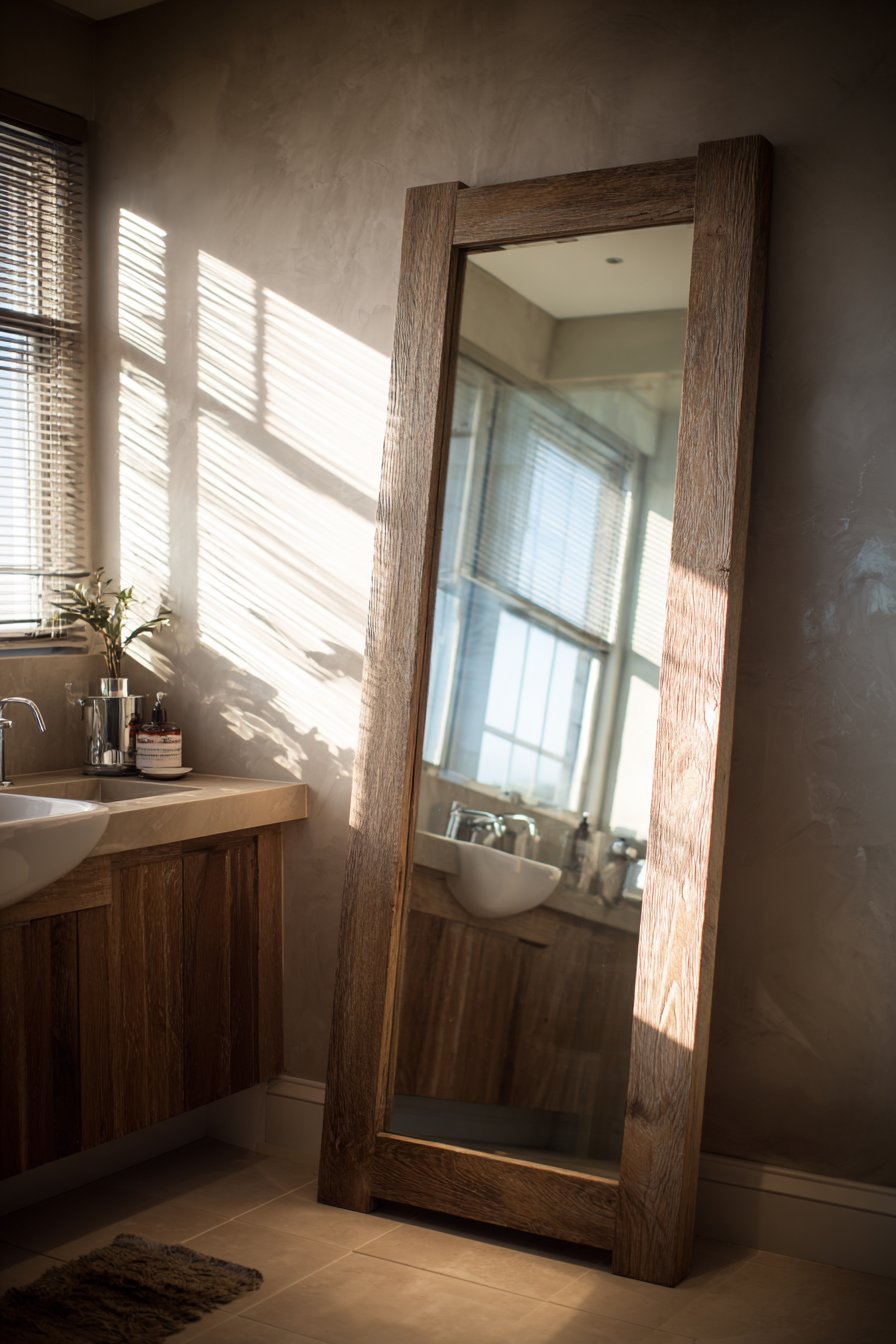 The casual elegance this design creates works beautifully in master bathrooms, powder rooms serving as transitional spaces, and any bathroom where the goal is creating a relaxed, residential feel rather than hotel-like perfection. Professional interior photography highlighting the casual elegance and practical versatility captures what makes this large bathroom mirror idea special—it’s approachable luxury, sophisticated without being precious. The weathered oak frame adds warmth and texture that prevents the mirror from feeling cold or impersonal, while the leaning position creates dynamic diagonal lines that add visual interest to typically orthogonal bathroom spaces.