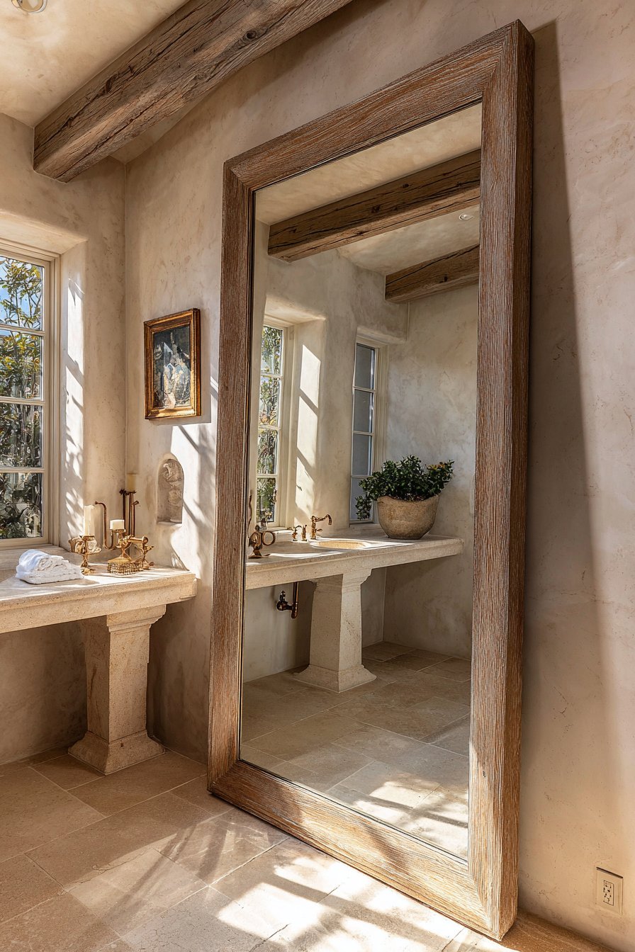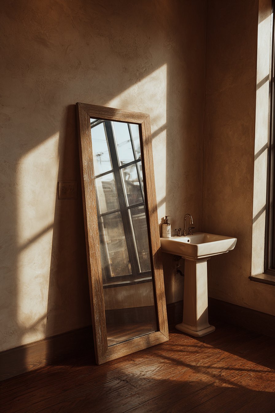 Breaking from the traditional approach of wall-mounted mirrors, this relaxed large bathroom mirror idea features an oversized leaning floor mirror with a substantial frame crafted from weathered oak. The mirror leans casually against the wall at a slight angle beside a classic pedestal sink, reaching approximately eight feet in height and creating unexpected vertical emphasis. The weathered oak frame shows authentic aging characteristics—subtle color variations, gentle wear patterns, and the kind of patina that only develops over time. Soft natural light from a nearby window creates gentle shadows on the textured plaster walls, emphasizing the room’s organic, unhurried character.