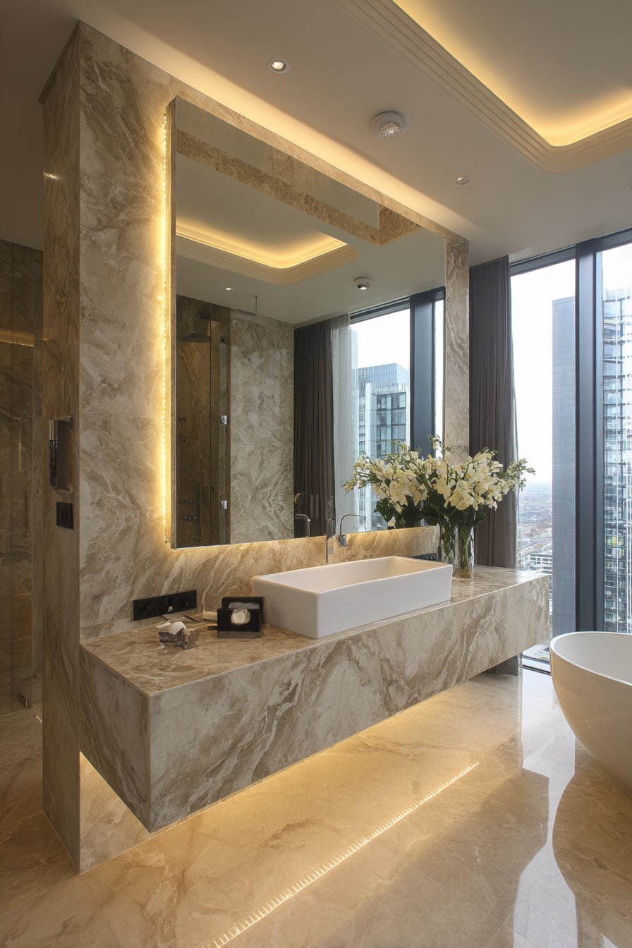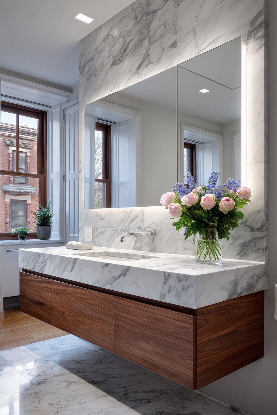 Marble’s inherent luxury and timeless appeal make it an ideal backdrop for statement mirrors, and when installed in vertical orientation, it emphasizes ceiling height while creating a gallery-like sophistication. The veining patterns within the marble become part of the overall composition, visible in fragments through the mirror’s reflection and creating layers of visual interest. This large bathroom mirror idea works particularly well in contemporary bathrooms with neutral color palettes, where the mirror and feature wall can serve as the primary sources of visual drama. The brass fixtures add warmth that prevents the space from feeling cold despite the predominance of stone and glass.